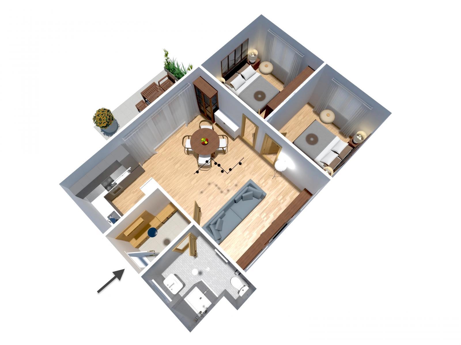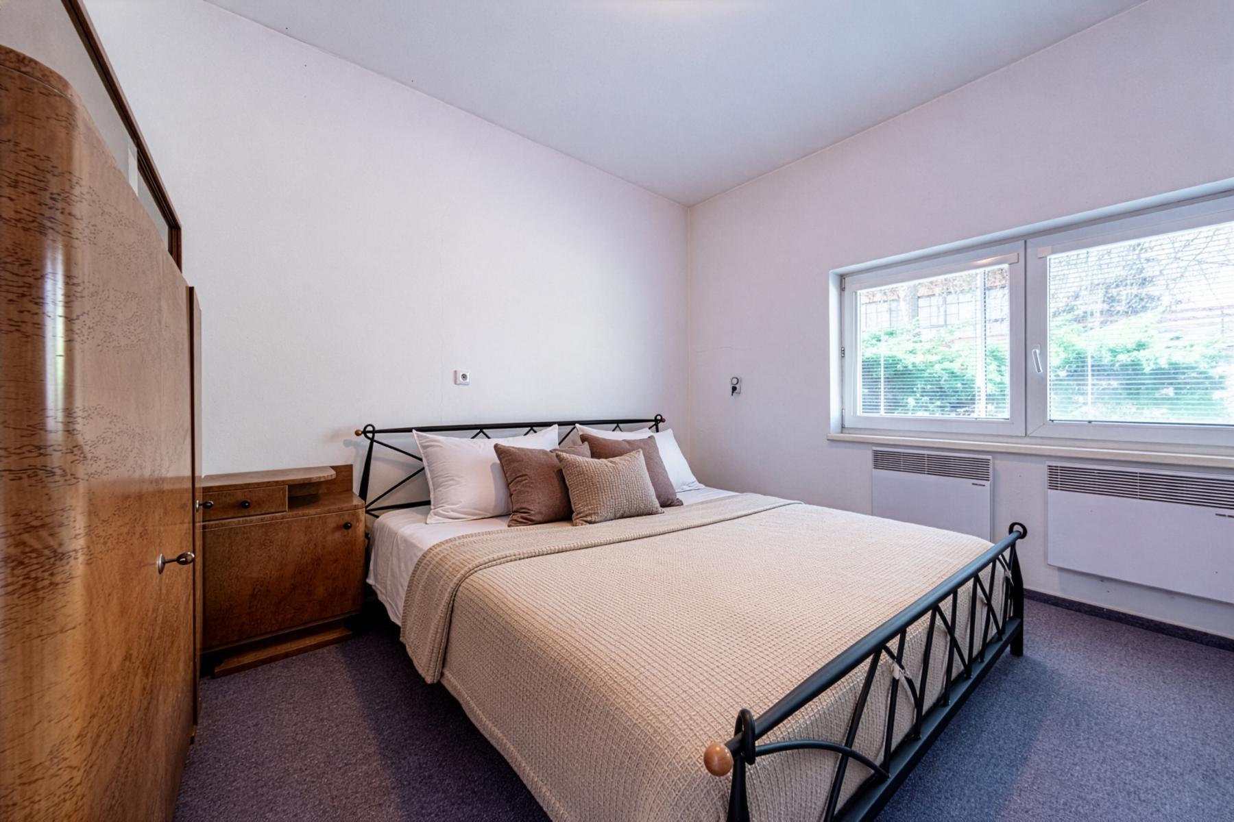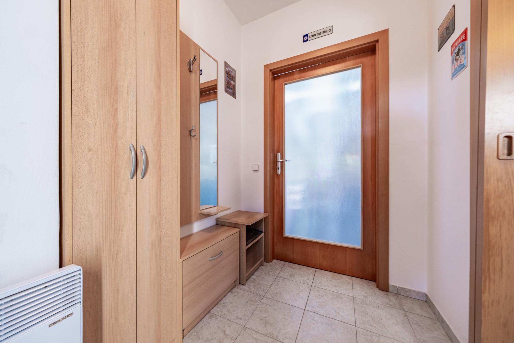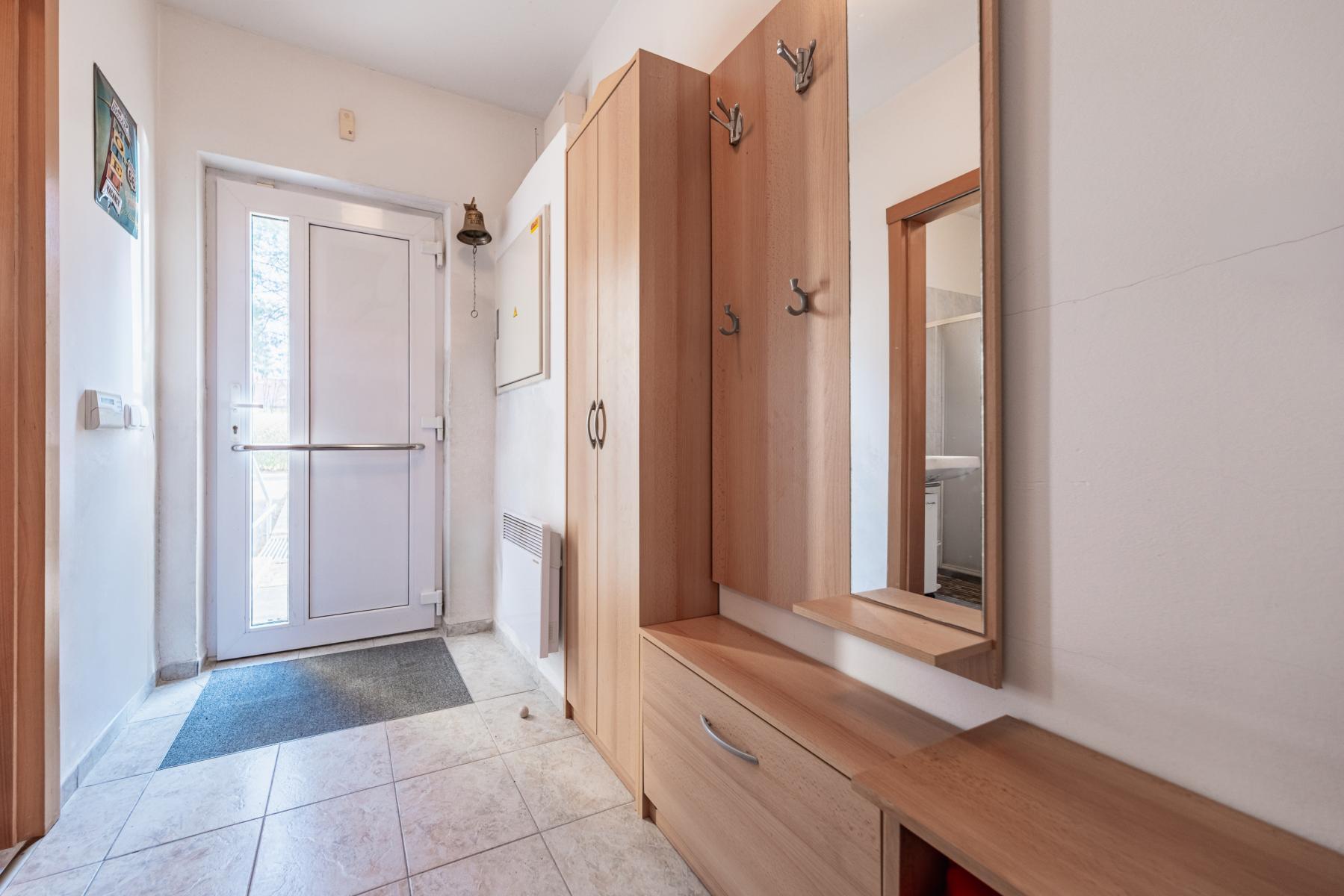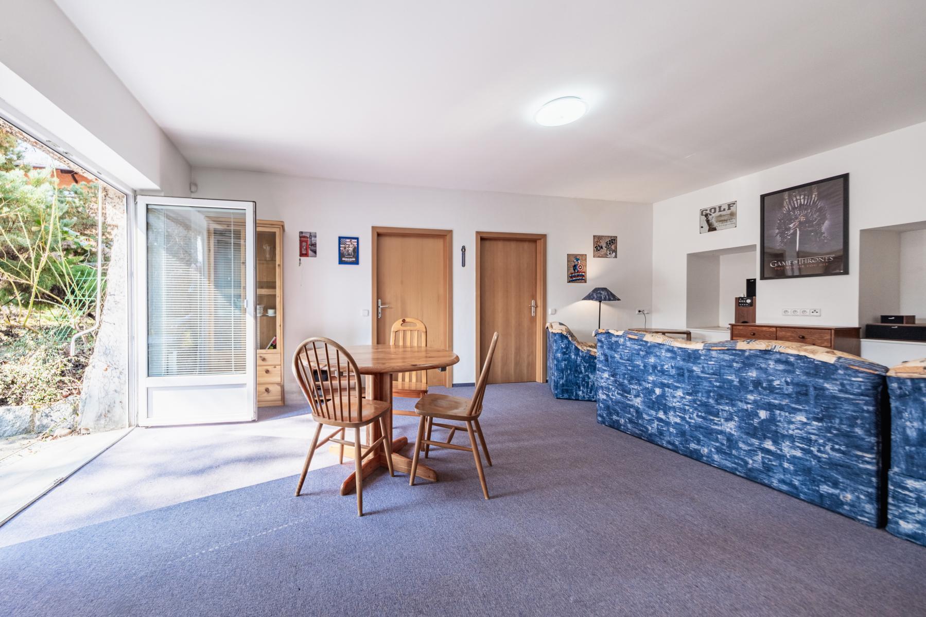 Byt je velmi dobře dispozičně řešen, prostorný obývací pokoj s kuchyňským koutem s přímým výhledem do zahrady o velikosti 24,79 m and sup2;, pokoj 10.10 m and sup2;, pokoj 11 m and sup2;, koupelna a WC 4,70 m and sup2;, předsíň 3,44 m and sup2;. Vybavení bytu je součástí kupní ceny. Celý objekt je oplocen, na rozlehlé zahradě se nachází venkovní posezení s grilem pouze pro obyvatele domu.