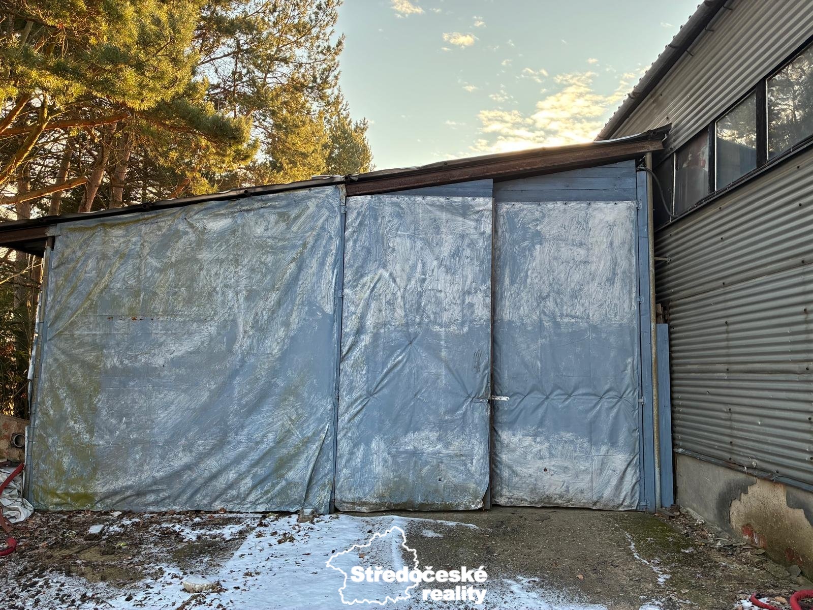 Venku jsou k dispozici přístřešky z obou delších stran budovy - 270 a 216 m2.