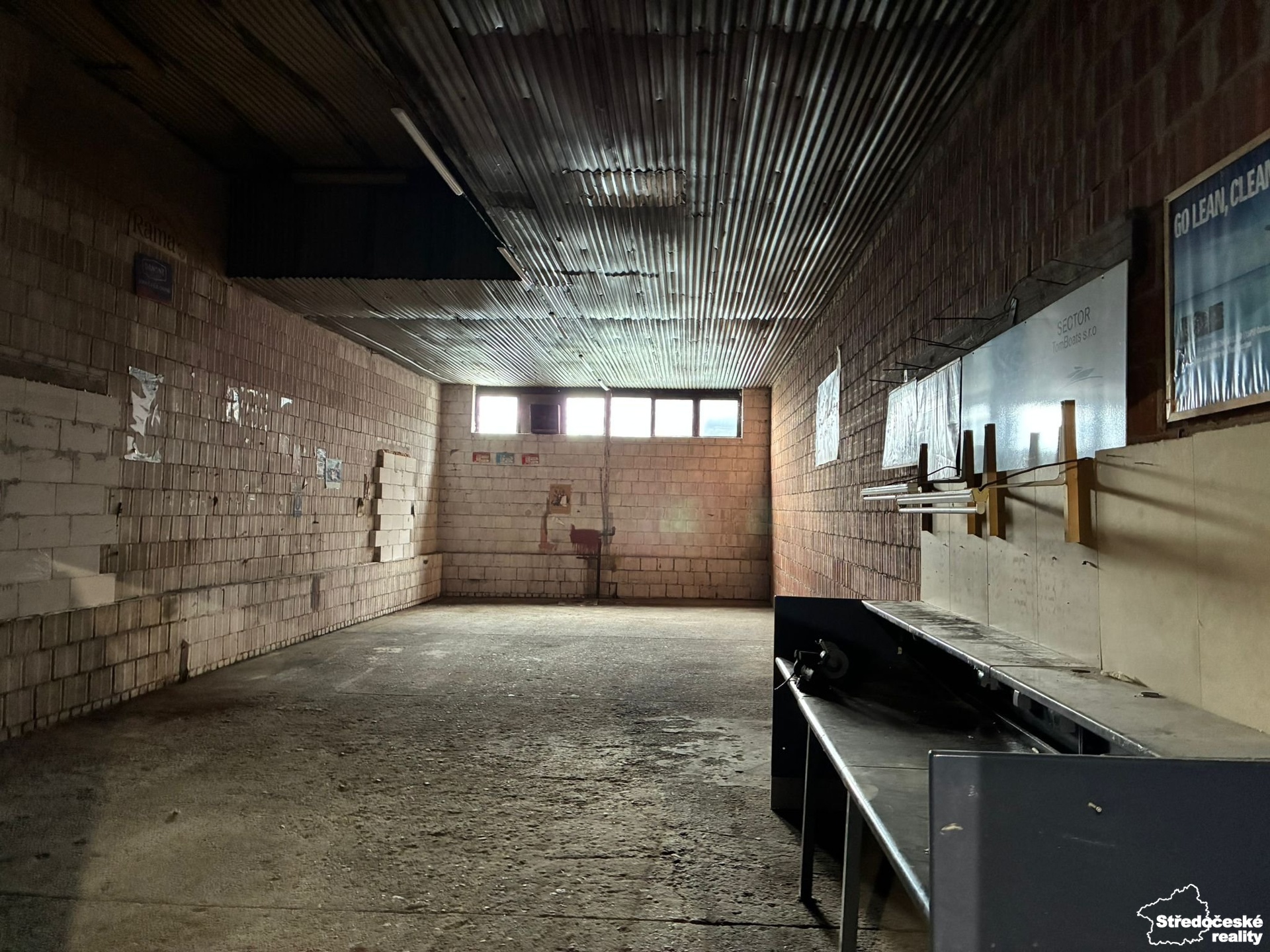 Hala je rozdělená na několik částí - dva hlavní prostory jsou o velikosti 472 m2 a 576 m2 (zde je k dispozici zakrytá jáma)