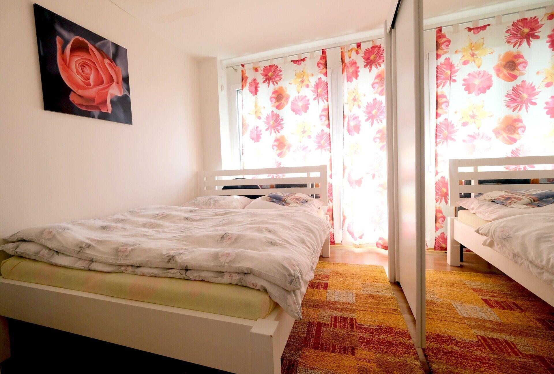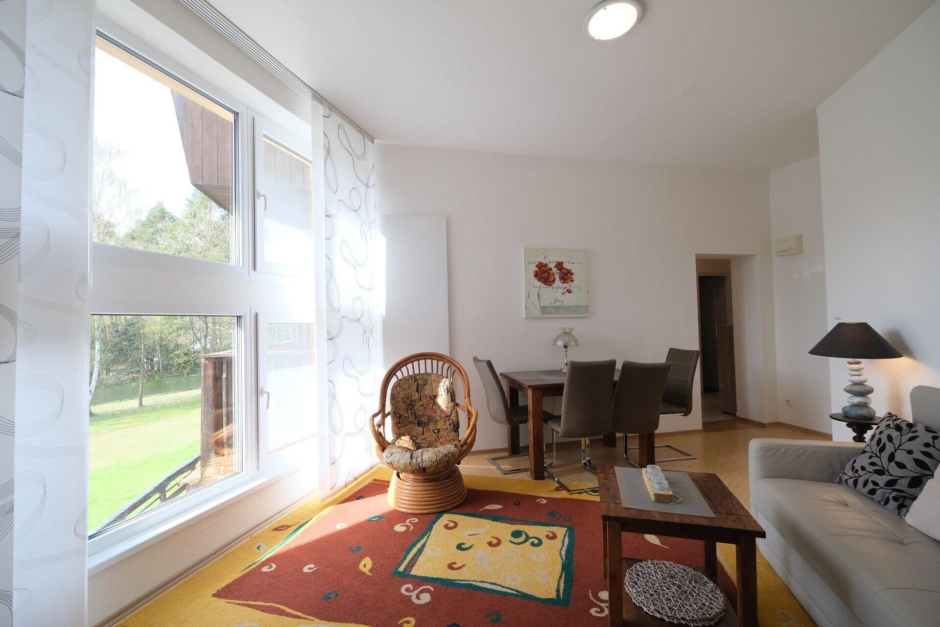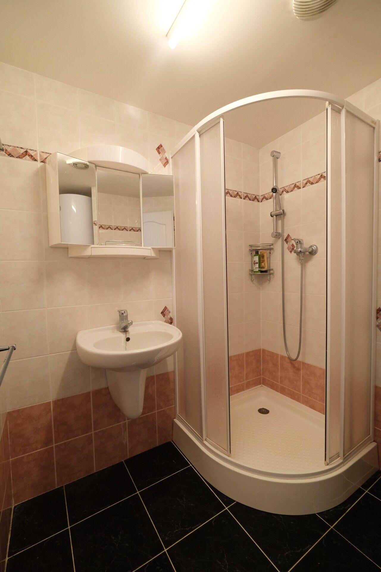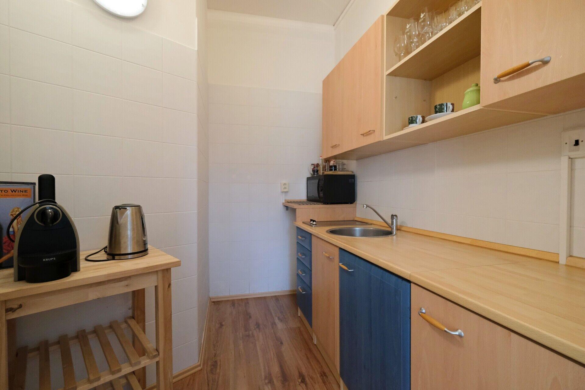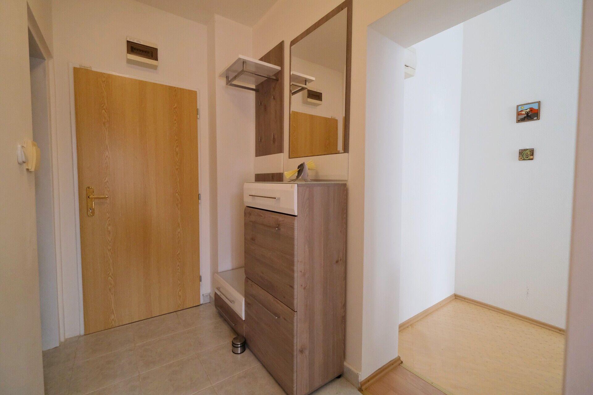 Apartmán je prakticky řešený, z předsíně vedou samostatné vchody do ložnice, koupelny i obývacího prostoru. K ložnici patří balkon, odkud máte krásný výhled do klidu - na vlastní pozemek, přes vzrostlé stromy vidíte vodní plochu přehrady. Ložnice je vybavena velkou vestavnou skříní z kvalitního materiálu se zrcadlem. V obývacím pokoji je prosklená stěna, která byt velmi příjemně prosvětlí a zároveň odtud máte možnost sledovat západ slunce. Prostorný kuchyňský kout je vybaven kvalitní kuchyňskou linkou vyrobenou na míru s vesavěnými spotřebiči.