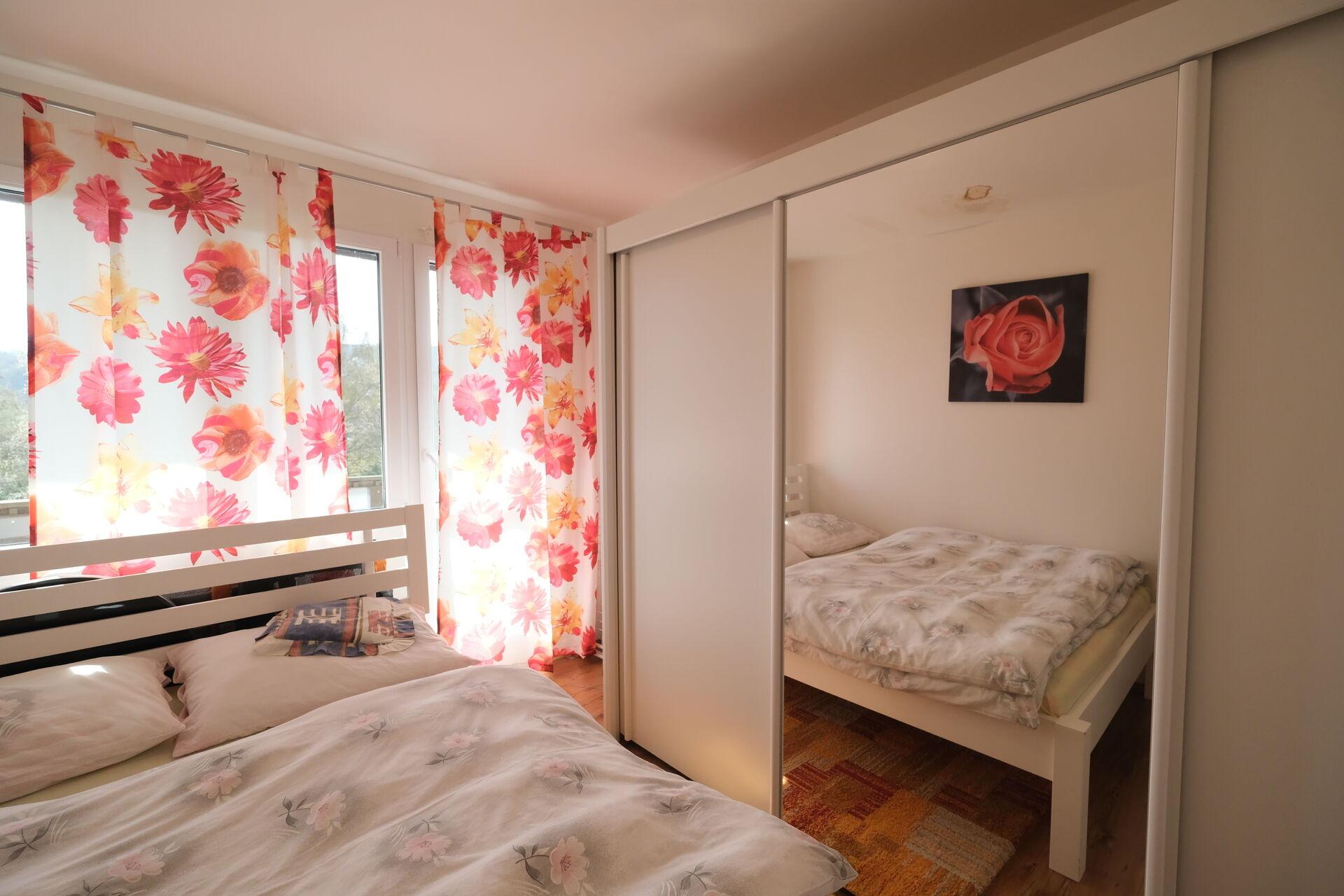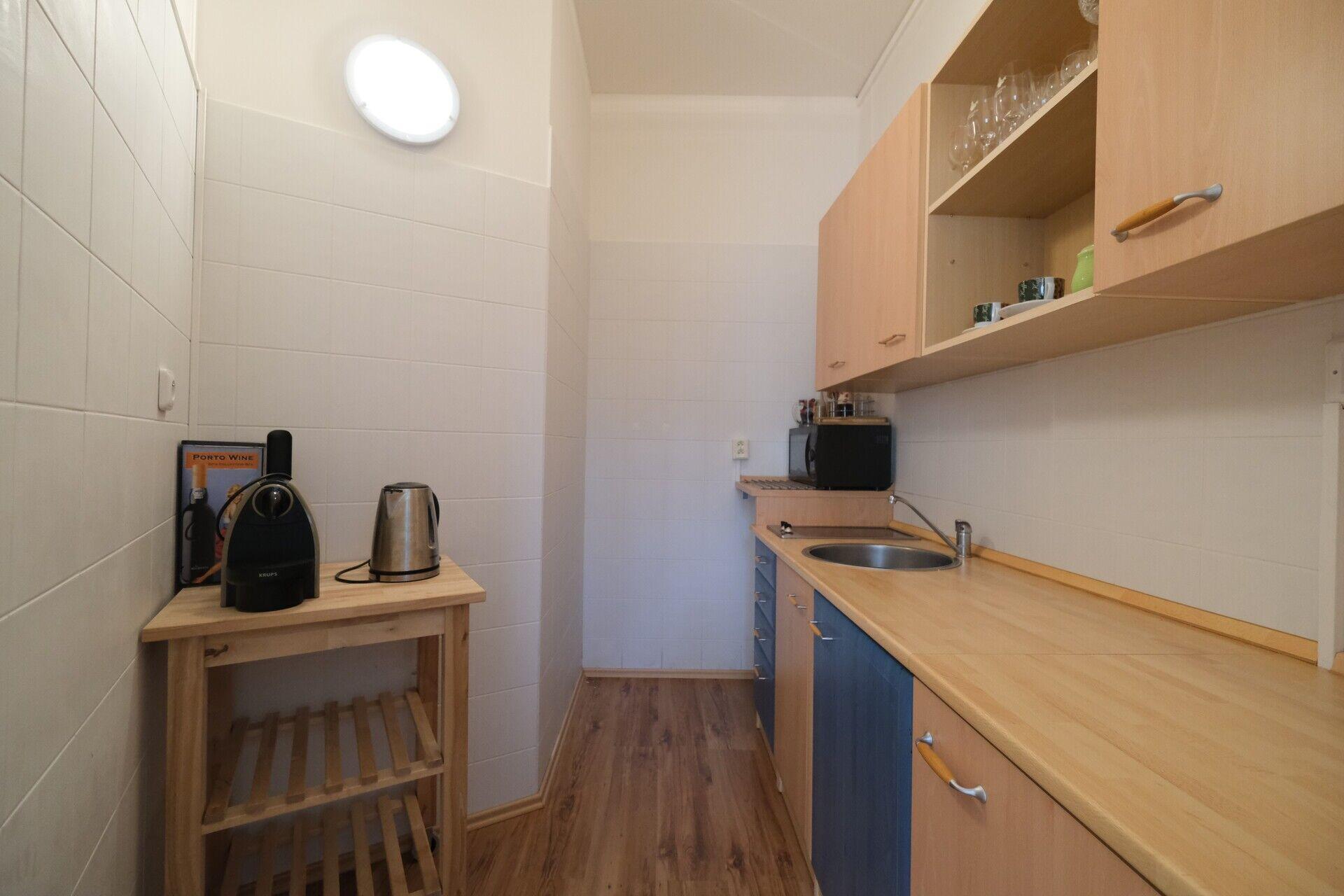 Apartmán je prakticky řešený, z předsíně vedou samostatné vchody do ložnice, koupelny i obývacího prostoru. K ložnici patří balkon, odkud máte krásný výhled do klidu - na vlastní pozemek, přes vzrostlé stromy vidíte vodní plochu přehrady. Ložnice je vybavena velkou vestavnou skříní z kvalitního materiálu se zrcadlem. V obývacím pokoji je prosklená stěna, která byt velmi příjemně prosvětlí a zároveň odtud máte možnost sledovat západ slunce. Prostorný kuchyňský kout je vybaven kvalitní kuchyňskou linkou vyrobenou na míru s vesavěnými spotřebiči.