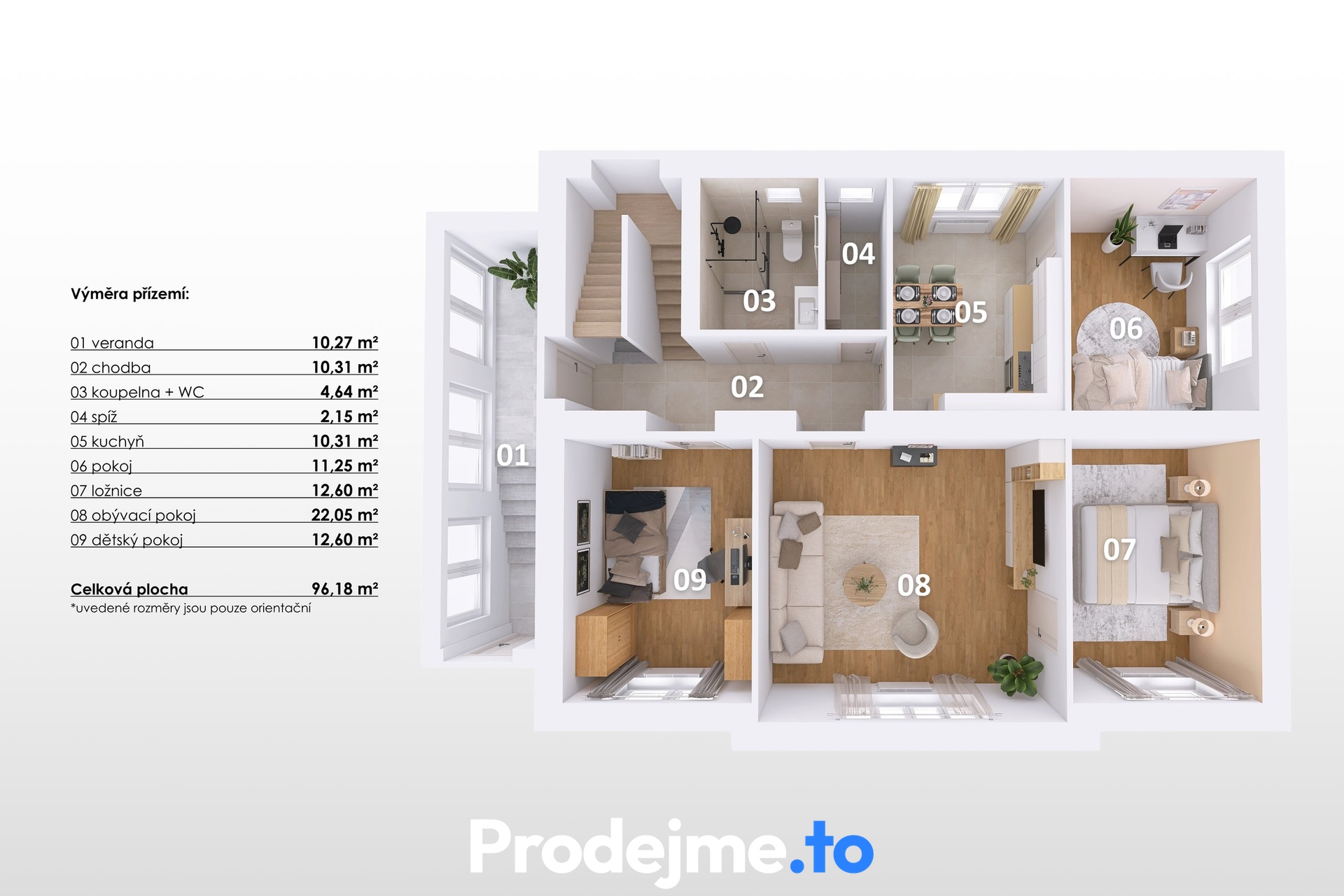 Přízemí (cca 96 m²) slouží jako hlavní obytná část. K dispozici jsou čtyři pokoje – obývací pokoj, ložnice, dětský pokoj a jedna další místnost. Nechybí kuchyně s praktickou spíží a koupelna s toaletou.