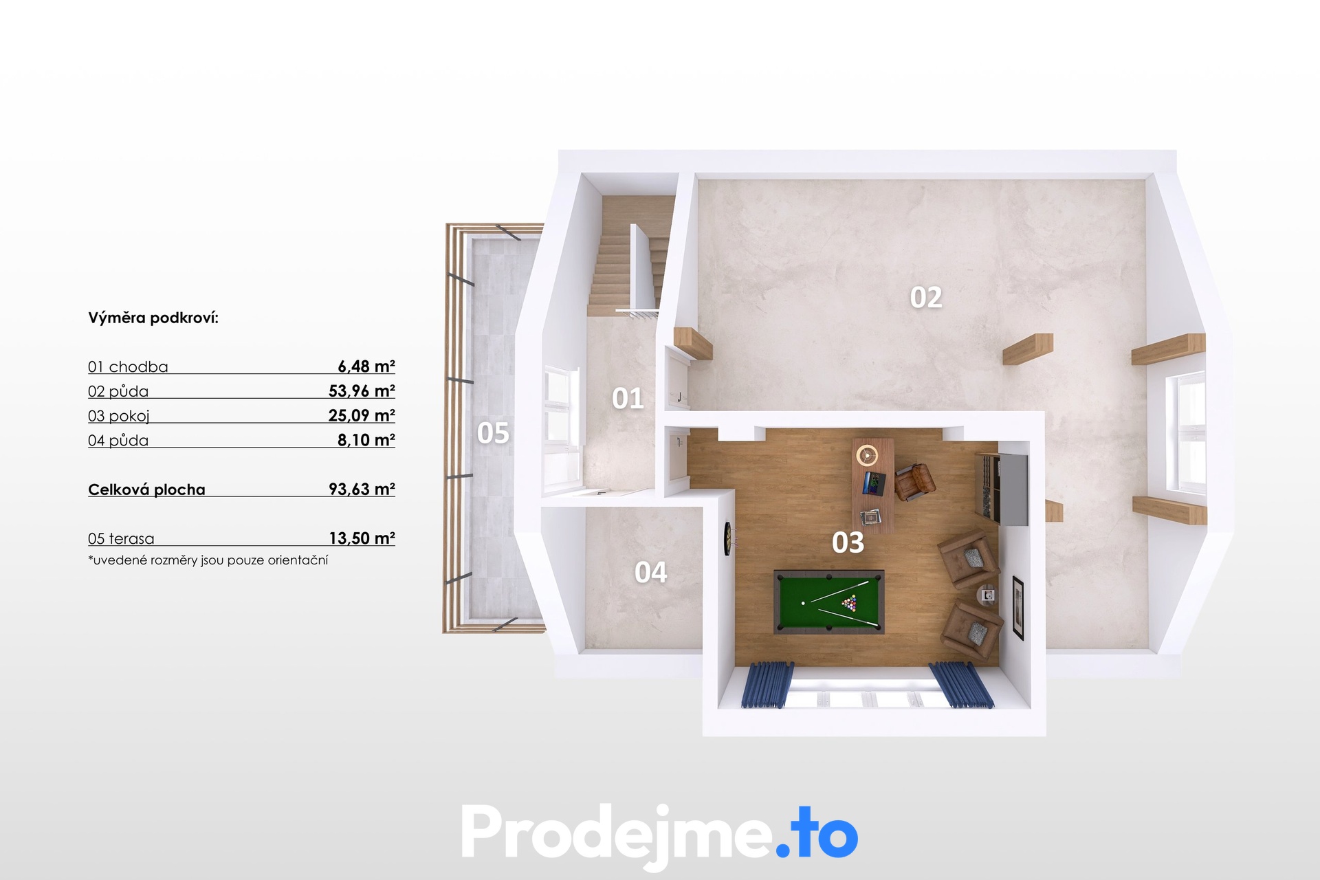 V podkroví se aktuálně nachází jeden pokoj a vstup na terasu. Zbytek prostoru tvoří velkorysá půda s výrazným potenciálem pro vybudování dalších obytných místností. Celý dům tak nabízí zázemí pro velkou rodinu i prostor pro hobby či podnikání.