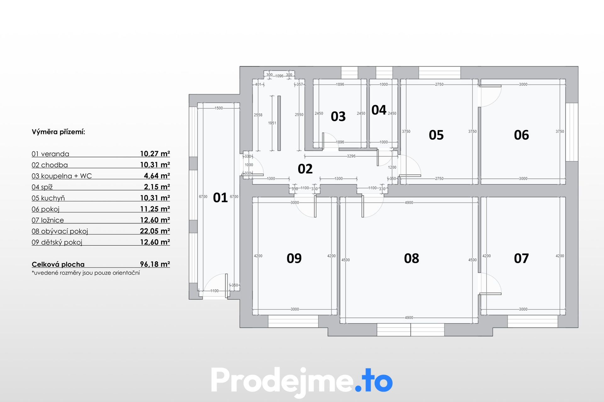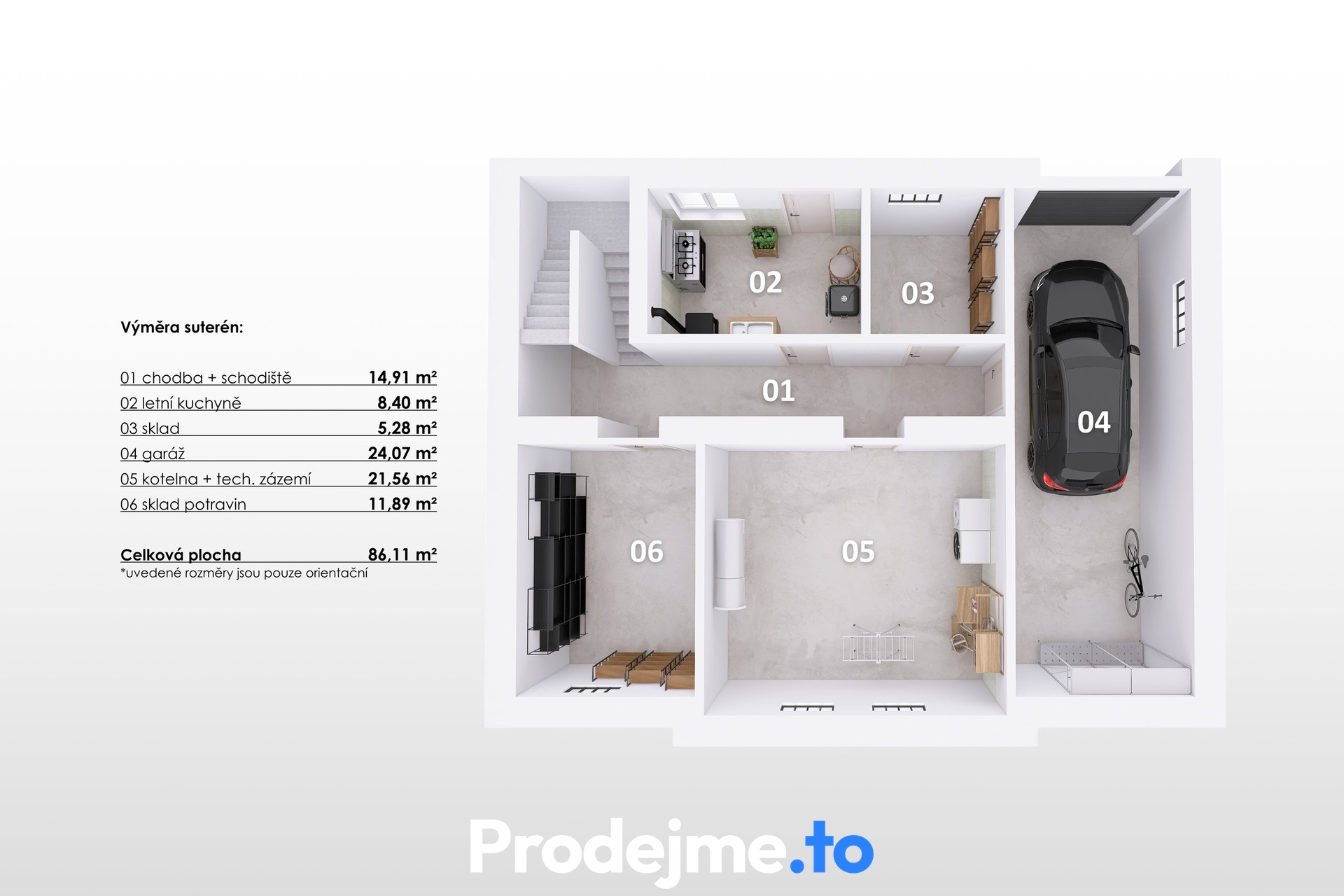Přízemí (cca 96 m²) slouží jako hlavní obytná část. K dispozici jsou čtyři pokoje – obývací pokoj, ložnice, dětský pokoj a jedna další místnost. Nechybí kuchyně s praktickou spíží a koupelna s toaletou.