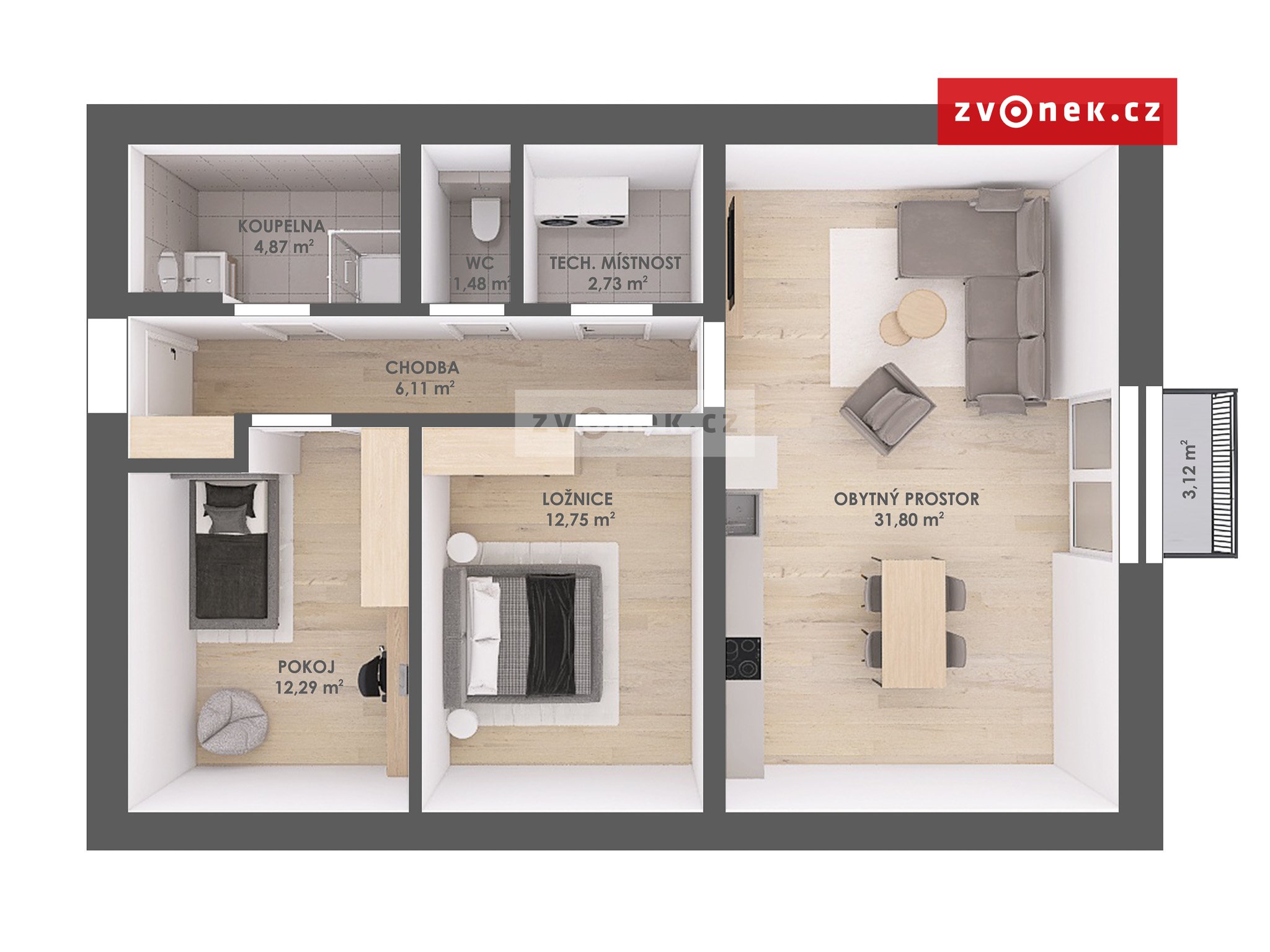 Dispozice bytu zahrnuje prostornou vstupní chodbu, dva samostatné pokoje, obývací pokoj s kuchyňským koutem a přímým vstupem na balkon, koupelnu, samostatné WC a technickou místnost. K bytu náleží prostorný sklep (7,5 m²) v suterénu a vlastní parkovací stání přímo u domu. Součástí je také oplocená zahrada o velikosti 121 m², vyhrazená výhradně pro tento byt. Zahradu můžete využít dle vlastního přání – ať už k relaxaci, stavbě pergoly, hernímu prostoru pro děti nebo pěstování rostlin.