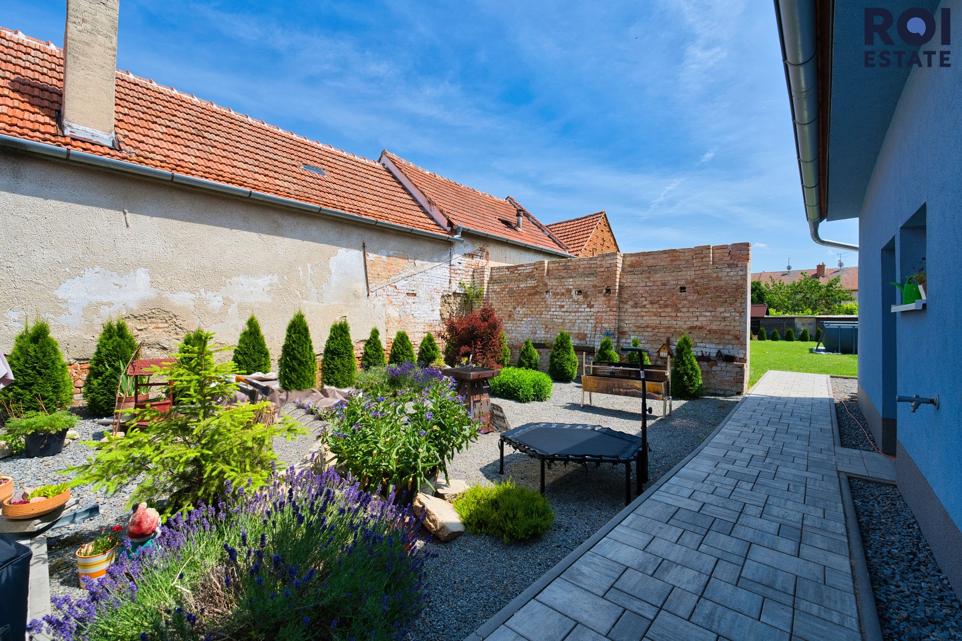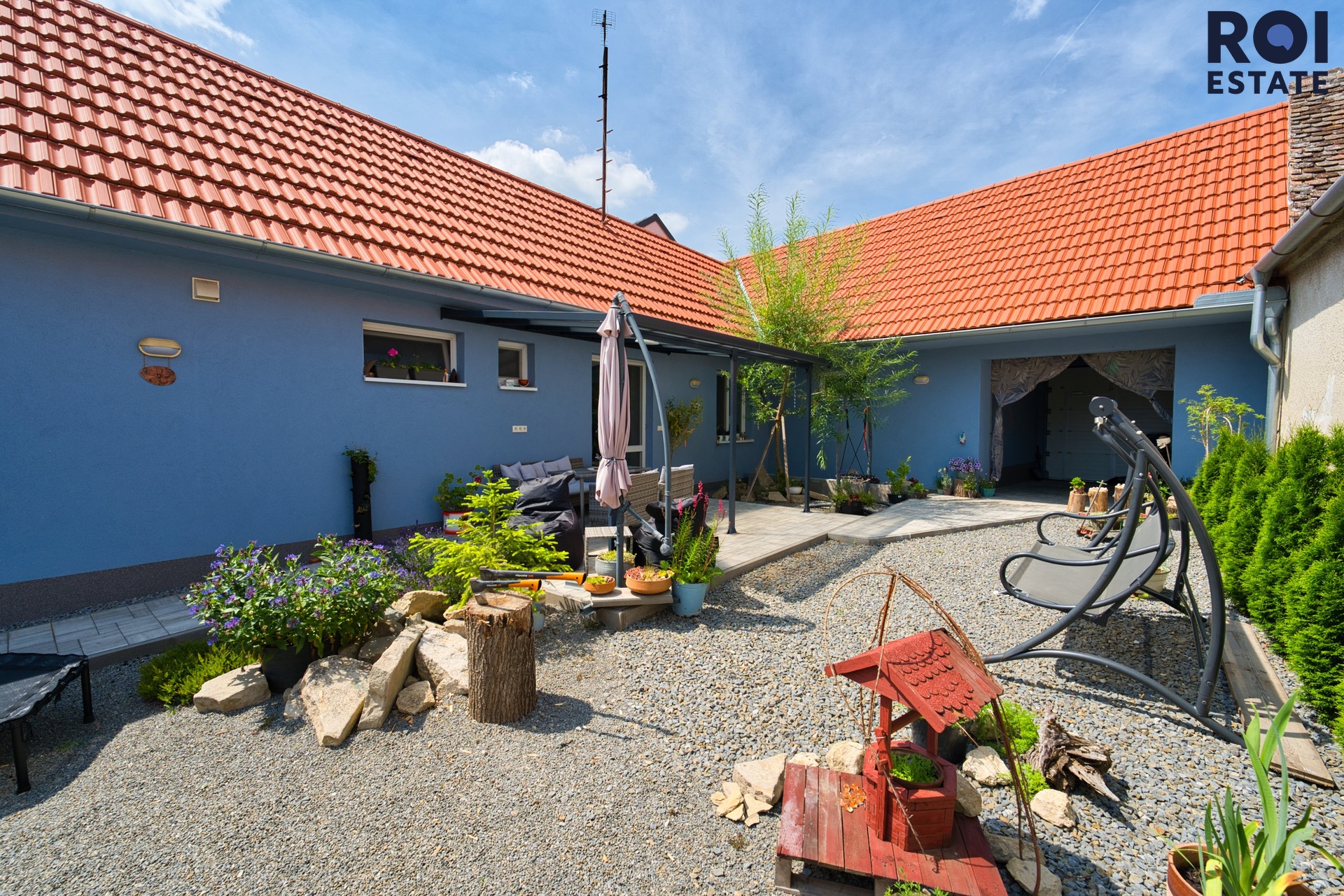 Za vstupními vraty vás uvítá průjezd, odkud se dostanete do útulného dvora s prostornou zastřešenou terasou, ideálním místem pro rodinné oslavy, grilování s přáteli nebo jen odpočinek s knihou.
