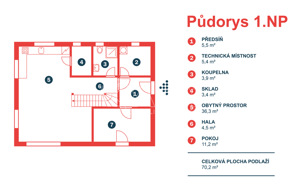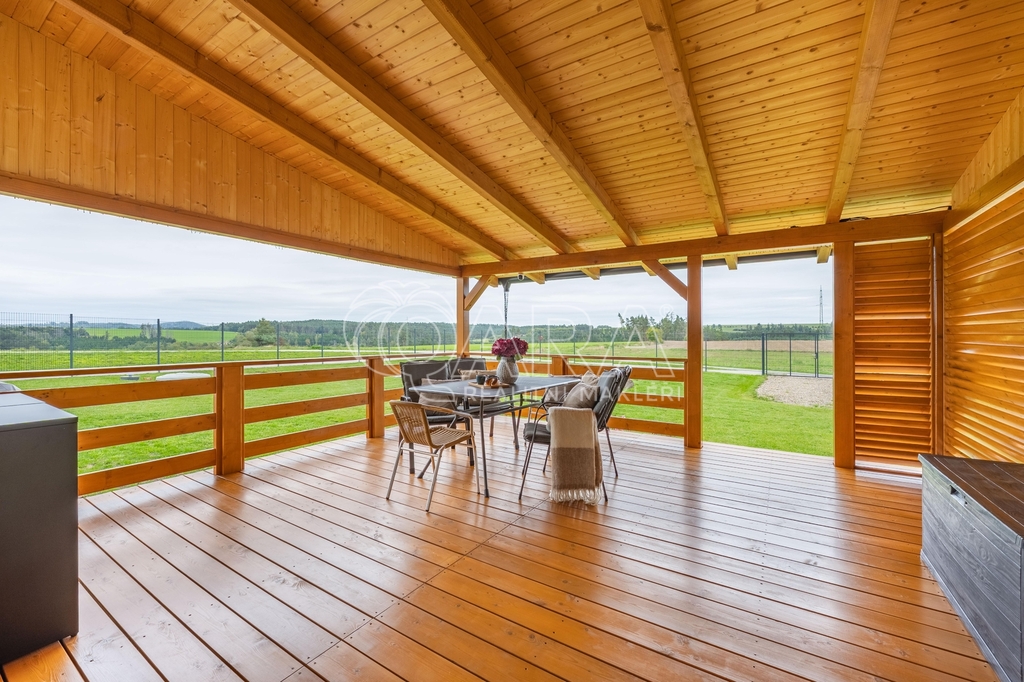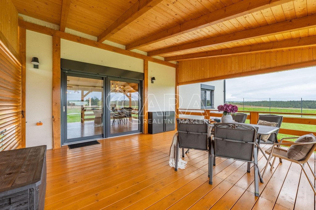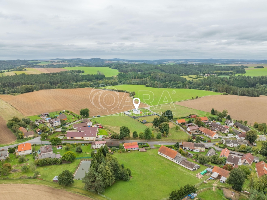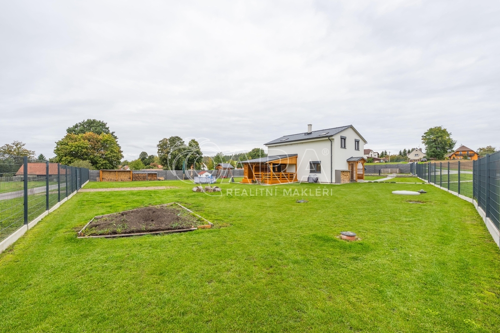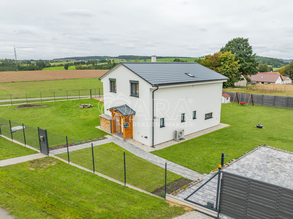 Dvoupodlažní rodinný dům o celkové ploše 136,9 m² se rozkládá na pozemku o výměře 1851 m². Dům je dispozičně řešen jako 6+kk s přímo navazující terasou. Dům sestává z obývacího pokoje s kuchyňským koutem, pěti pokojů, technické místnosti, spíže, chodby, koupelny se sprchovým koutem a WC v prvním patře a koupelny s vanou, sprchovým koutem a WC ve druhém patře. Z pozemku je krásný výhled na les.
