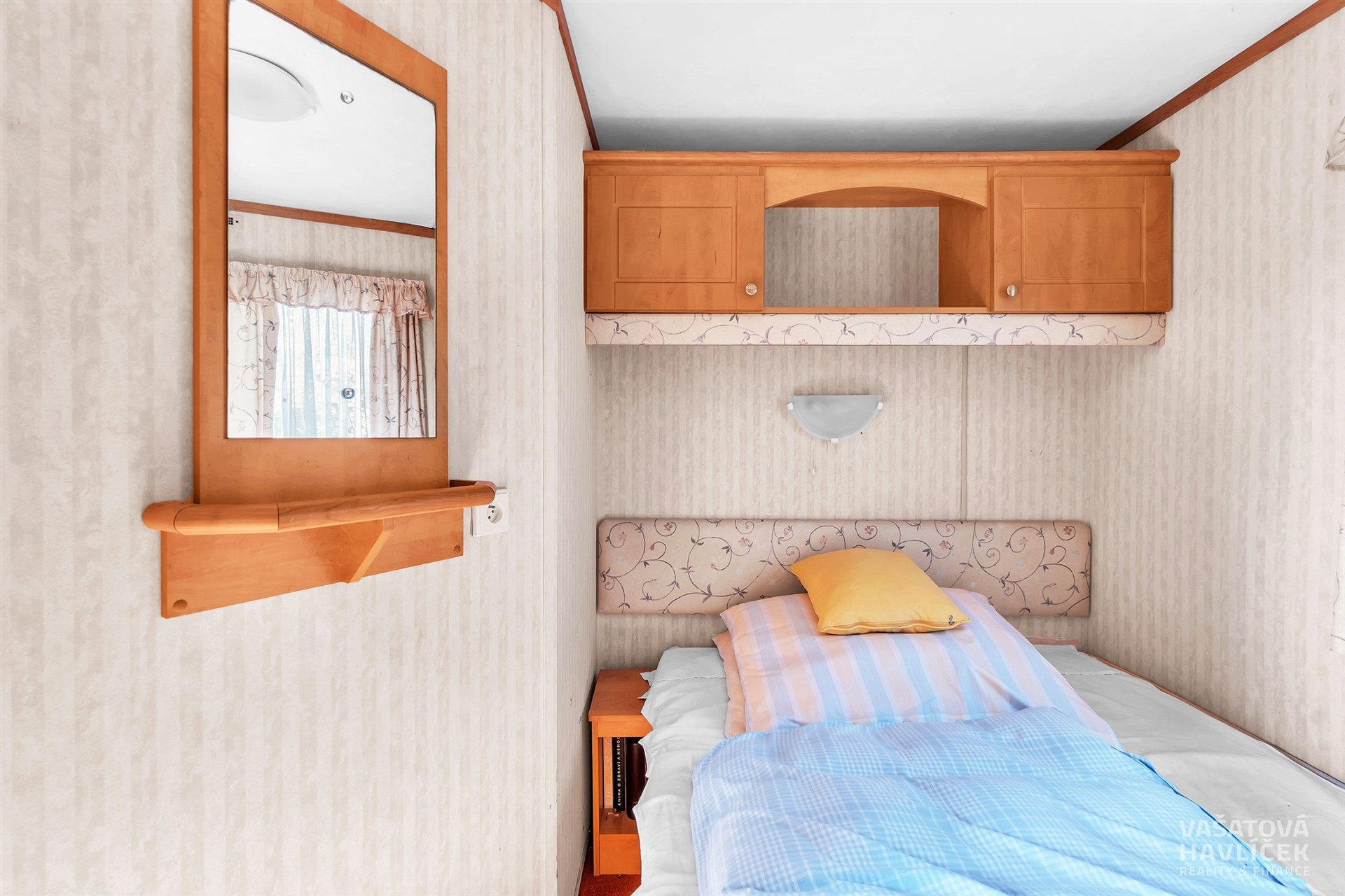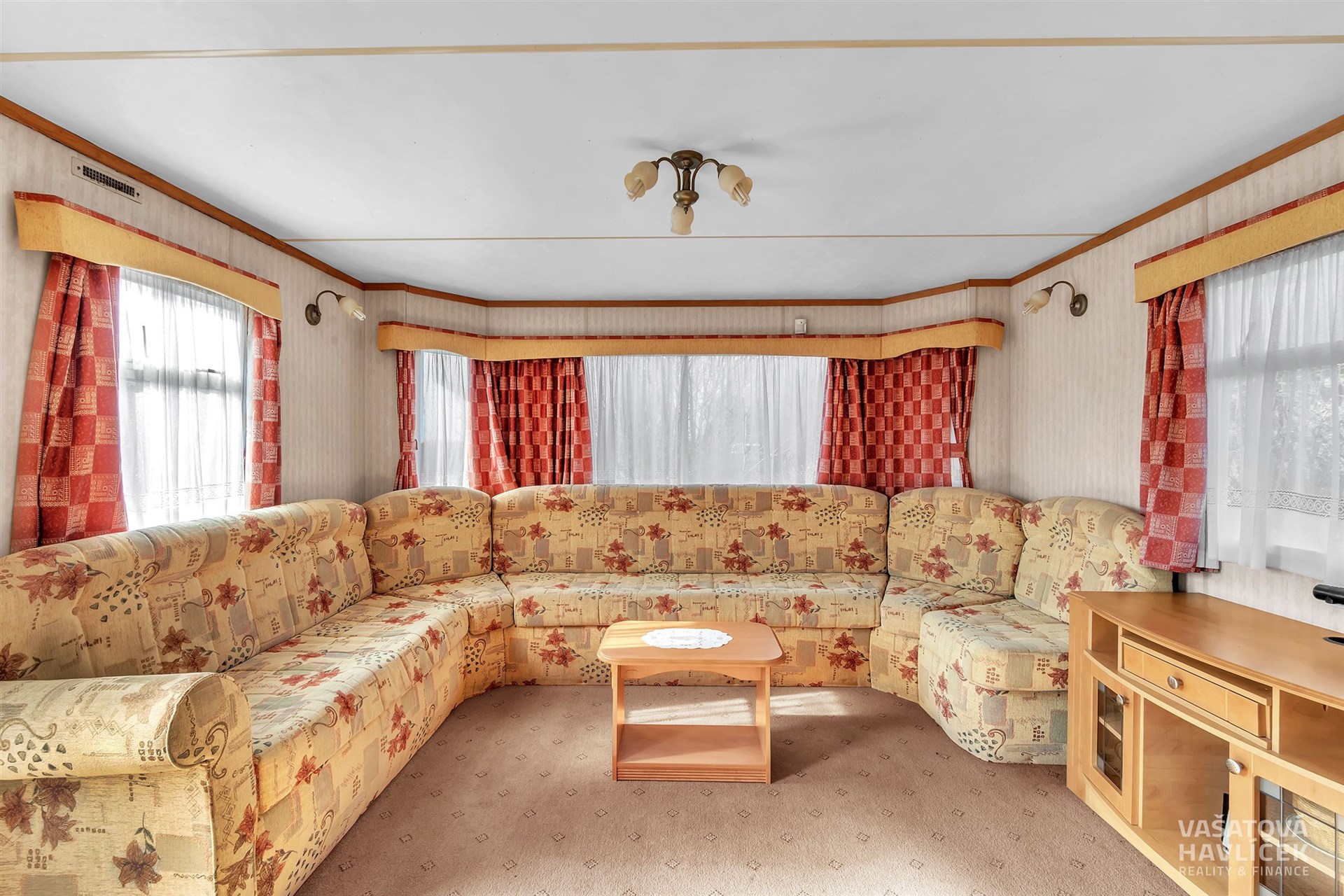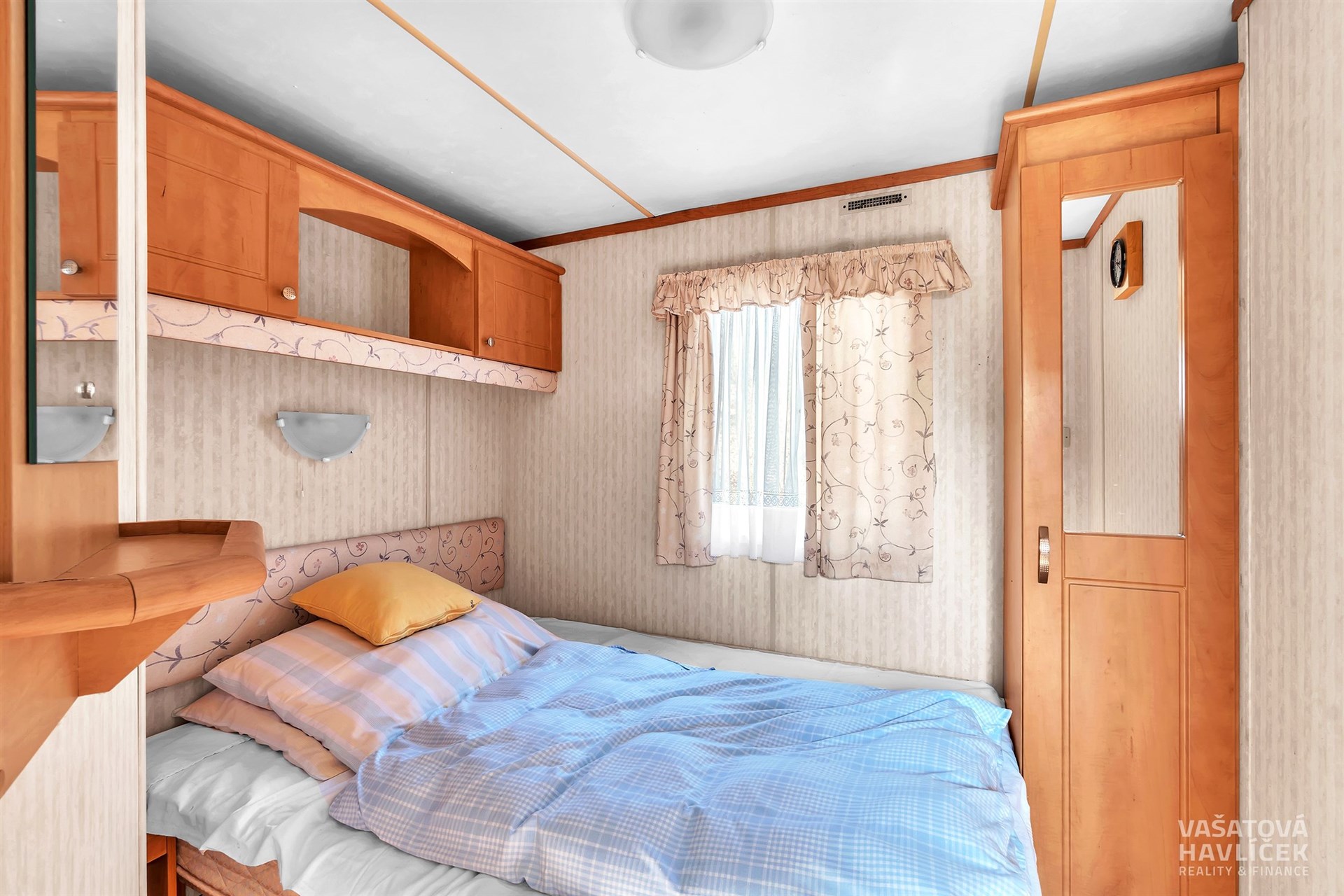 > mobilheim se dvěma ložnicemi, obývacím pokojem s kuchyňským koutem a koupelnou