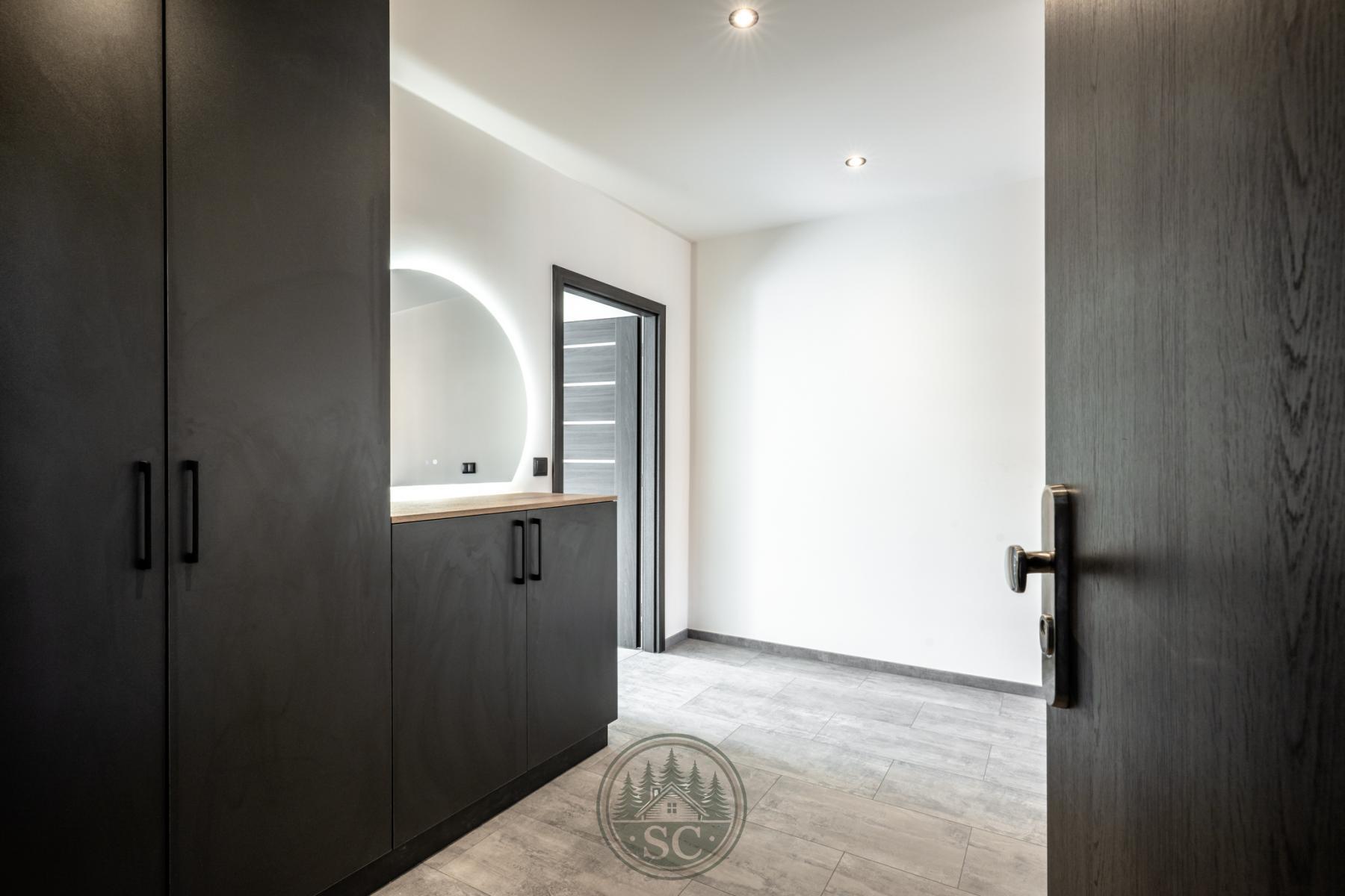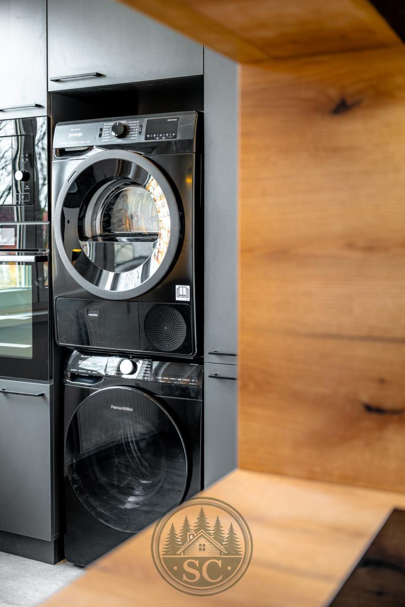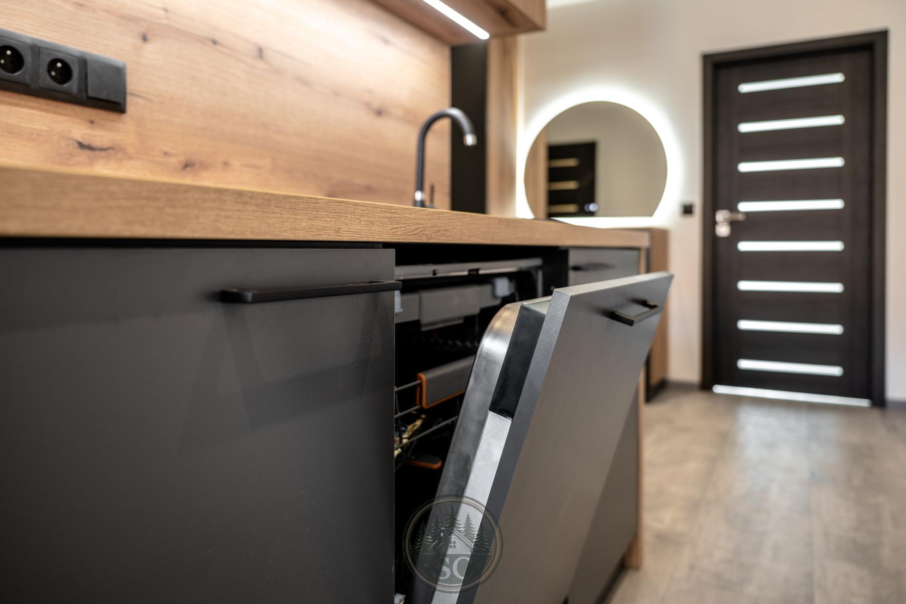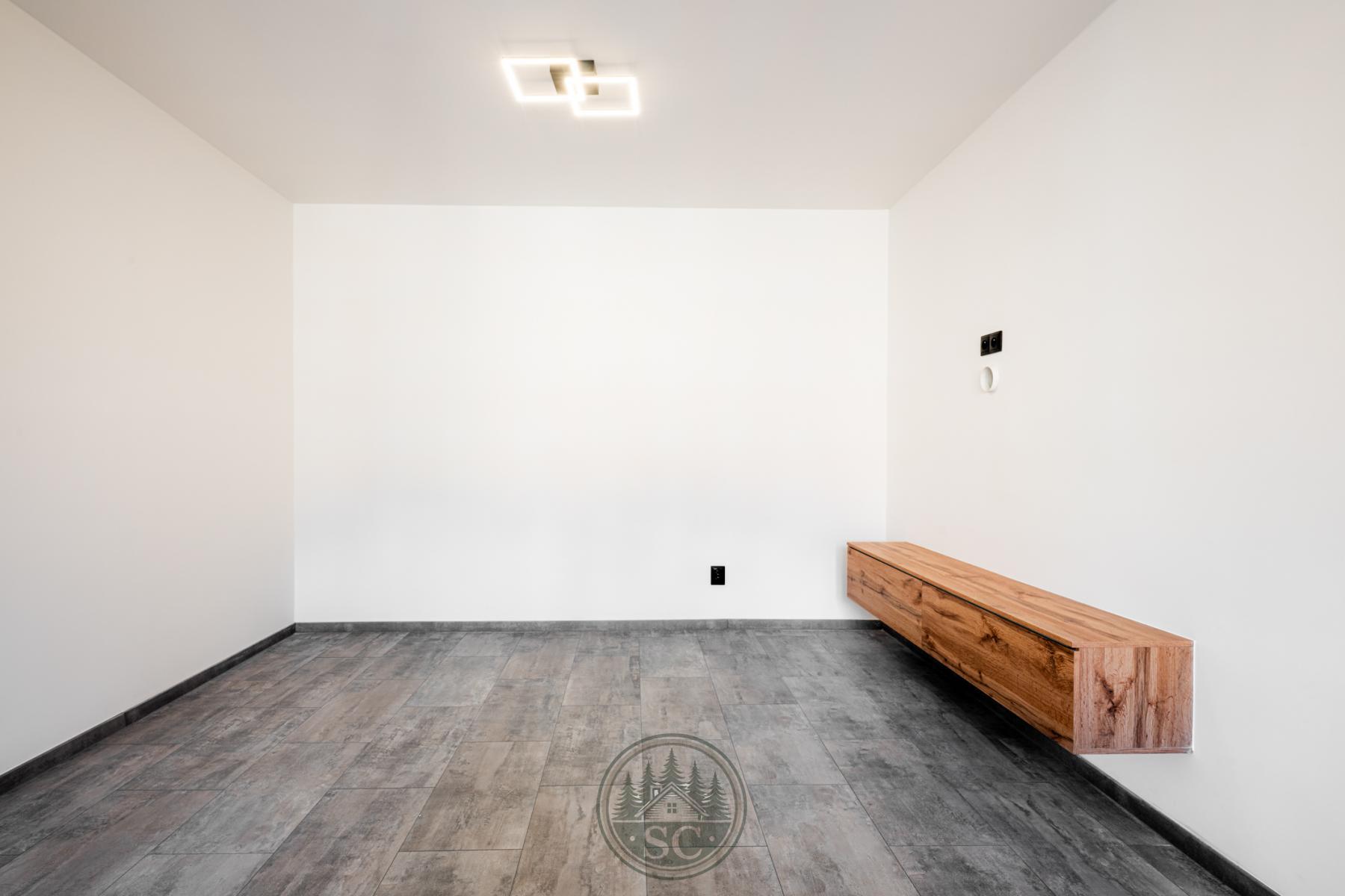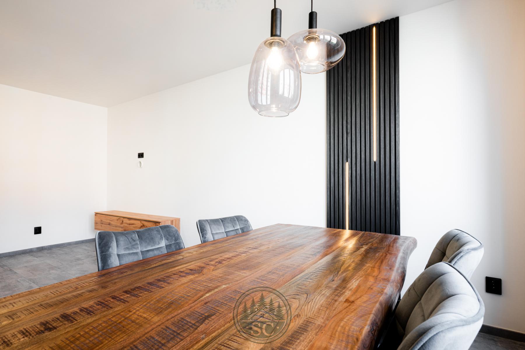 Kuchyňská linka a vestavné skříně na míru od truhláře, masivní jídelní stůl, zabudované spotřebiče, obývací skříňka s přípravou pro TV, nádherná koupelna s podsvícenými nikami samozřejmostí jsou kompletní nové rozvody.