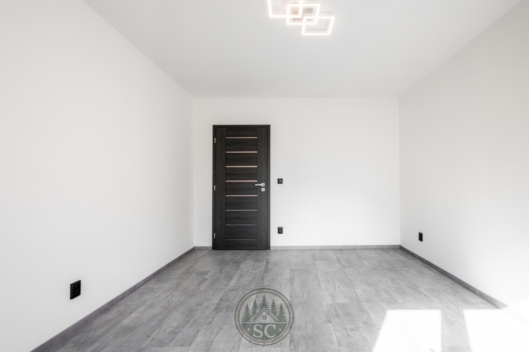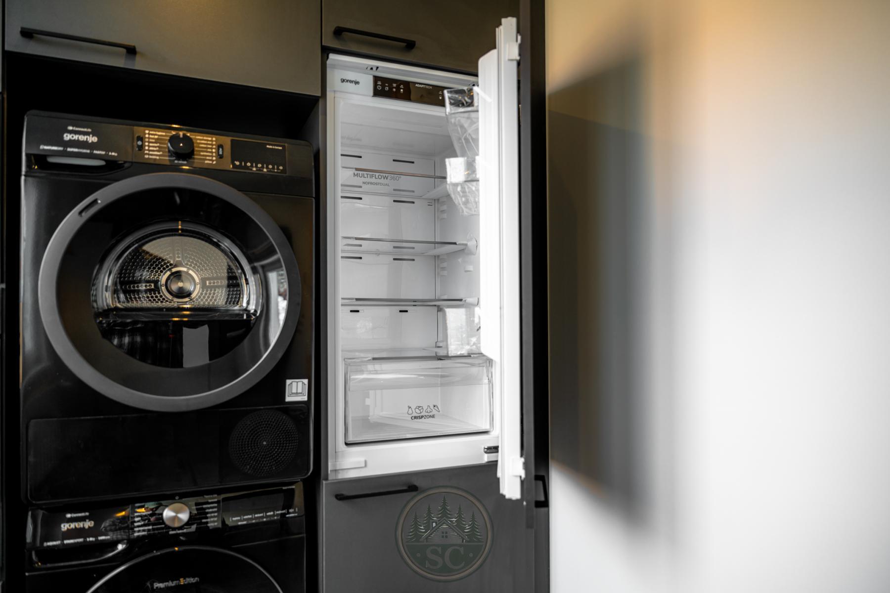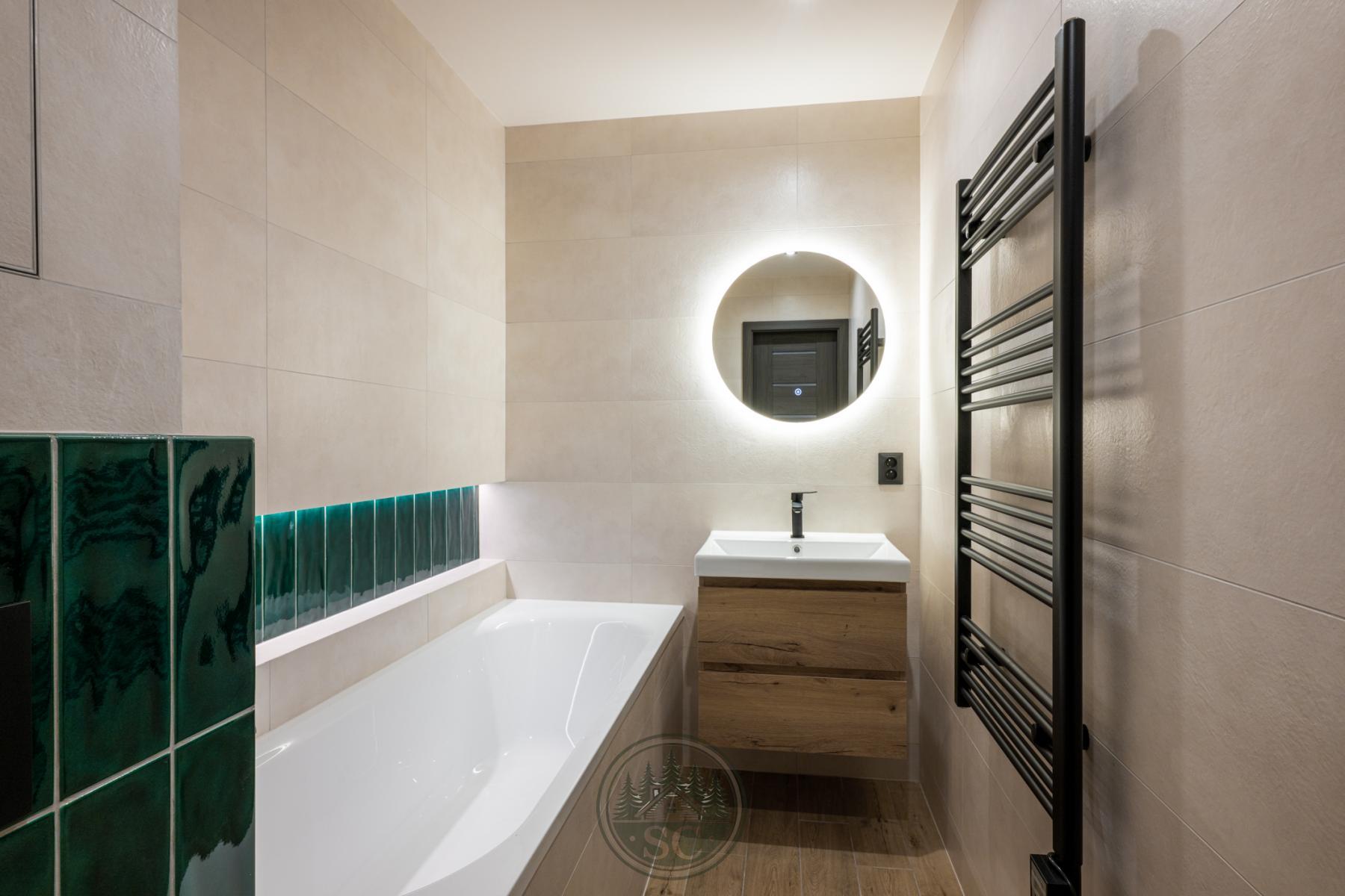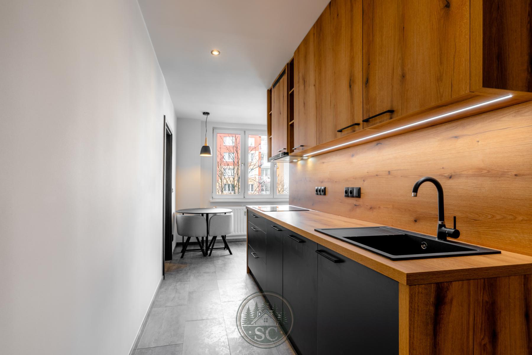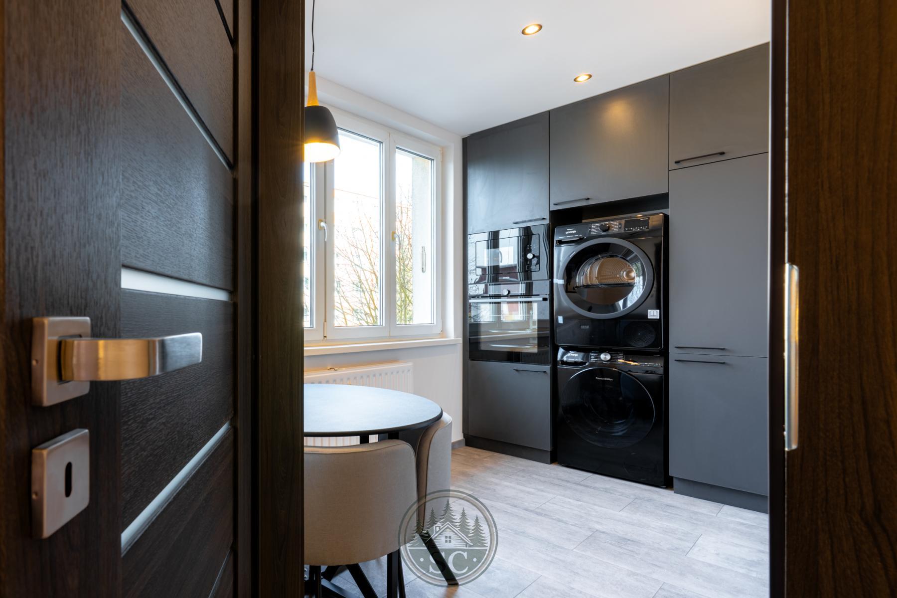 Kuchyňská linka a vestavné skříně na míru od truhláře, masivní jídelní stůl, zabudované spotřebiče, obývací skříňka s přípravou pro TV, nádherná koupelna s podsvícenými nikami samozřejmostí jsou kompletní nové rozvody.