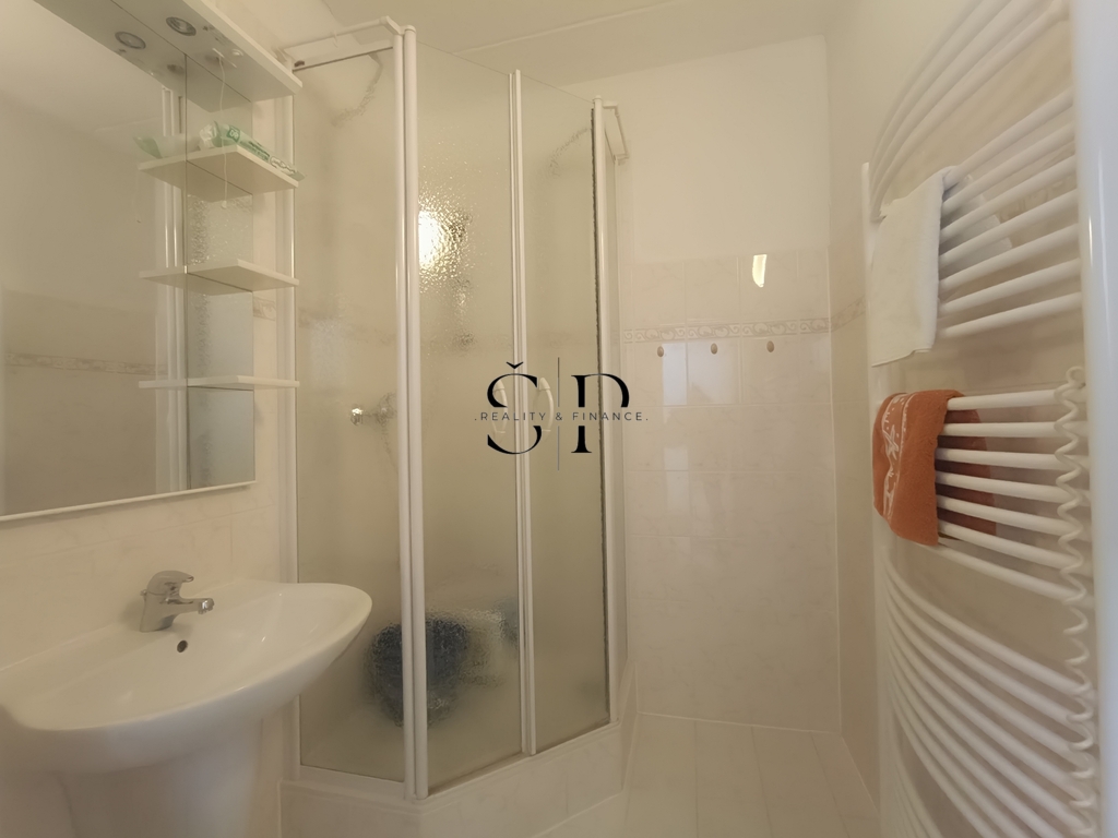 Koupelna disponuje sprchovým koutem, vanou a umyvadlem.