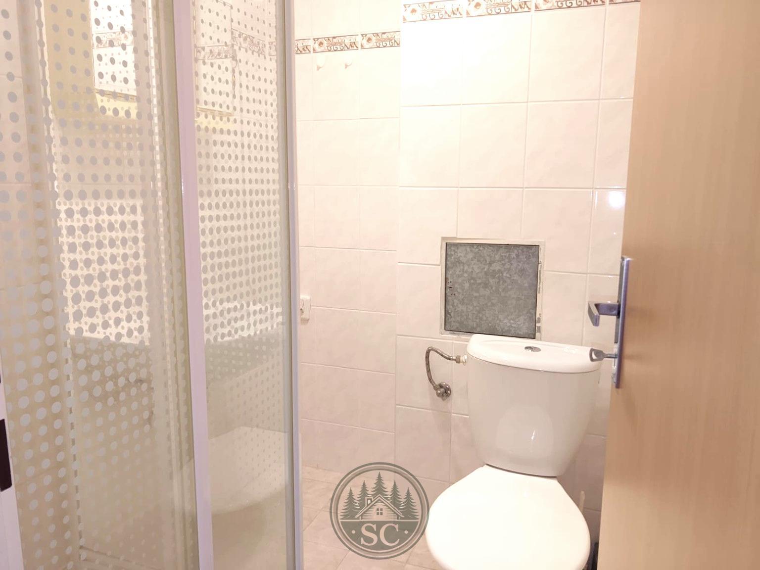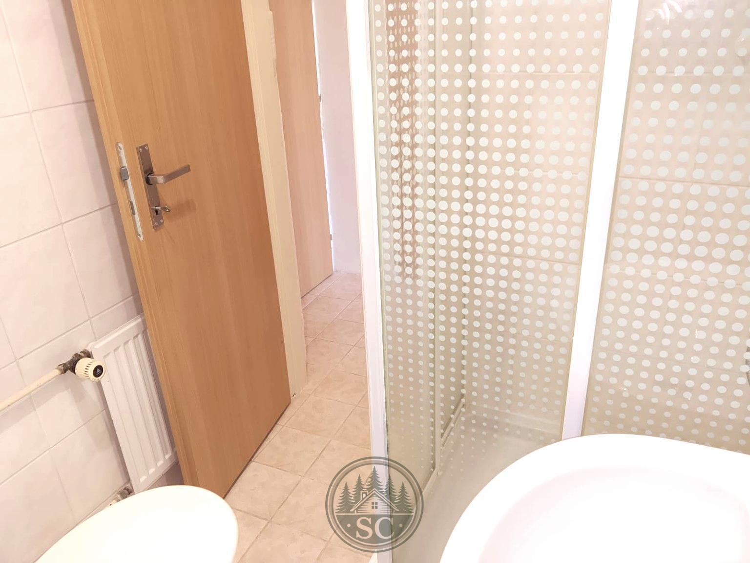 Součástí koupelny je WC, sprchový kout a umyvadlo.