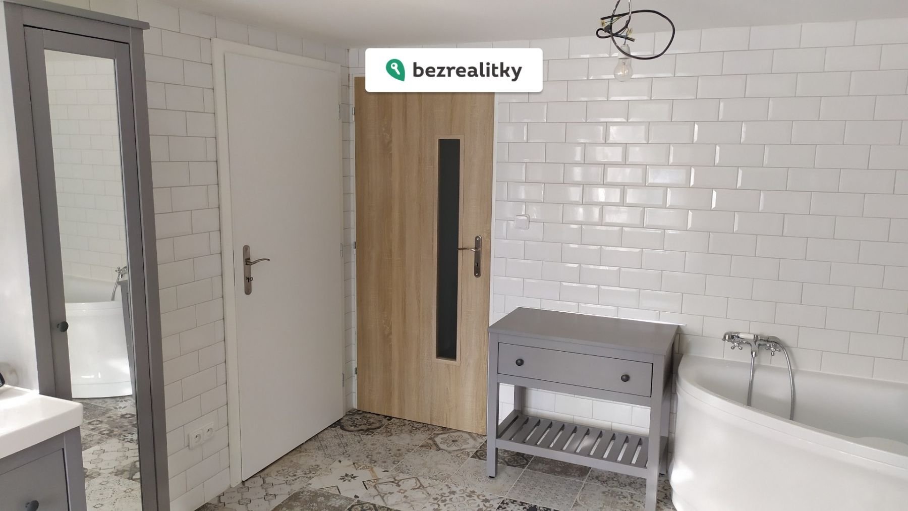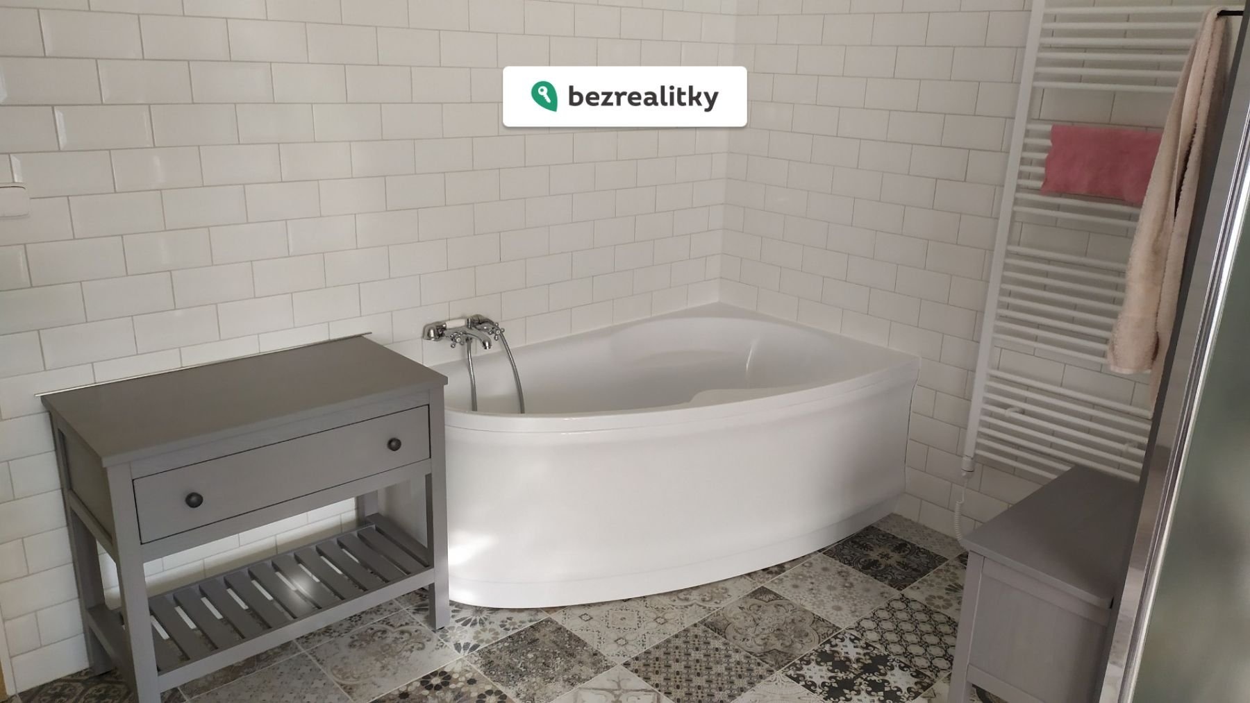 Koupelna je komfortní a nadstandardně prostorná, s rohovou vanou, bezbariérovým sprchovým koutem a WC.