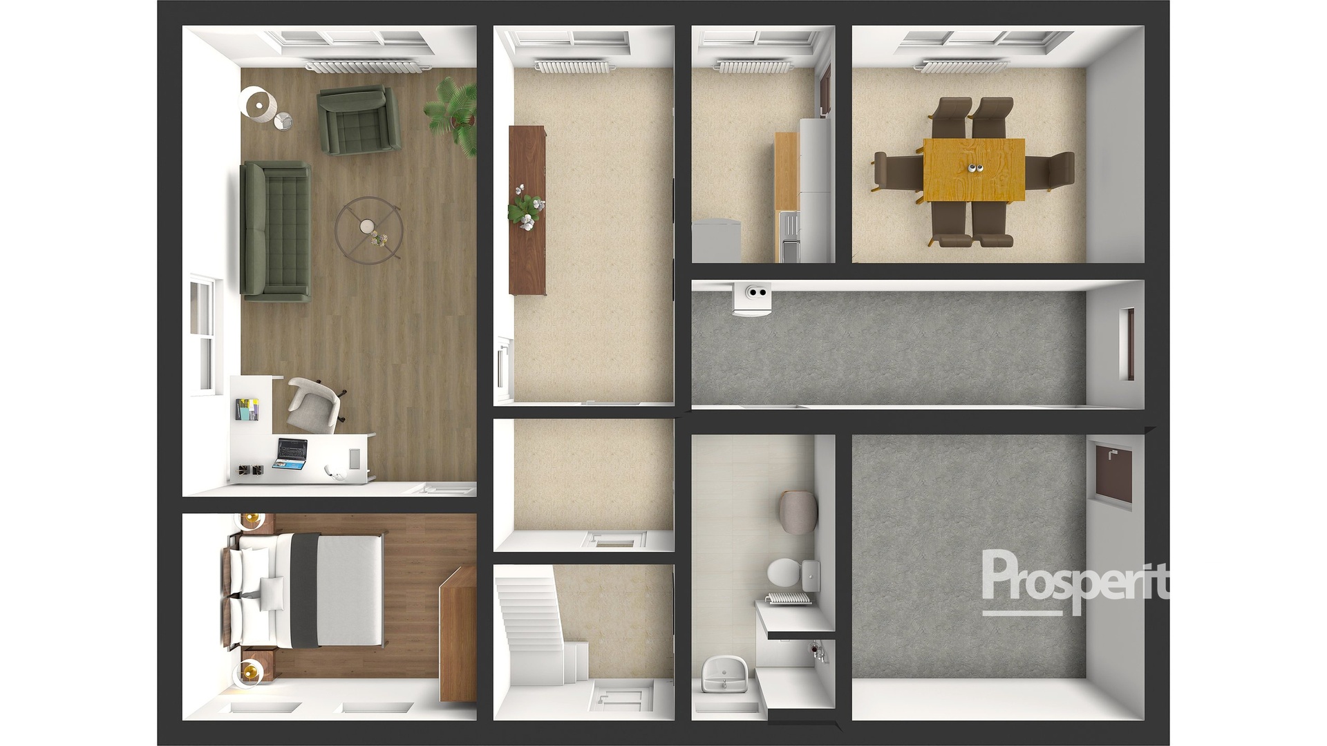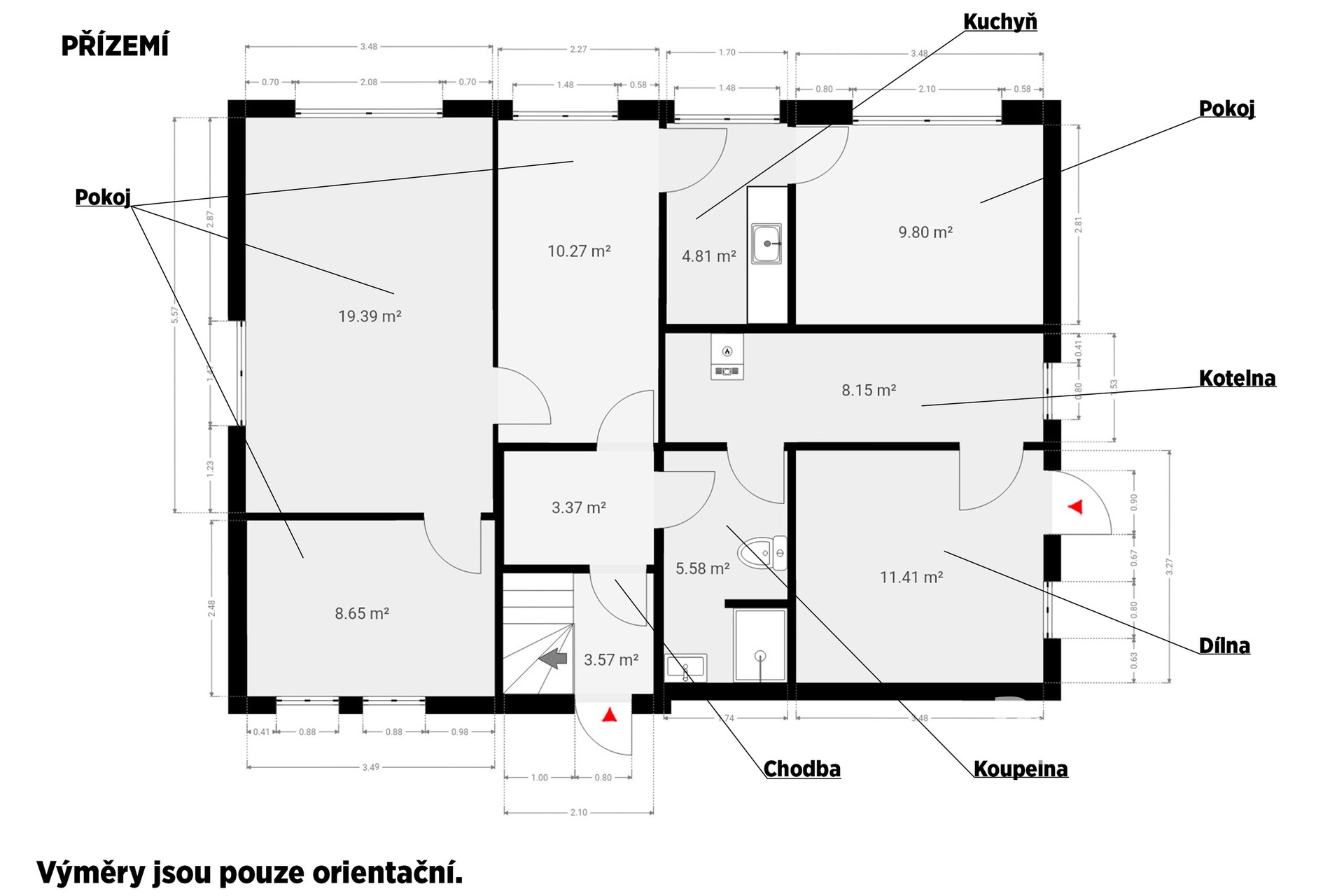 ▸ Přízemí - 4 pokoje, kuchyně, koupelna s toaletou, kotelna a dílna (4+1)