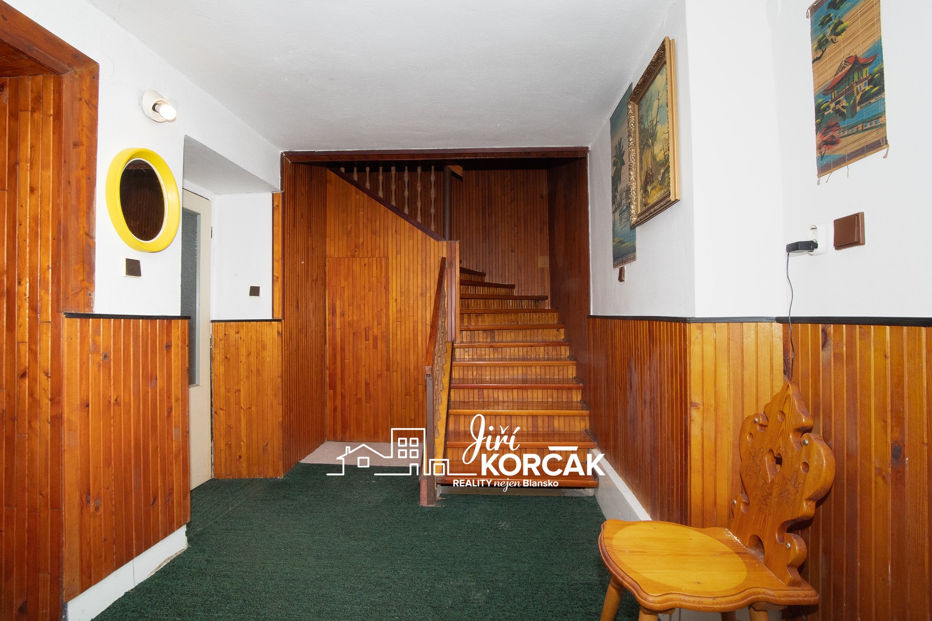 Zázemí domu jako je koupelna, toaleta, technická místnost, garáž a sklad je dostupné z chodby za kuchyní a stejně tak je z tohoto místa dostupné po dřevěném schodišti i podkroví.