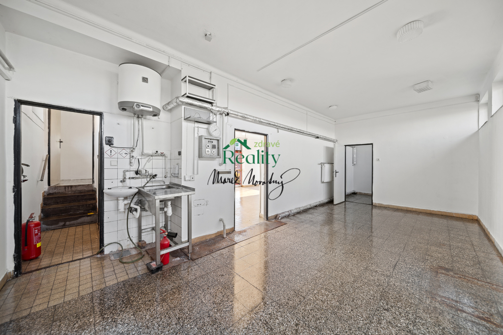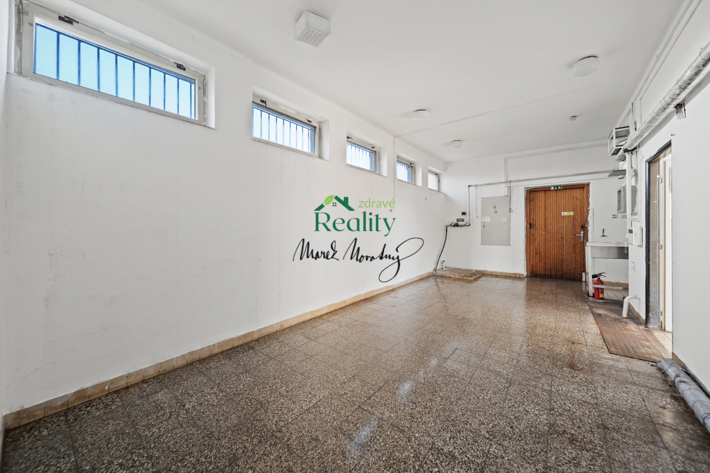 Přízemí: Aktuálně otevřený prostor bývalé prodejny s velkými výlohami + zázemí: sklady, malá kancelář, toaleta.