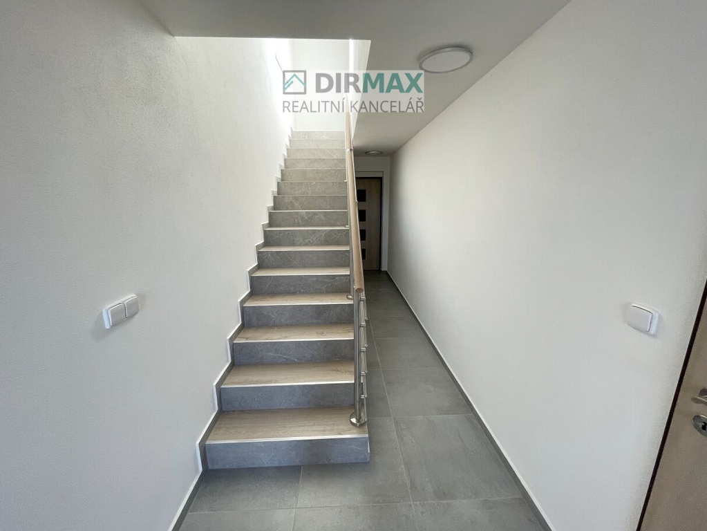 Po schodišti se zábradlím a dlažebními stupnicemi se jde do patra. V patře je místnost pro kuchyni s jídelnou a jsou tady kompletně připravené rozvody včetně odsavače. V celém patře je dlažba a podlahové vytápění.