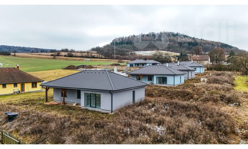 Dispozičně dům nabízí obývací pokoj s kuchyňským koutem a přímým vstupem na terasu a zahradu, dále ložnici, dva samostatné pokoje se šatnou, koupelnu, samostatné WC a technickou místnost.