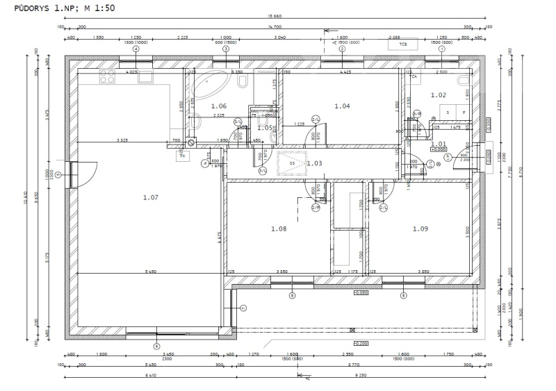 Rodinný dům je řešen jako jednopodlažní objekt půdorysného tvaru "L" se sedlovou (valbovou) střechou. Hlavní vstup do domu je situován z pravé strany objektu přes vstupní zádveří. Ze zádveří je přístup do technické místnosti a do chodby, která slouží jako hlavní komunikační prostor domu.