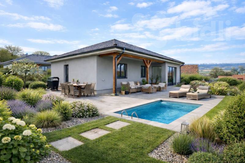 * konstrukce: kvalitní zděná stavba z systému Ytong s nadstandardním zateplením a důrazem na energetickou úspornost. Stabilní železobetonová základová deska, valbová střecha s dřevěnými vazníky, trojskla a podlahové vytápění zajišťují dlouhou životnost i komfortní bydlení.