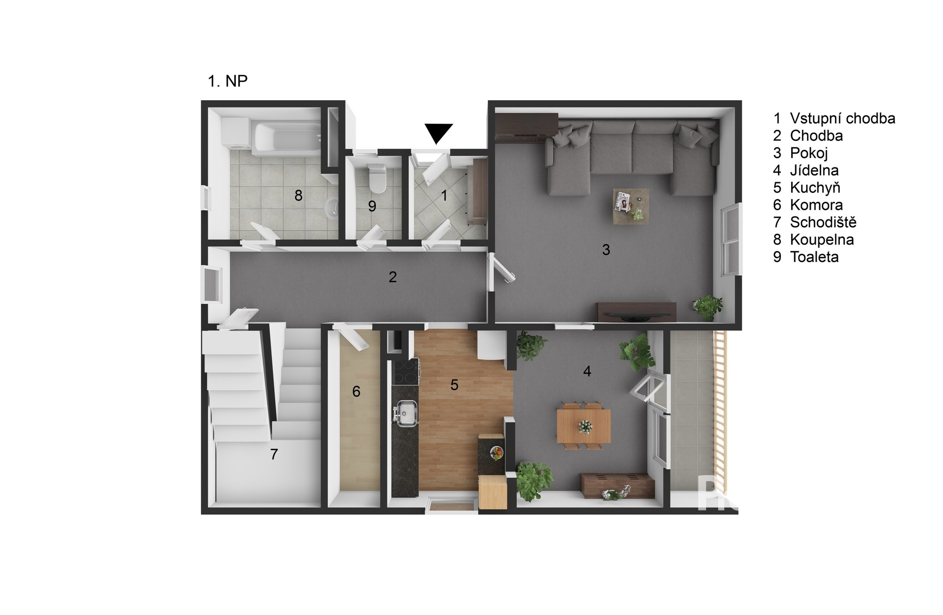 - vstupní chodba, obývací pokoj, samostatná kuchyně a jídelna, koupelna s vanou, samostatné WC, odkládací místnost