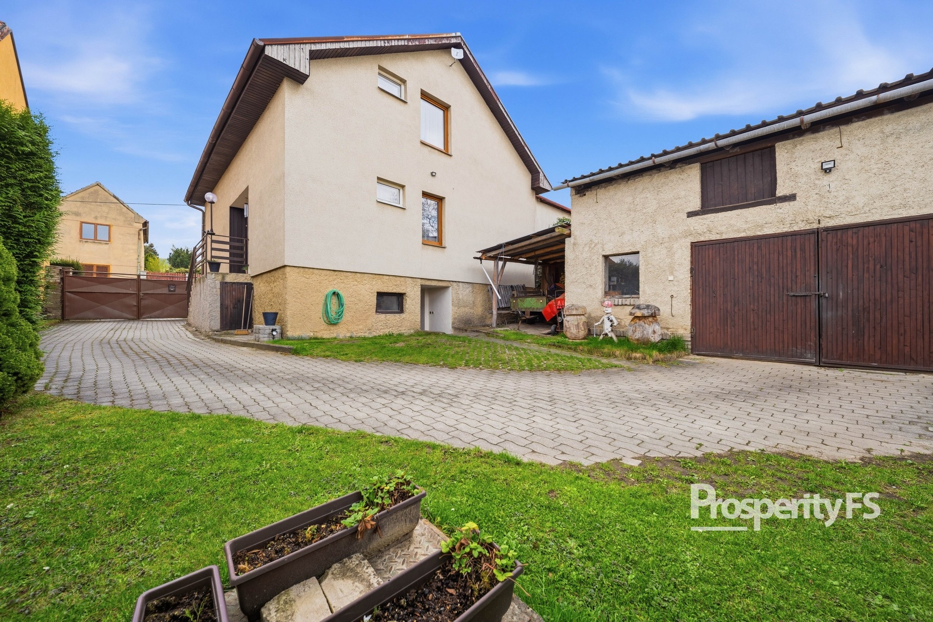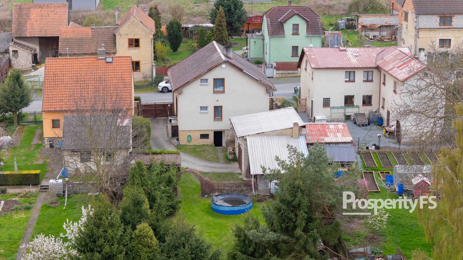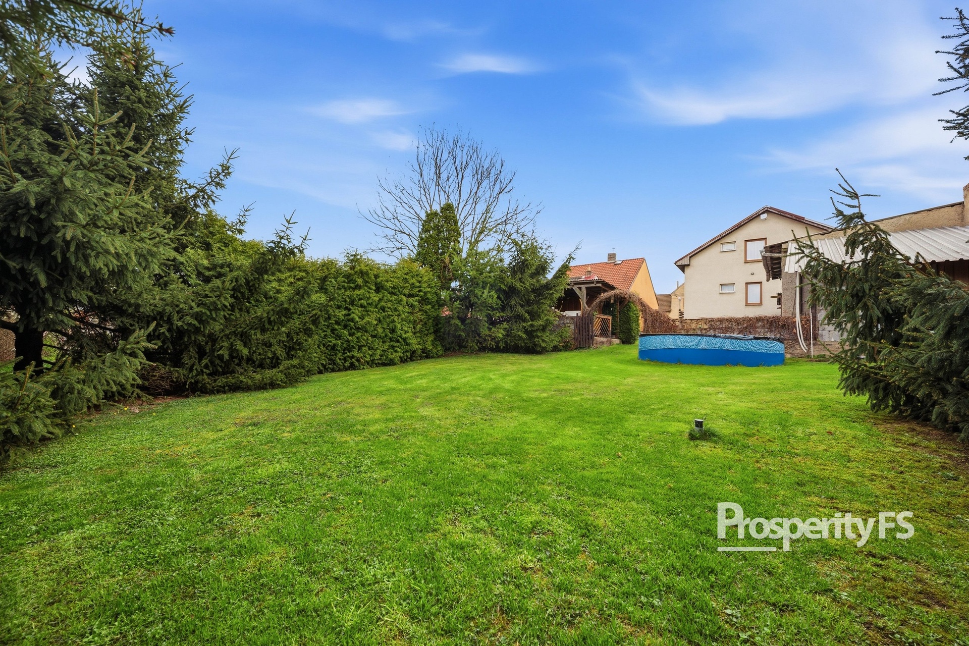 Dům se nachází na pozemku o výměře 615 m², samotná zahrada je situovaná za domem, což zajišťuje dostatek klidu a soukromí. Najdete zde zděnou pergolu - ideální pro trávení volného času, menší bazén, garáž a další vedlejší stavby včetně zděné stodoly.