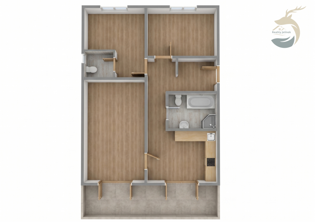 Byt se nachází v 1. nadzemním podlaží menšího rekreačního domu s pěti apartmány. Je kompletně vybavený a připravený k okamžitému užívání. Dispozice tvoří vstupní hala s úložnými prostory, hlavní koupelna s vanou i sprchovým koutem, dvě ložnice a prostorný obývací pokoj s jídelní částí a moderní kuchyní. Obytný prostor o rozloze téměř 38 m² nabízí krb, pohodlnou sedací soupravu a přímý vstup na velkou terasu s posezením. Hlavní ložnice má přes 17 m², druhá ložnice 15 m² a navíc vlastní koupelnu se sprchou a WC.