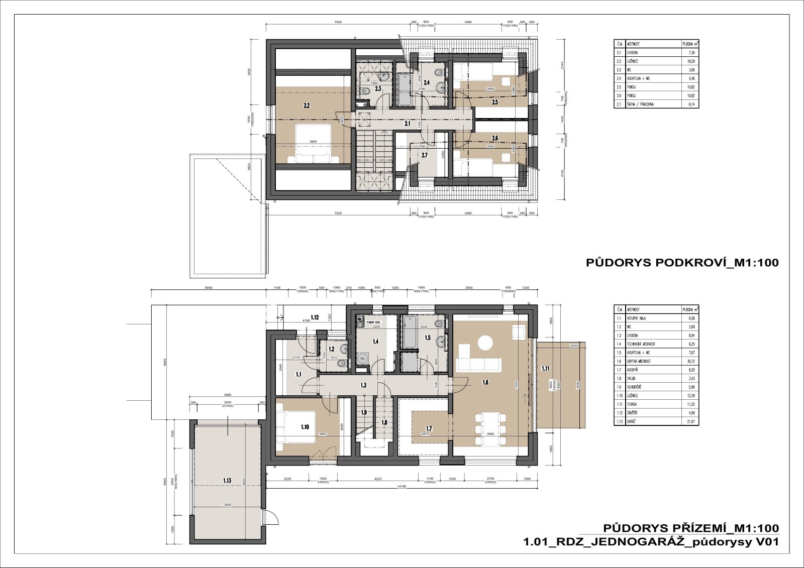 Dispozice 1.NP: vstupní závětří(5m2), vstupní hala(6,58m2), samostatné WC(2,69m2), tech.místnost(6,25m2), koupelna s WC(7,07m2), obývací pokoj s kuchyní(38,92m2), sklad(3,23m2), chodba(8,04m2), ložnice(12,29m2), terasa (11,25m2).