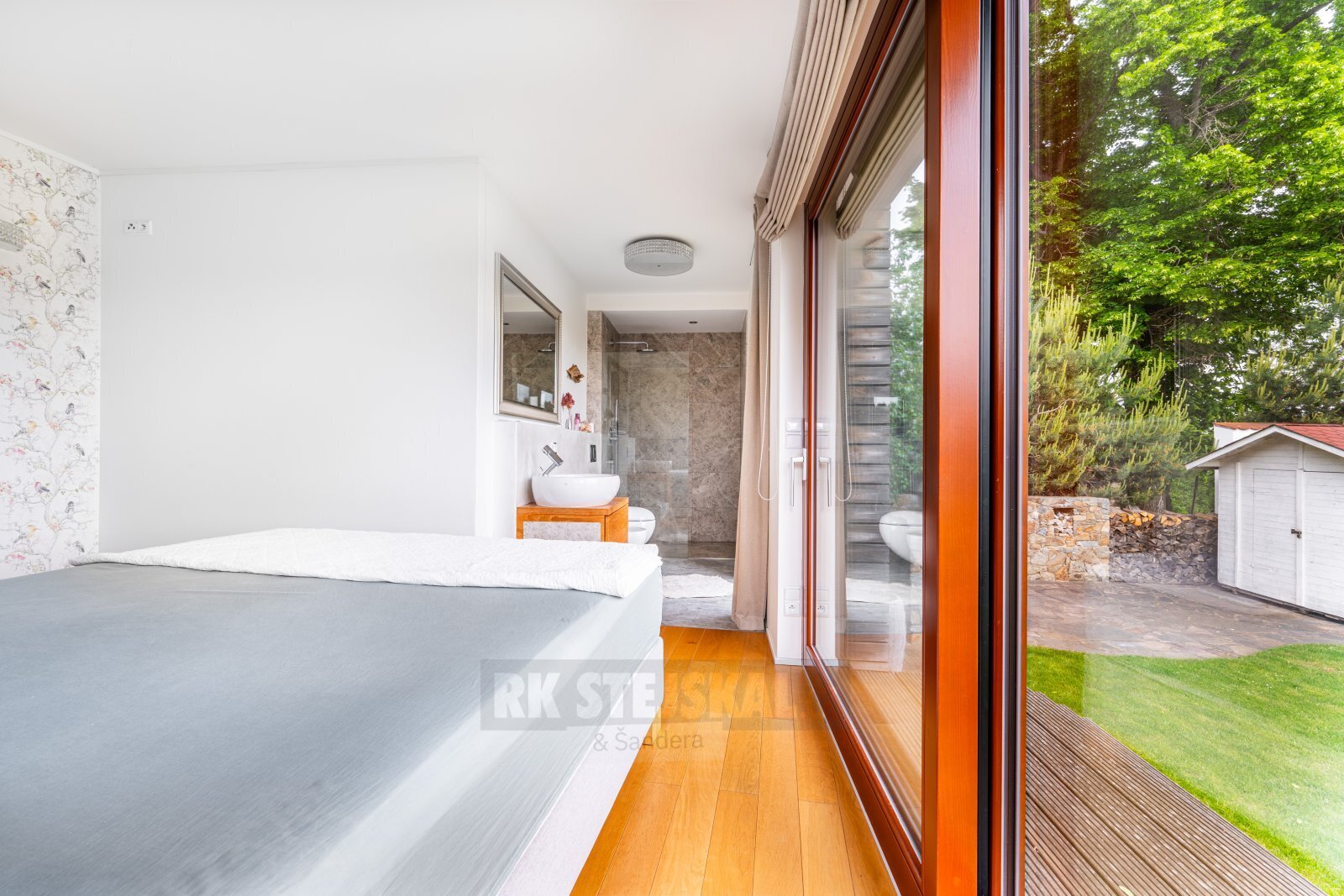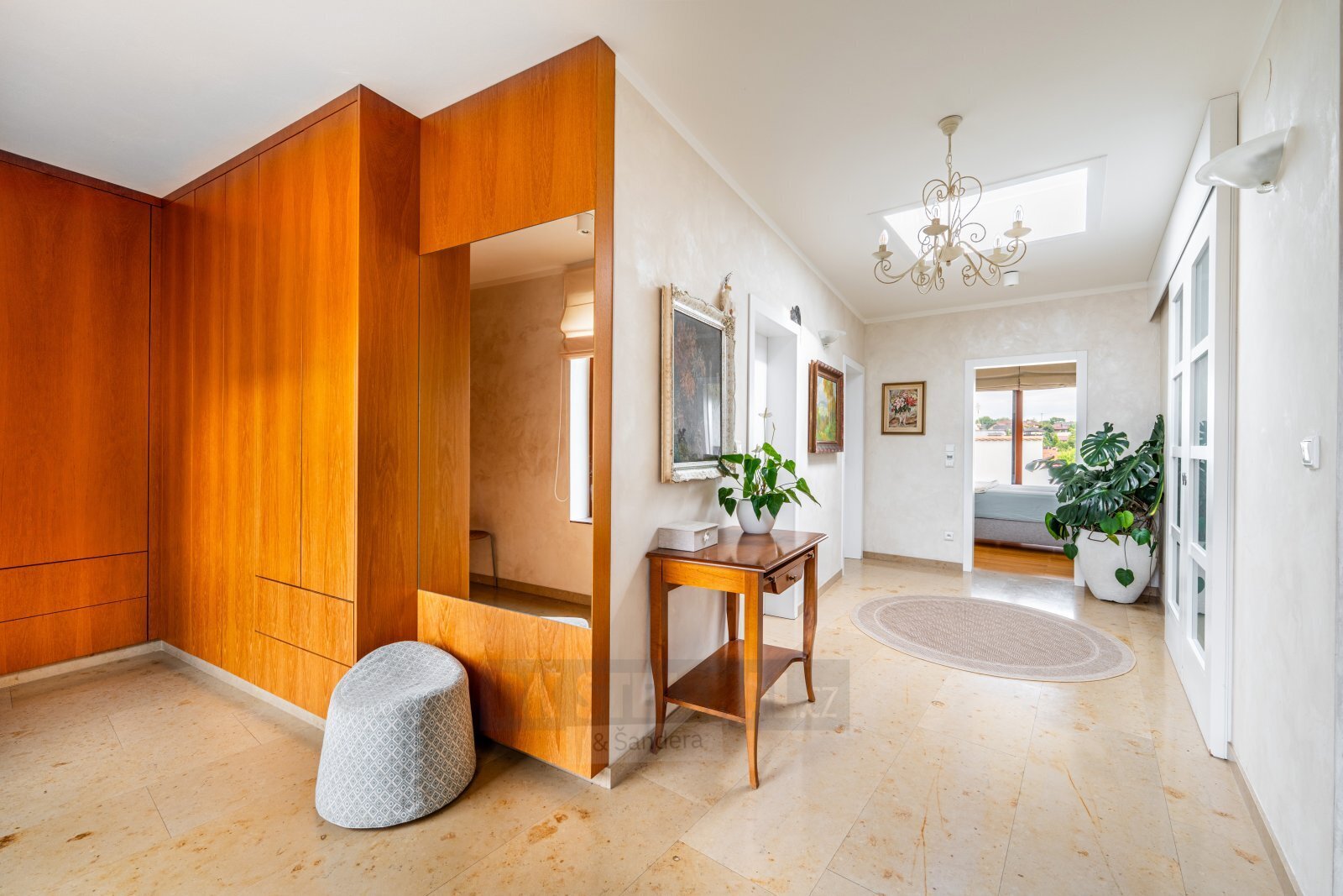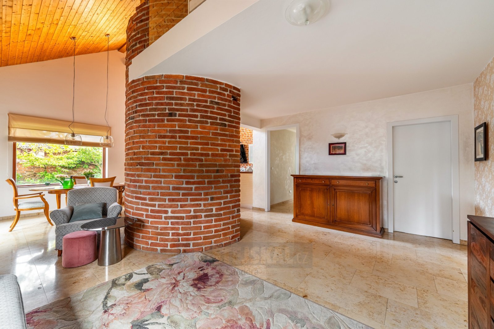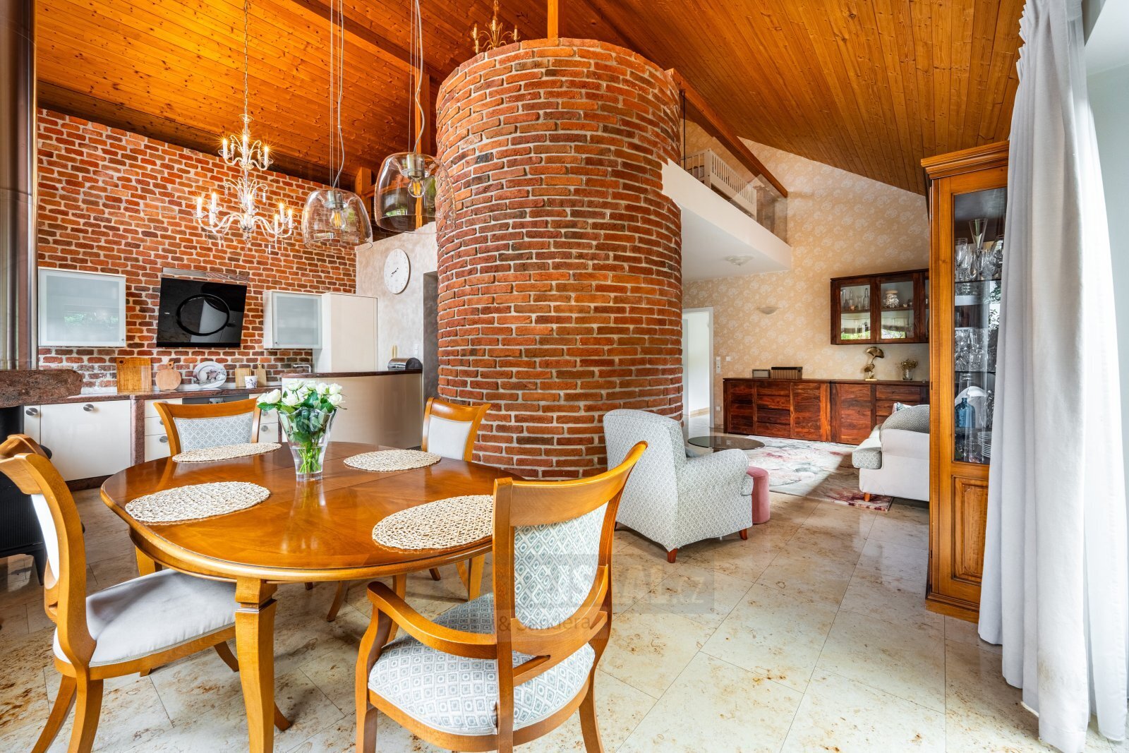 přízemí - prostorná vstupní místnost do L s vestavěnými skříněmi, technická místnost s el. kotlem zařízená a vybavená jako prádelna, dva samostatné dětské pokoje, prostorná ložnice s prosklenou stěnou do zahrady a s vlastní koupelnou, větší šatna s vestavěným šatním nábytkem, samostatná koupelna s vanou, umyvadlem, bidetem a WC, samostatný televizní a poslechový pokoj, velice prostorná, otevřená, hlavní obytná místnost, zde obývací část, jídelní prostor s proskleným vstupem do zahrady a na terasu se zařízenou pergolou, kuchyňský prostor s pultem, otevřený podhled do podkroví, schodiště do podkroví,