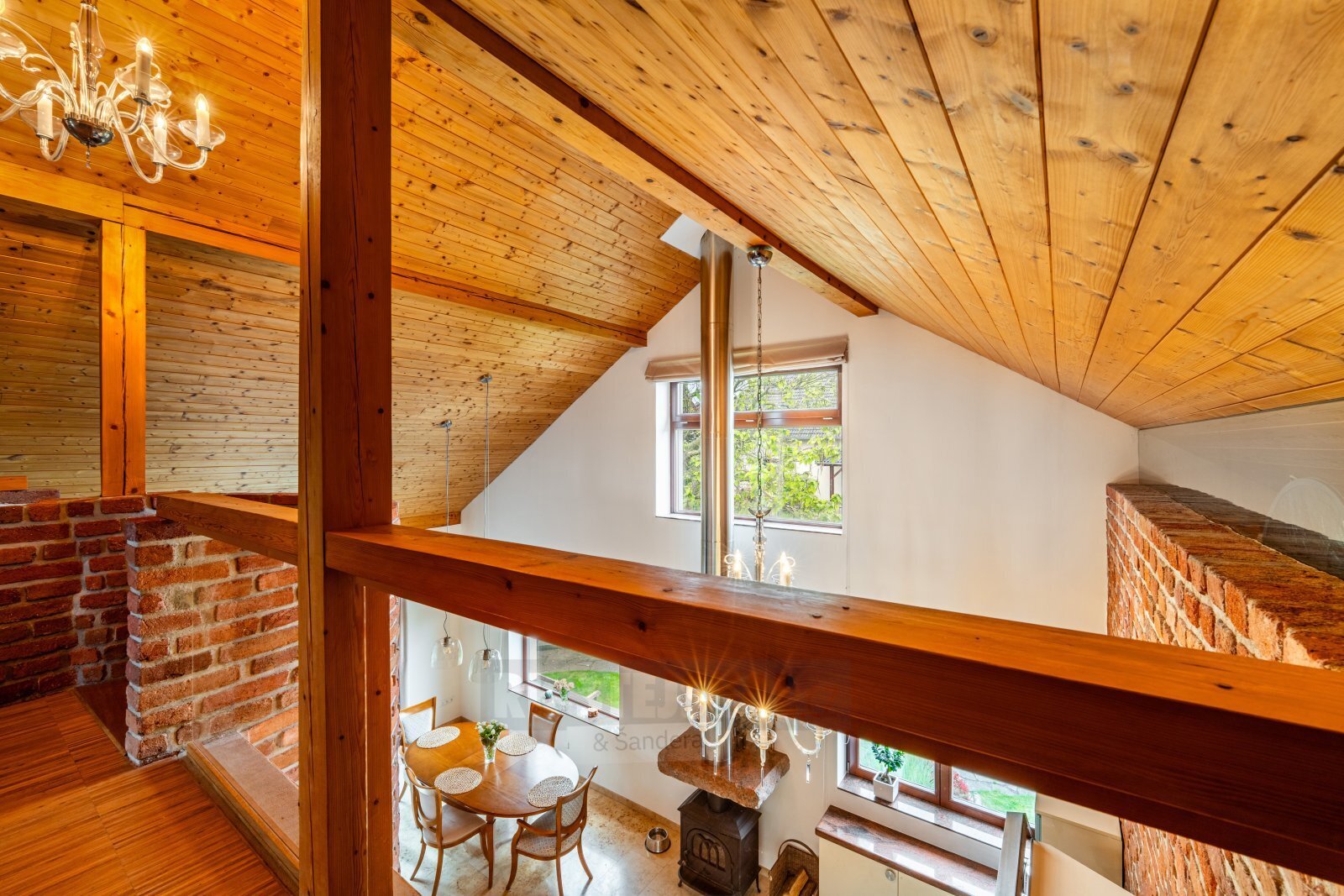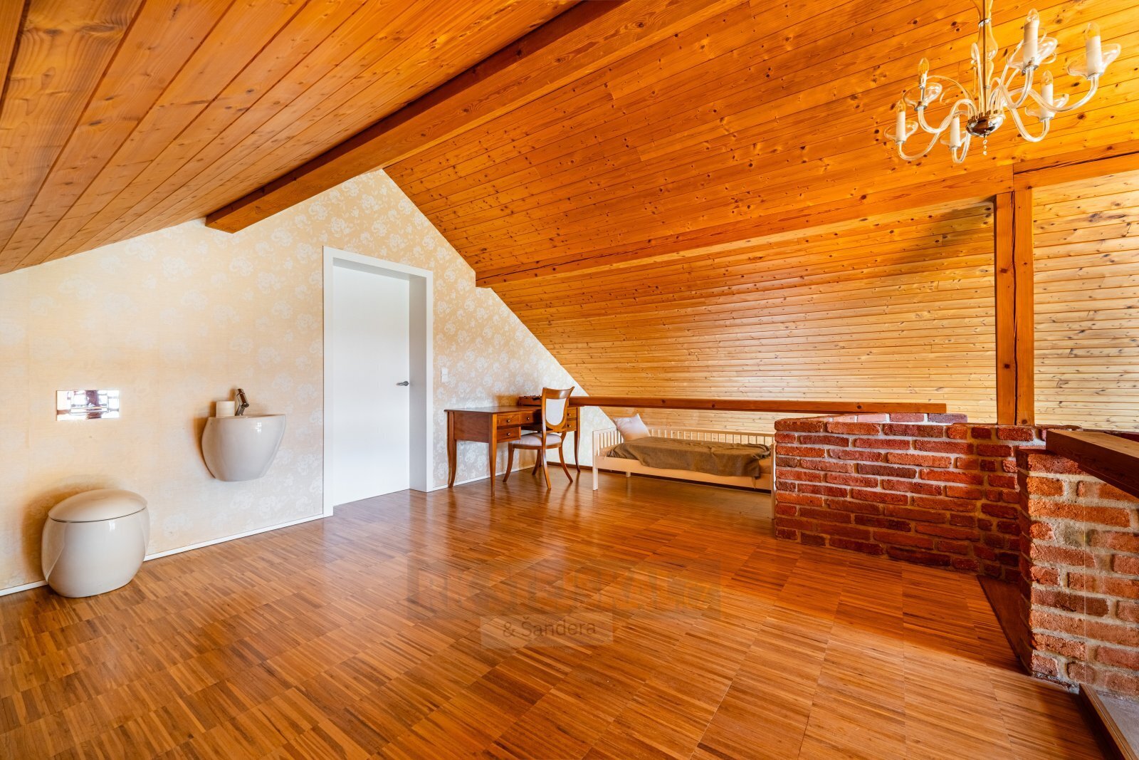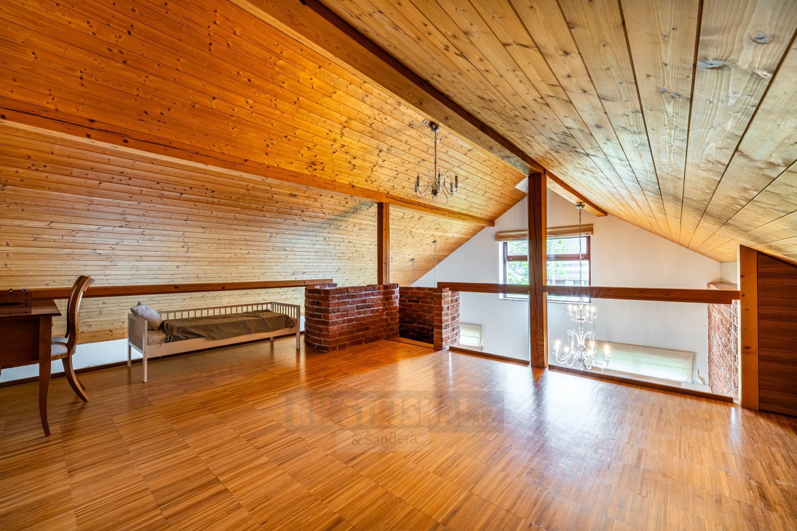 podkroví: prostorná obytná galerie (s WC a umyvadlem), větší pokoj se štítovým oknem,