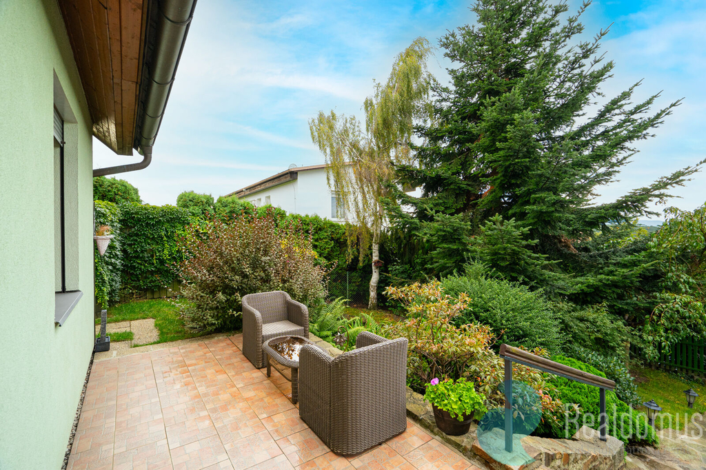 Nemovitost se nachází v klidné (slepé) ulici na Srubci na pozemku o rozloze 720 m2 a poskytuje 196 m2 užitné plochy (rozdělené do 2 pater), nádhernou vzrostlou zahradu s terasami a posezením a 2 parkovací místa.