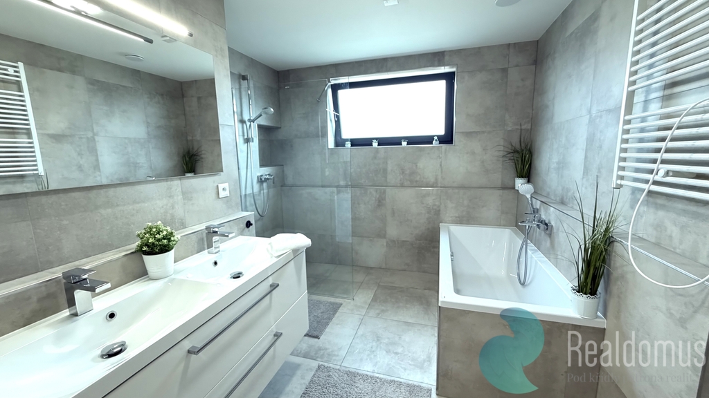 • Koupelna s vanou, sprchovým koutem a dvěma umyvadly