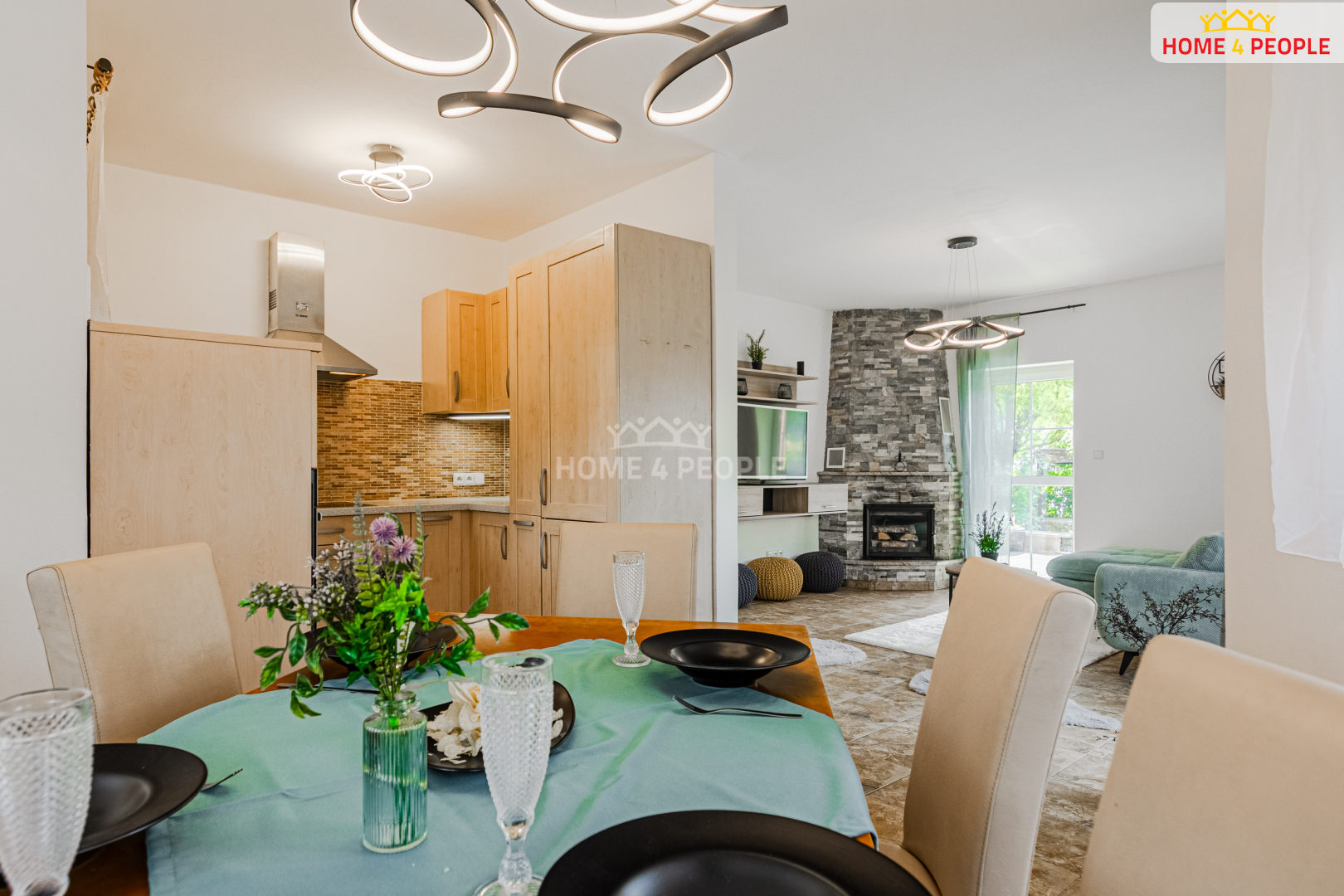 Dominantou domu je světlý a vzdušný interiér, kde každý detail byl pečlivě promyšlen. V obývacím pokoji najdete elegantní krb, který navodí příjemnou atmosféru během chladnějších večerů, a komfortní podlahové vytápění. Dvě velká francouzská okna propojují obývací prostor s krásnou, udržovanou zahradou a zajišťují dostatek přirozeného světla.