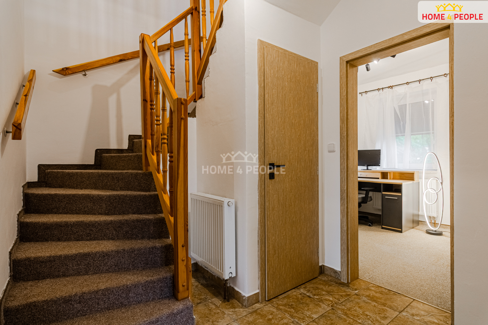 Kuchyně je plně vybavena moderními spotřebiči (myčka, trouba, sklokeramická deska) a navazuje na prostorný jídelní kout ideální pro rodinná setkání. V přízemí se dále nachází koupelna se sprchovým koutem, pracovna s kancelářským nábytkem pro pohodlnou práci z domova a praktická komora s přípojkou na pračku a sušičku.