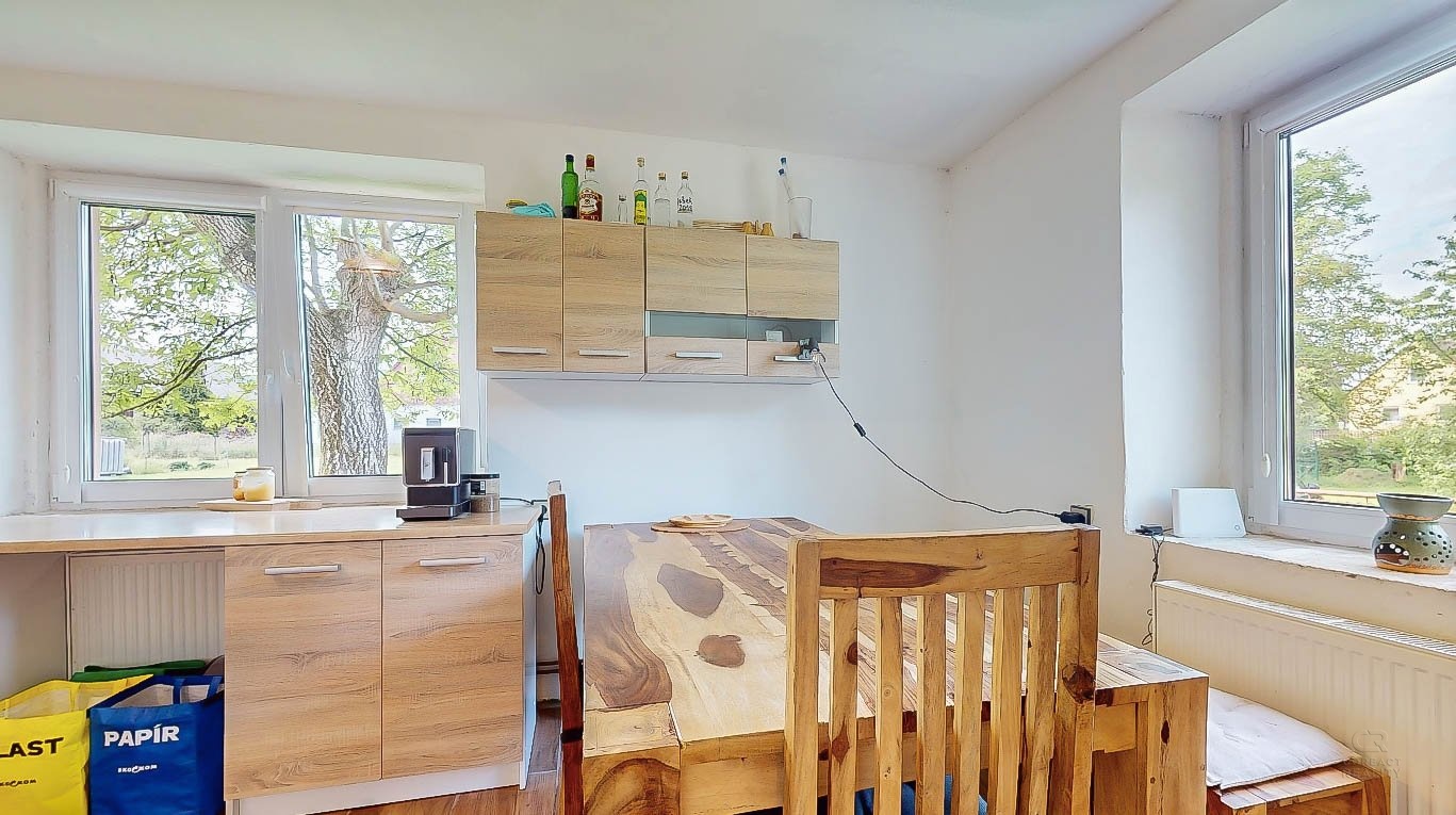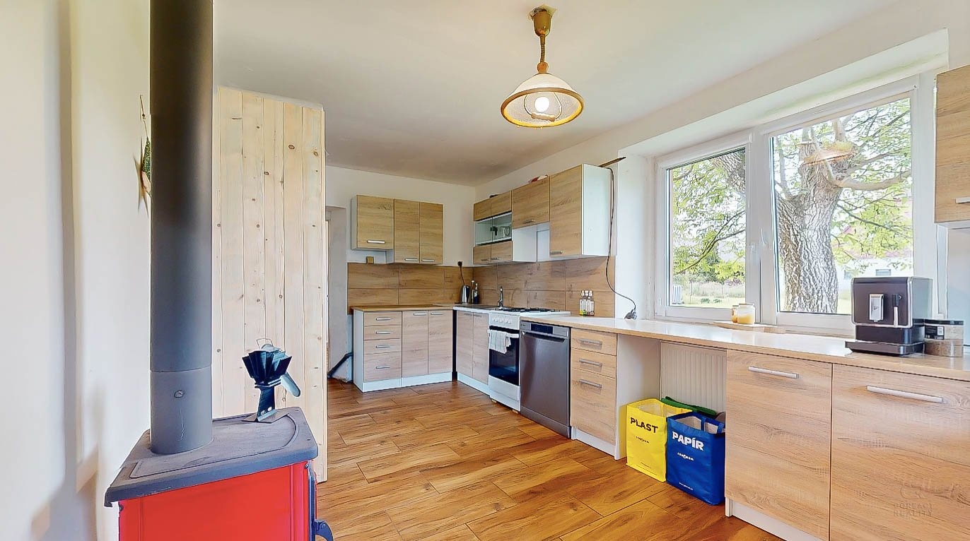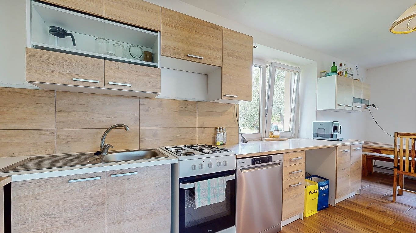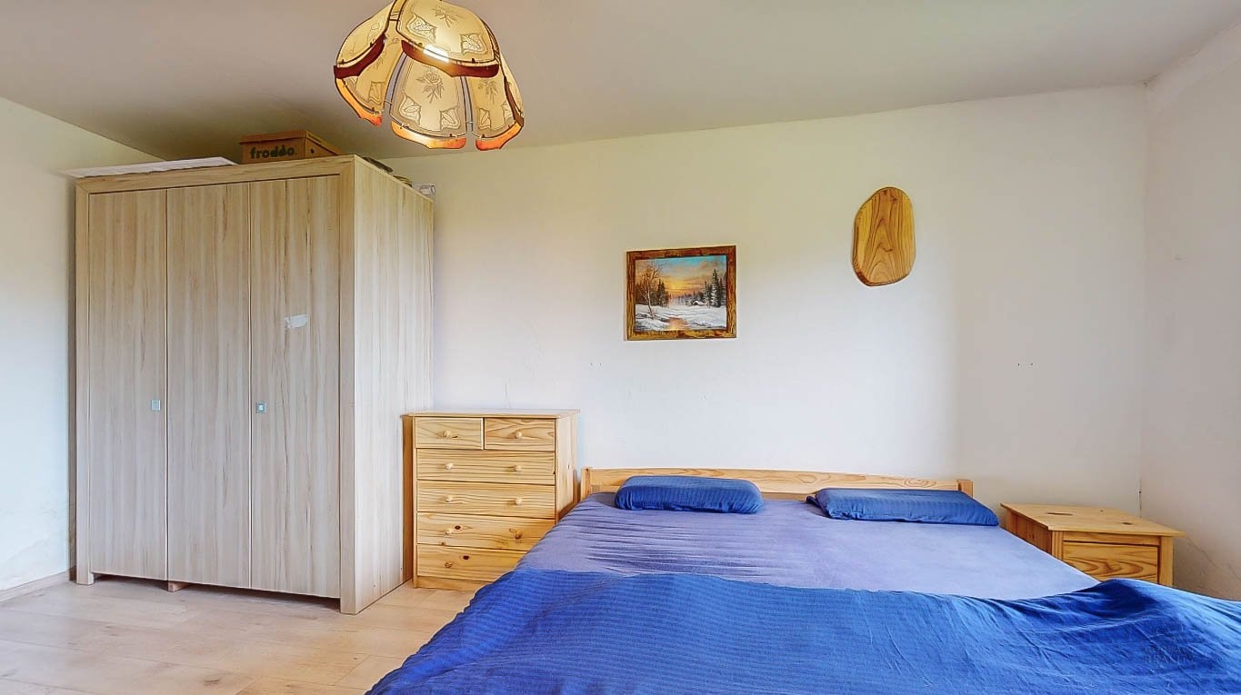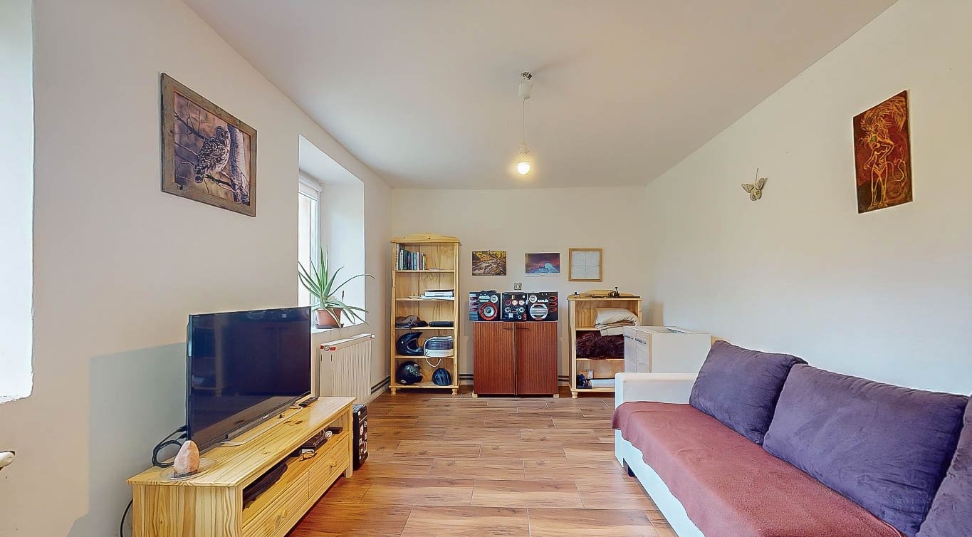 Dům je uzpůsoben pro bydlení tak, že v přízemí majitel vybudoval dispozici 2+1 se samostatnou toaletou, koupelnou a velkou chodbou. V patře jsou další dva pokoje, které je potřeba upravit dle vlastních představ a do těchto pokojů v patře se zatím vchází ze strany velké stodoly, která tvoří druhou část domu. Z chodby v přízemí se dá probourat stěna a za ní jsou již schody do zmíněných dvou pokojů v patře.