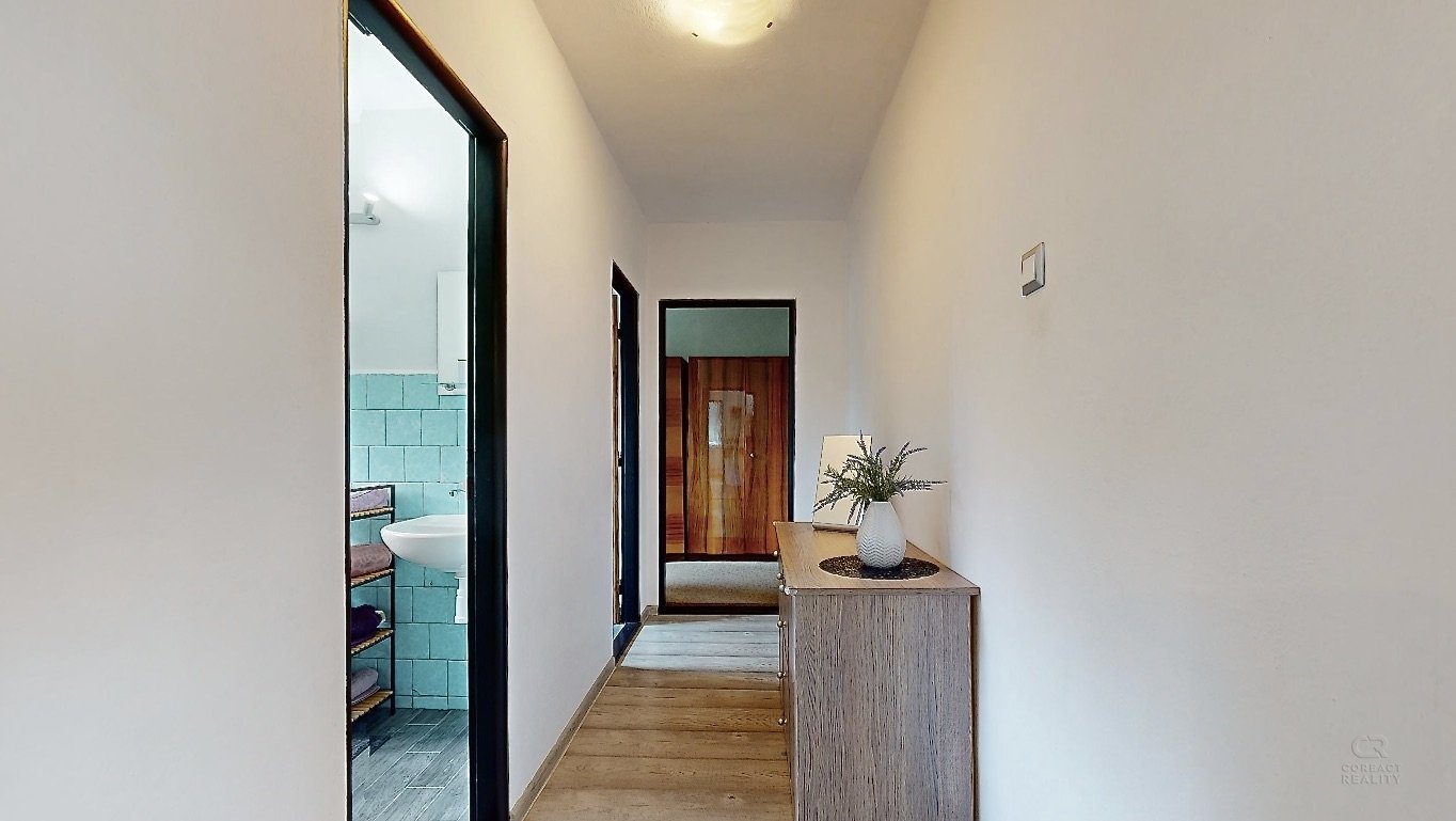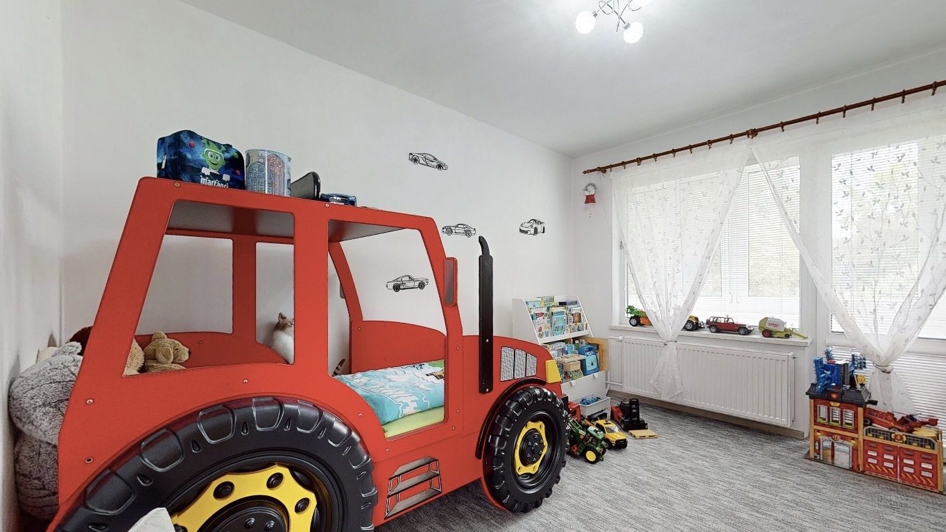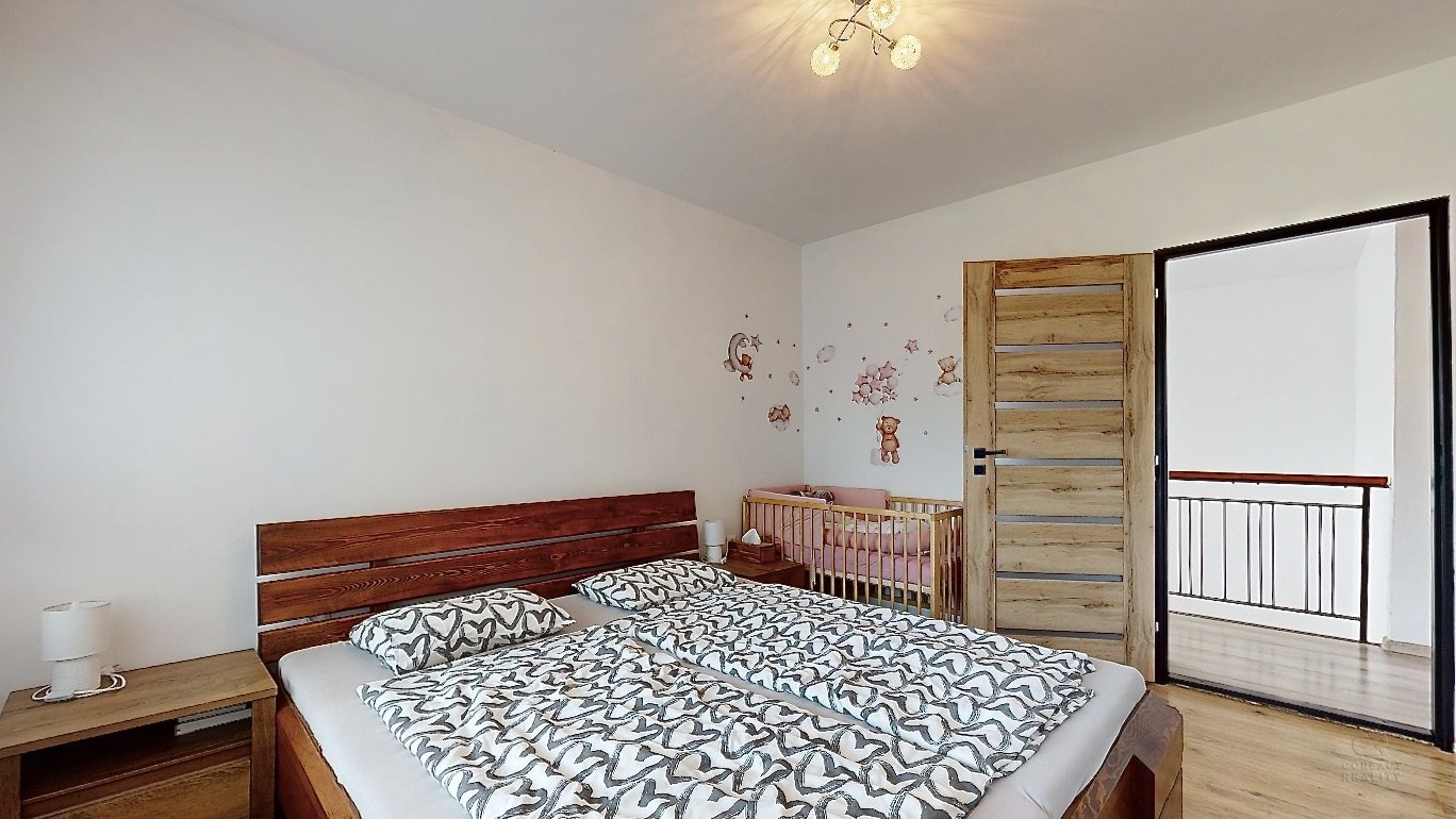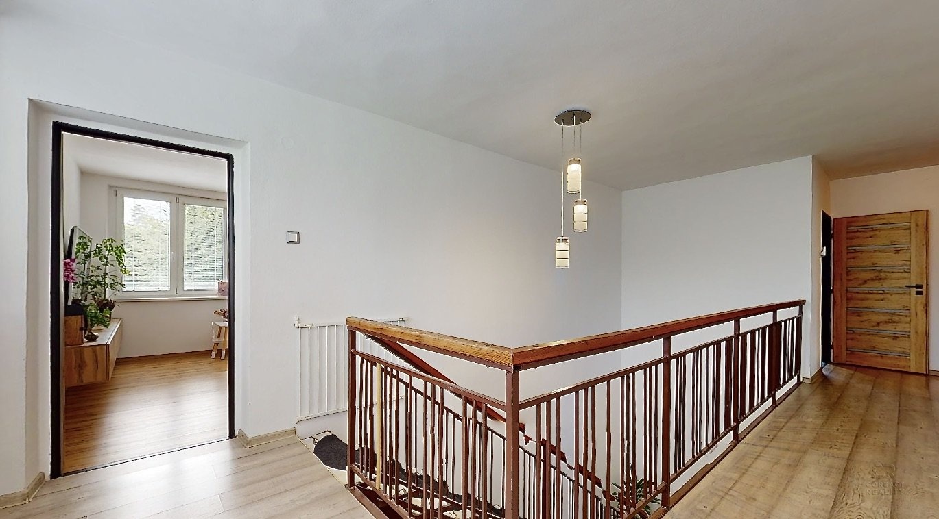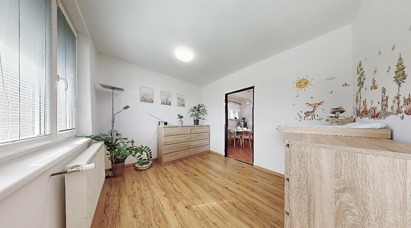 V patře domu je dispozice 3+1 - prostorný obývací pokoj, na který navazuje menší místnost, dále kuchyně, ložnice, dětský pokoj, koupelna, samostatná toaleta, šatna a spižírna v kuchyni.