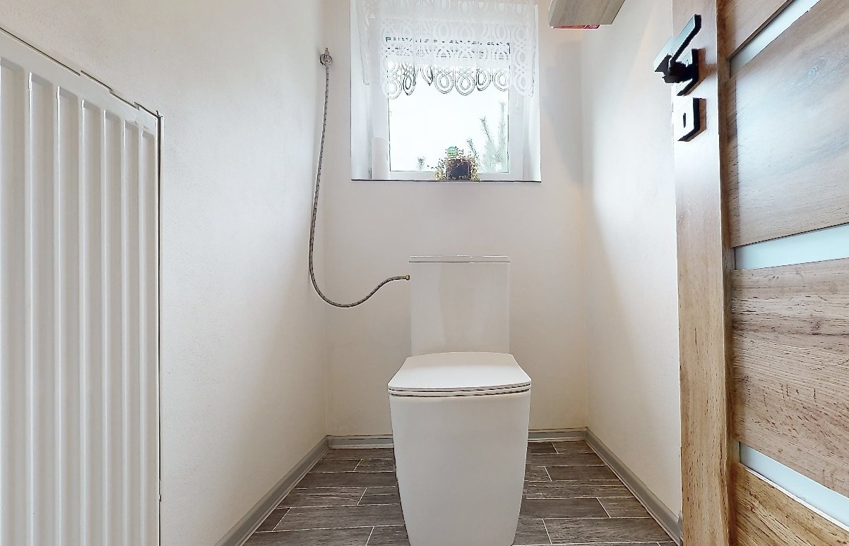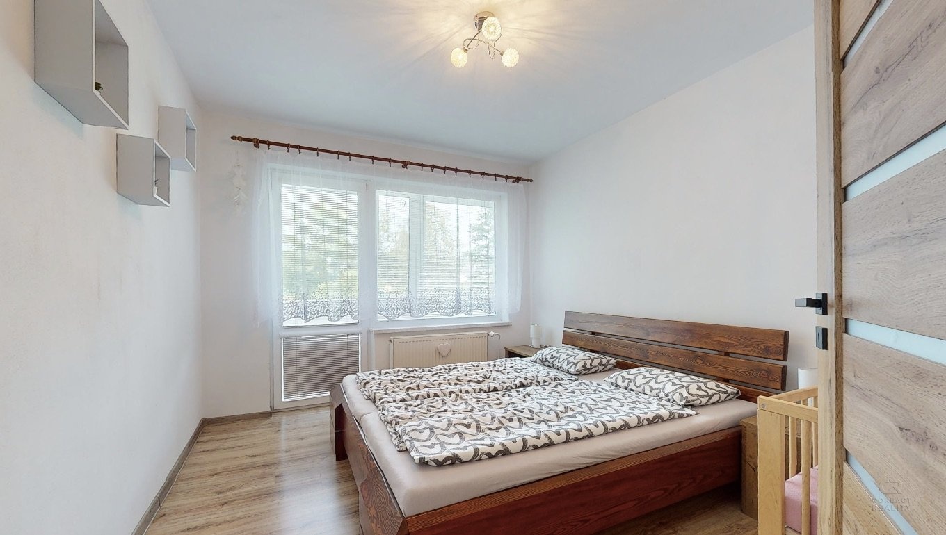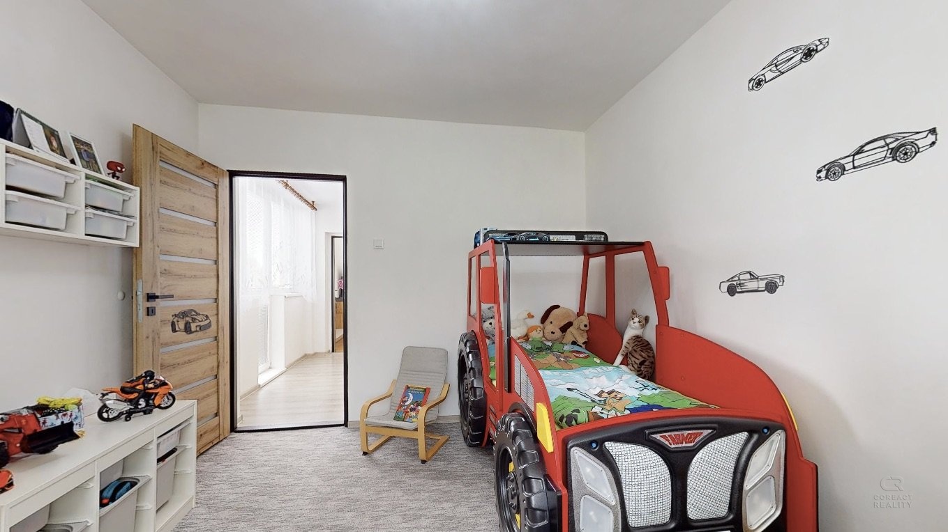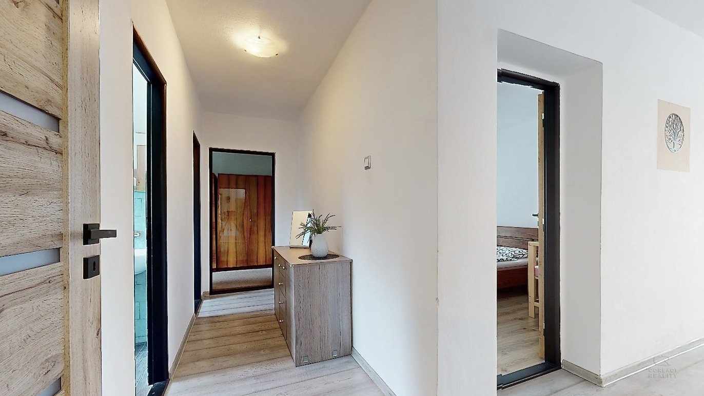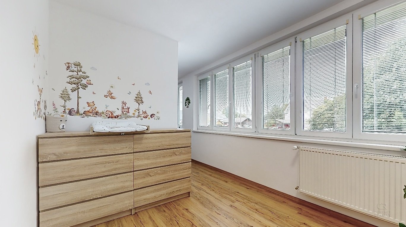 V patře domu je dispozice 3+1 - prostorný obývací pokoj, na který navazuje menší místnost, dále kuchyně, ložnice, dětský pokoj, koupelna, samostatná toaleta, šatna a spižírna v kuchyni.