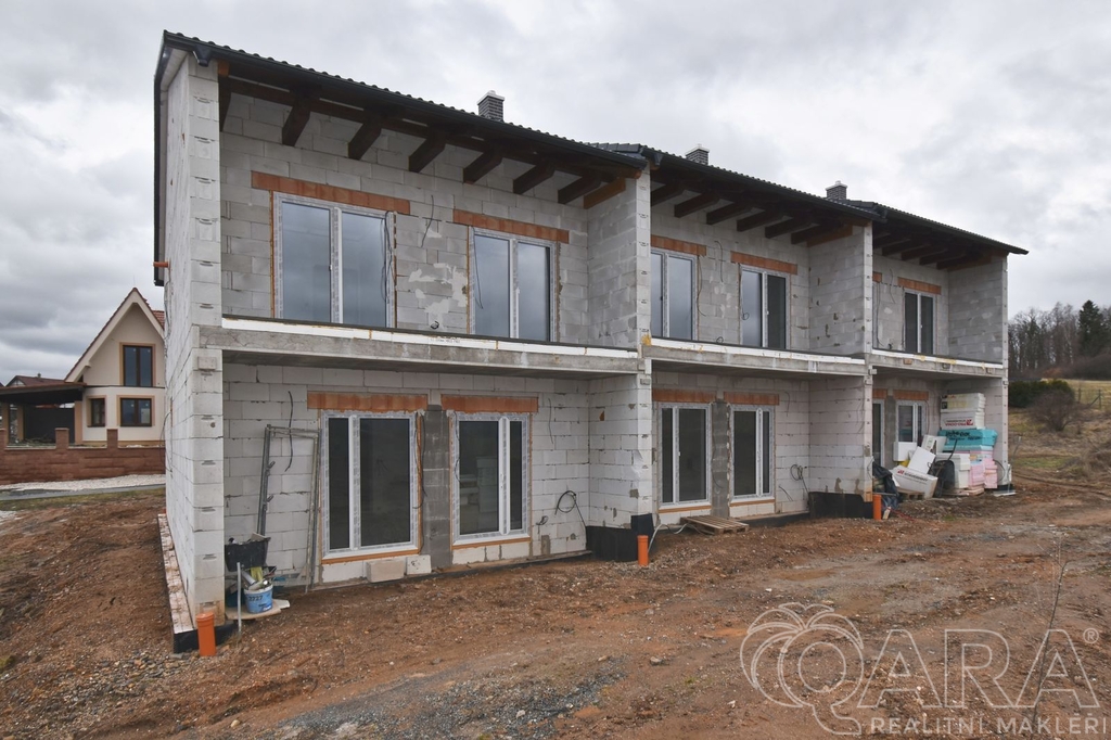 Na západním okraji nové zástavby ve Staré Huti s výhledem na Dobříš, najdete nový patrový dům, se třemi, stavebně oddělenými mezonetovými jednotkami. Dispozice u střední 5+KK, krajové potom 5+1, výměru podlahové plochy cca 133 m2 (definitní plocha bude zaměřena po dokončení vnitřních omítek) a navíc terasu v přízemí, dvě lodžie v patře, úložný prostor / případně ateliér na půdě, dvě parkovací stání a podíl na zahradě, předpokládáme cca 300 m2, po dohodě možné využití přilehlého pozemku zeleně. Energetická náročnost je prozatím stanovena na B. Nabízíme vám tak možnost se připojit k celé řadě spokojených obyvatel této nové části obce, jen několik kroků od lesů, rybníků a v příjemném prostředí k životu přitom s dobrou dostupností Prahy.