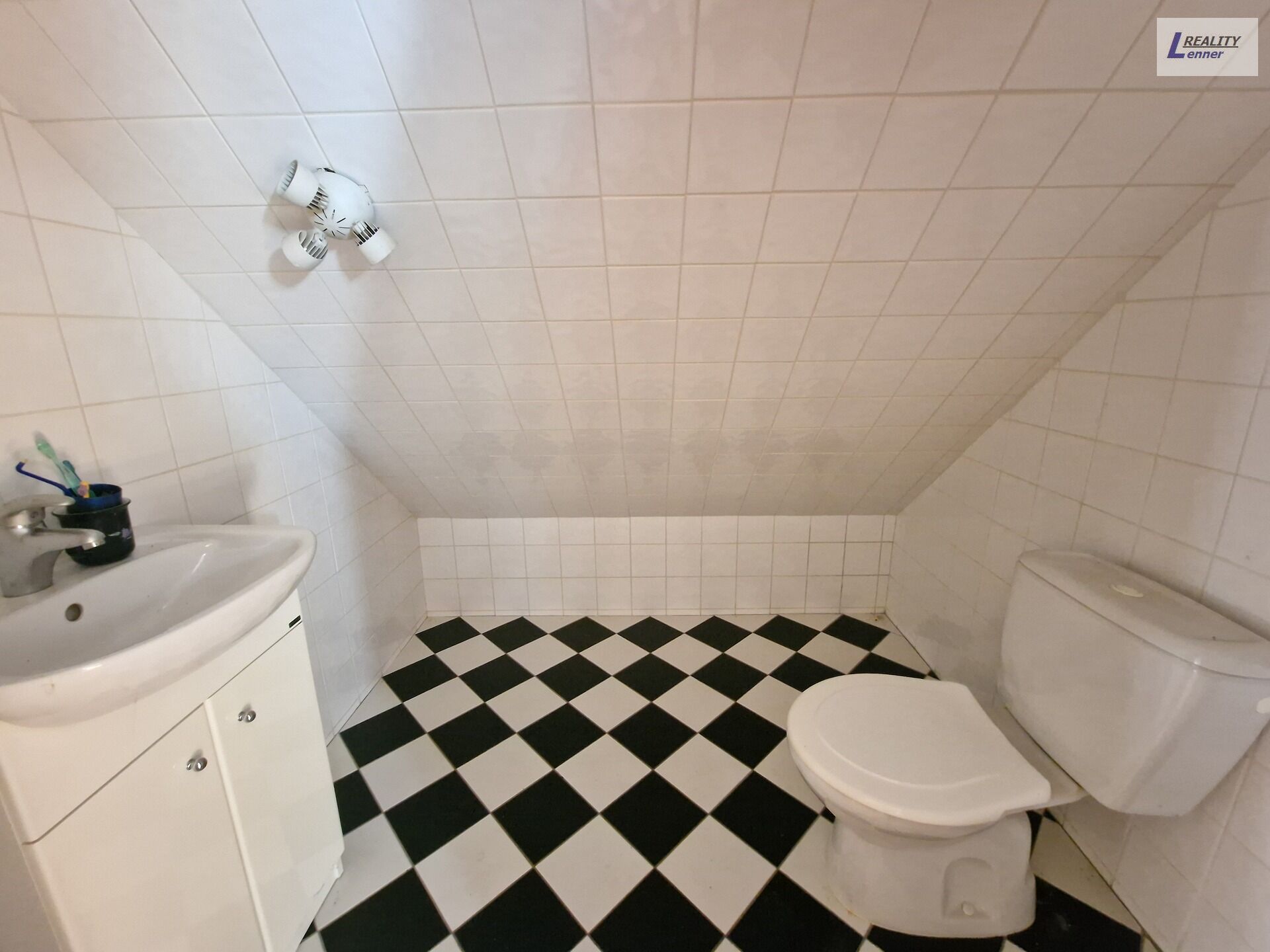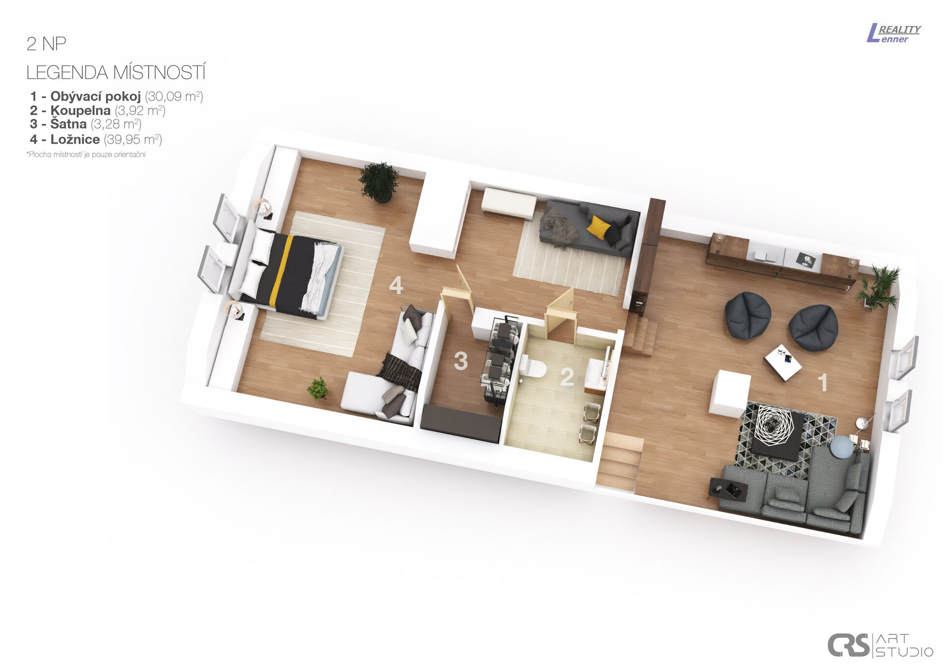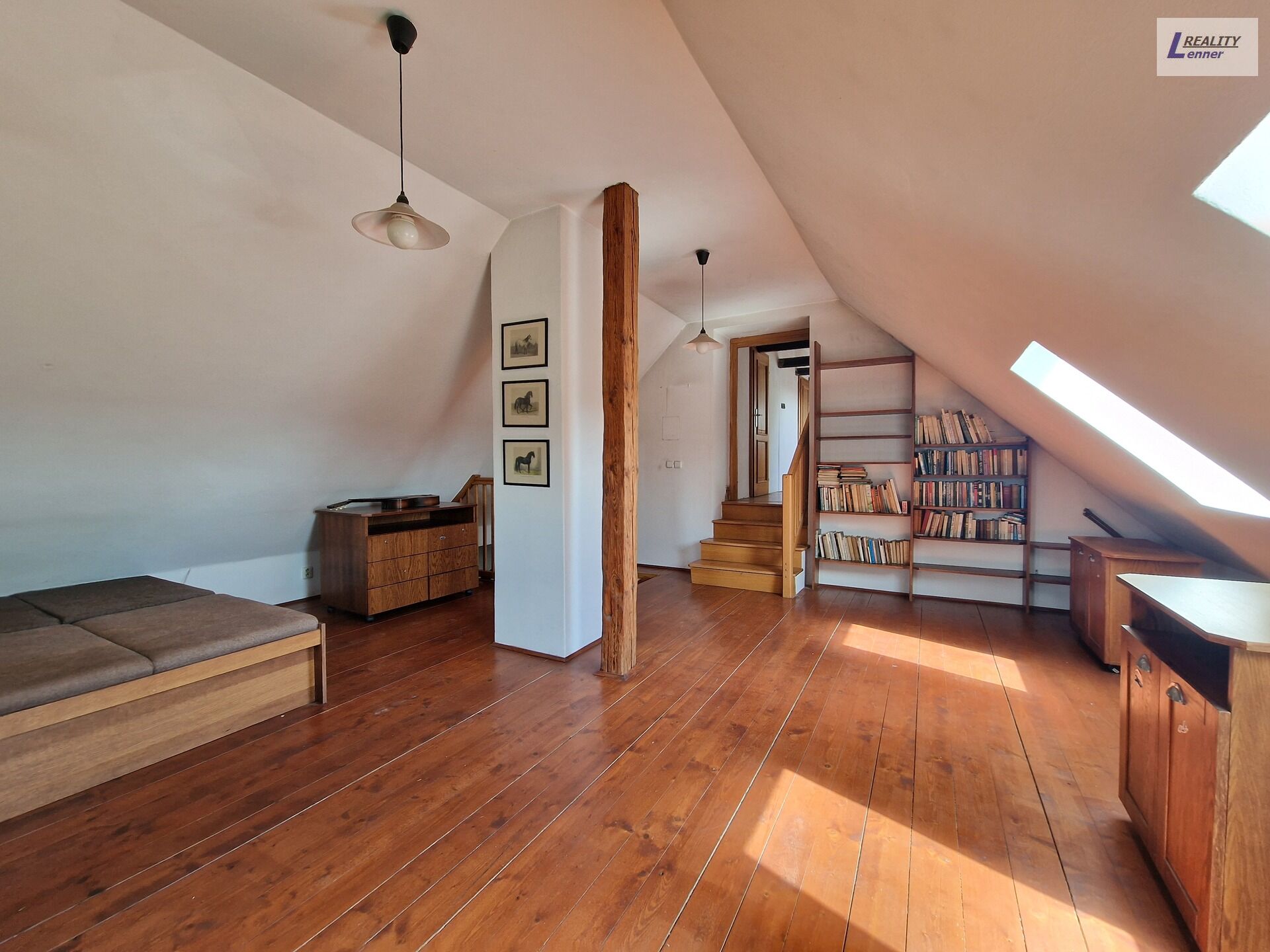 V podkroví přístupném po schodišti (masiv) z obývacího pokoje se nachází: velký pokoj, toaleta s umyvadlem, komora a prostorná ložnice.