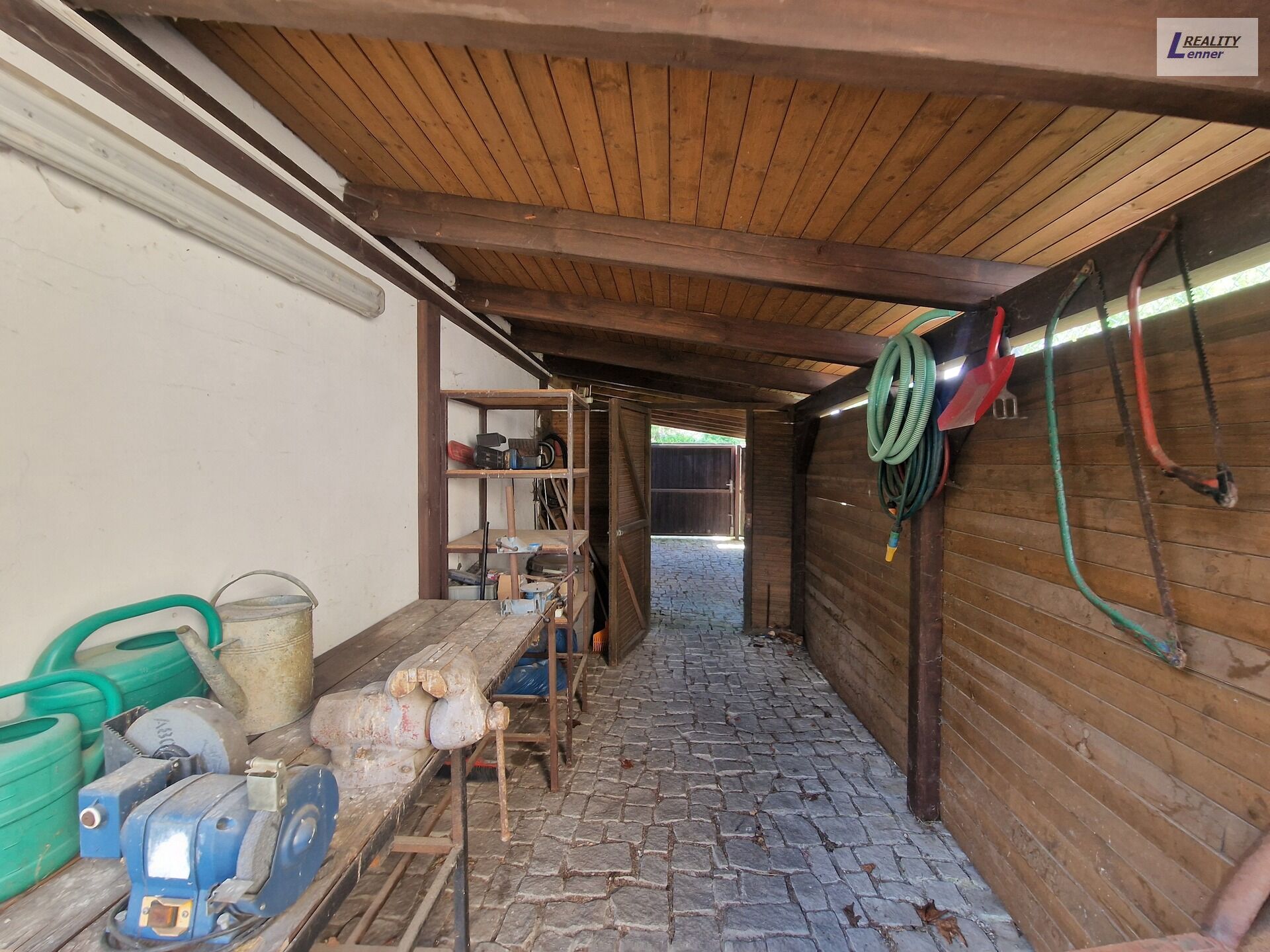 U domu kryté parkovací stání pro vozidlo, motorku atd., několik voliér pro ptactvo (koníček předchozího vlastníka), pergola s posezením, vykopané zahradní jezírko (k dokončení) a udírna.