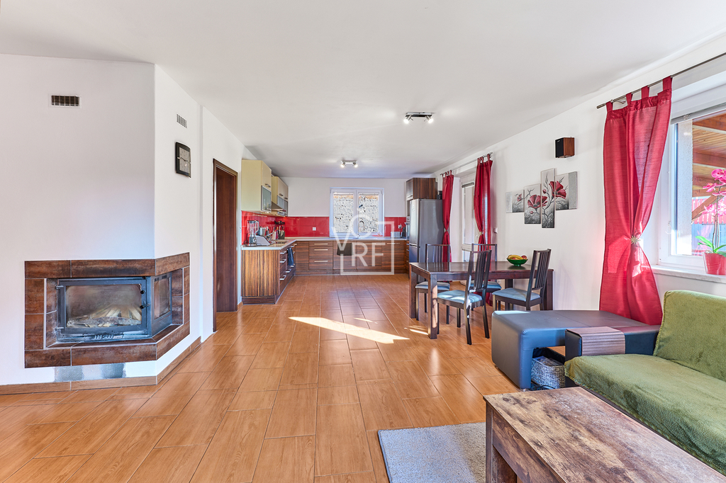 Přípojky: el.230/400V, voda a kanalizace obecní, další zdroj vody z vlastní studny, vytápění a ohřev TUV plynovým kotlem (v přízemí podlahové vytápění), dále lokální vytápění krbem na tuhá paliva, TV, net.