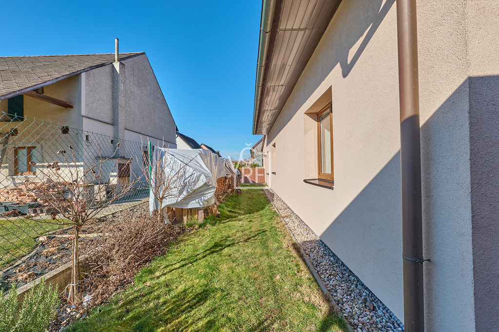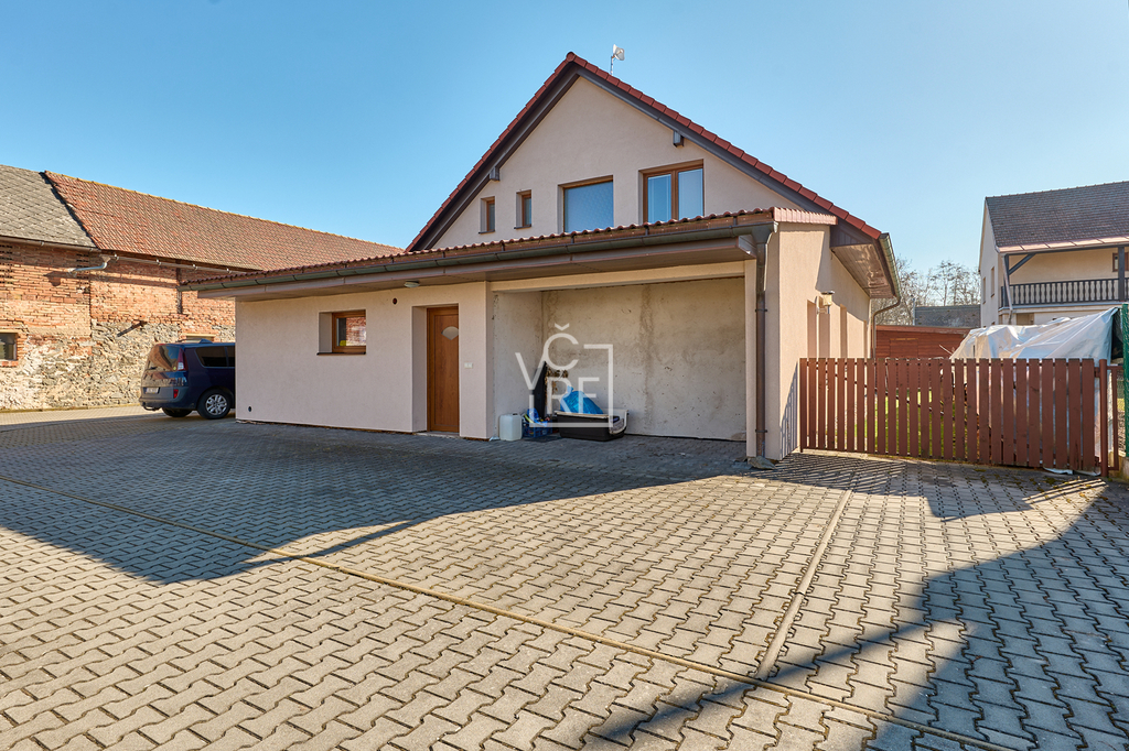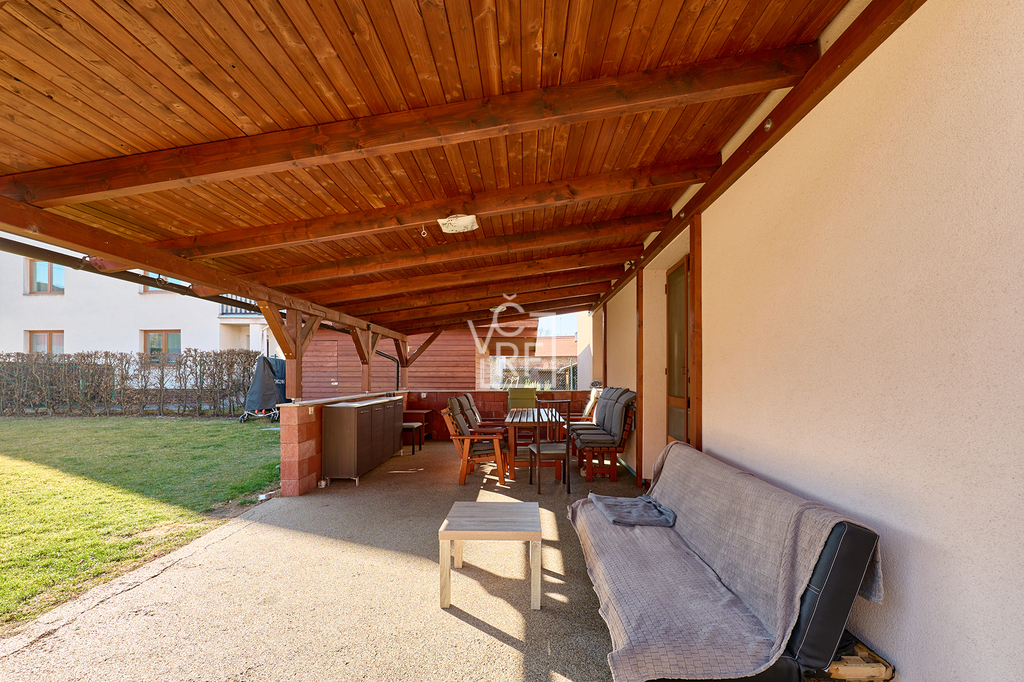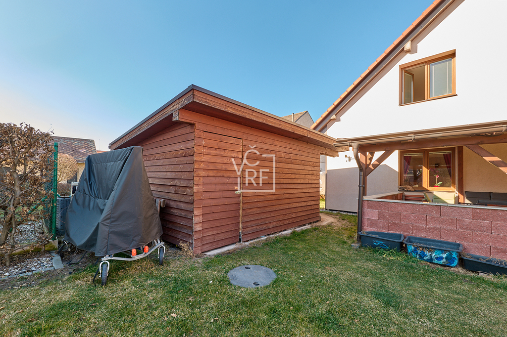 Na navazující upravené a oplocené zahradě se nachází krytá terasa, dřevník, retenční nádrž na dešťovou vodu a studna.