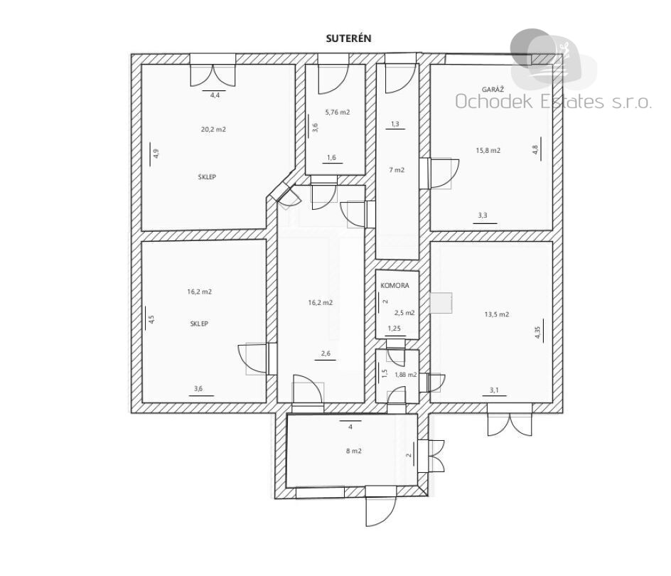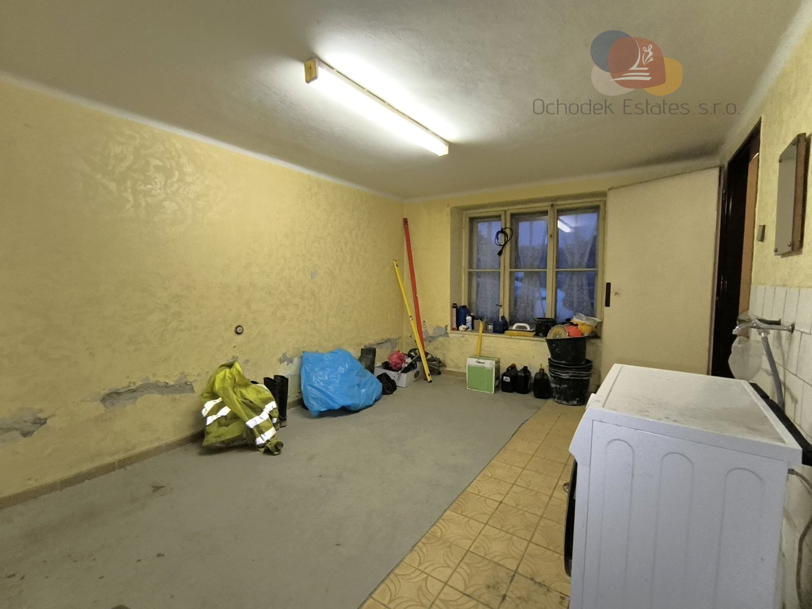 Poslední možností jsou dveře umístěné pod schody, které nás zavedou do prostorného suterénu. Suterén je opět rozdělen na několik menších místností a zároveň zde naleznete technické vybavení domu jako je plynový kotel, vodárna, bojler a další. Dále je zde přístup do garáže, která je přístupná přímo z ulice.