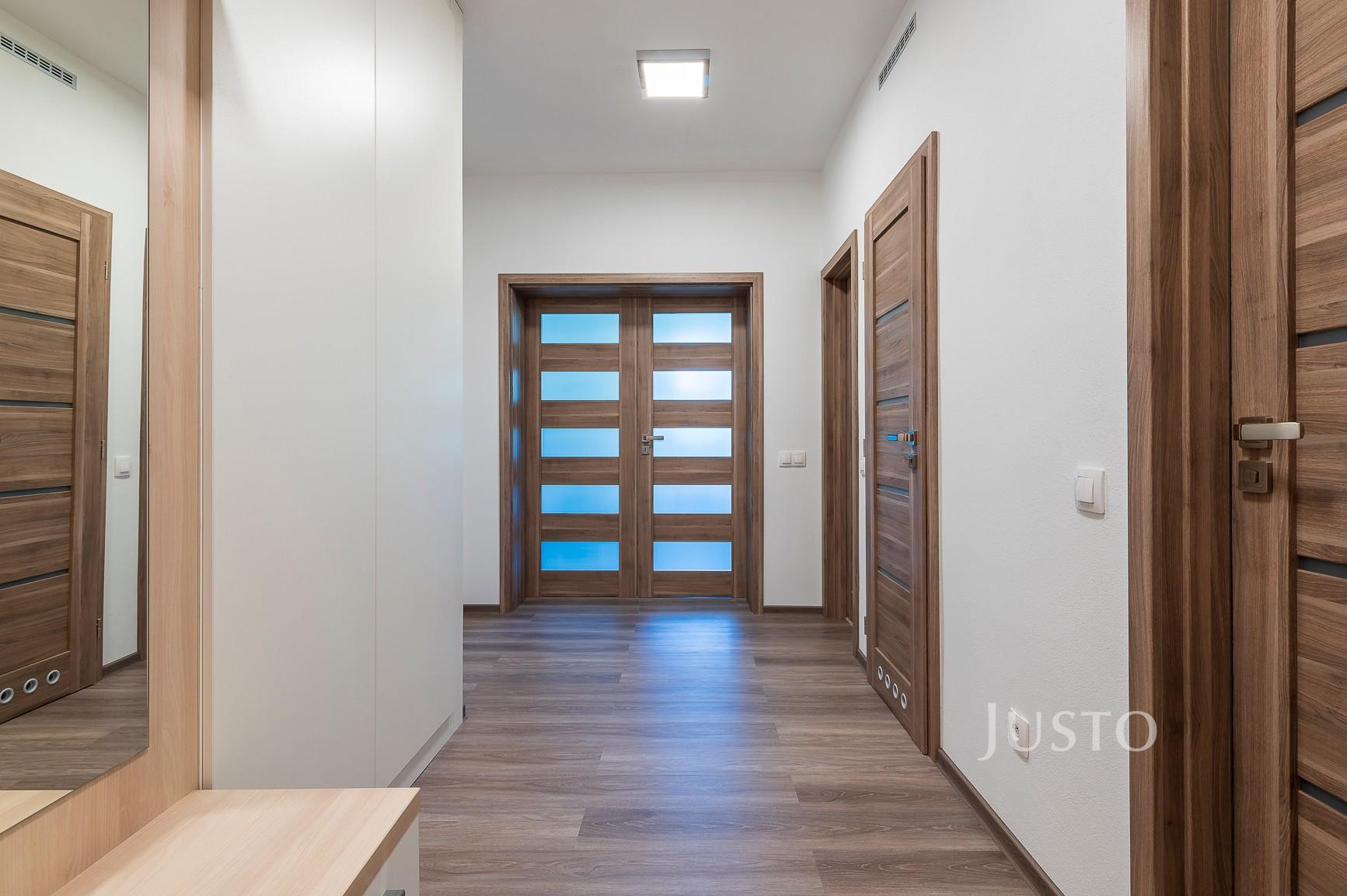 Chodba: Botník s věšákovou stěnou se zrcadlem a velká šatní skříň s obrovským úložným prostorem.