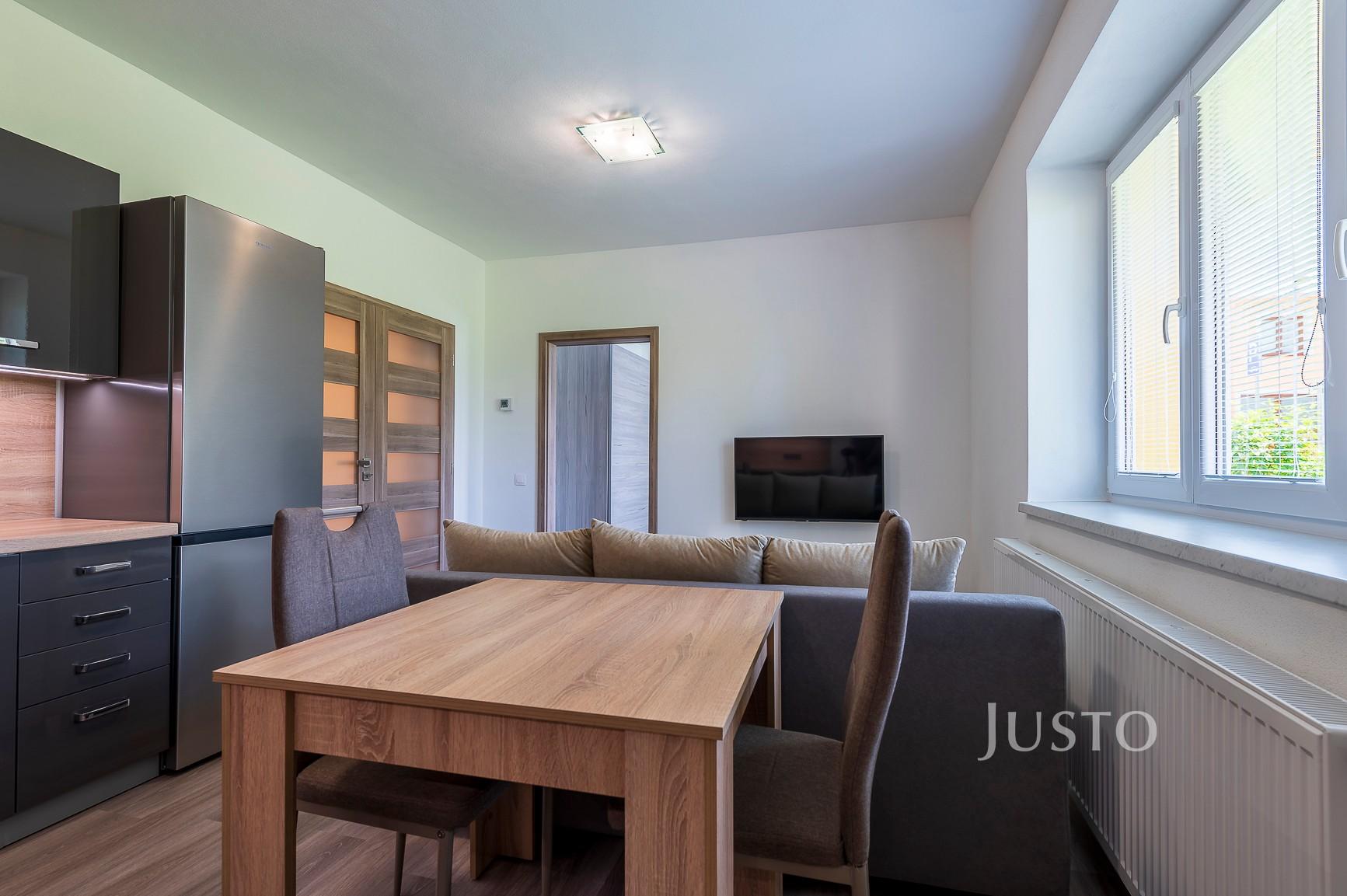 Kuchyně: Kuchyňská linka s vestavěnými elektrospotřebiči značky Gorenje (indukční varná deska, elektrická trouba a digestoř), mikrovlnná trouba značky Beko a lednice s mrazákem značky Gorenje. V kuchyni je také jídelní stůl, dvě židle, sedací souprava, konferenční stolek, stolek pod televizí a televize JVC.