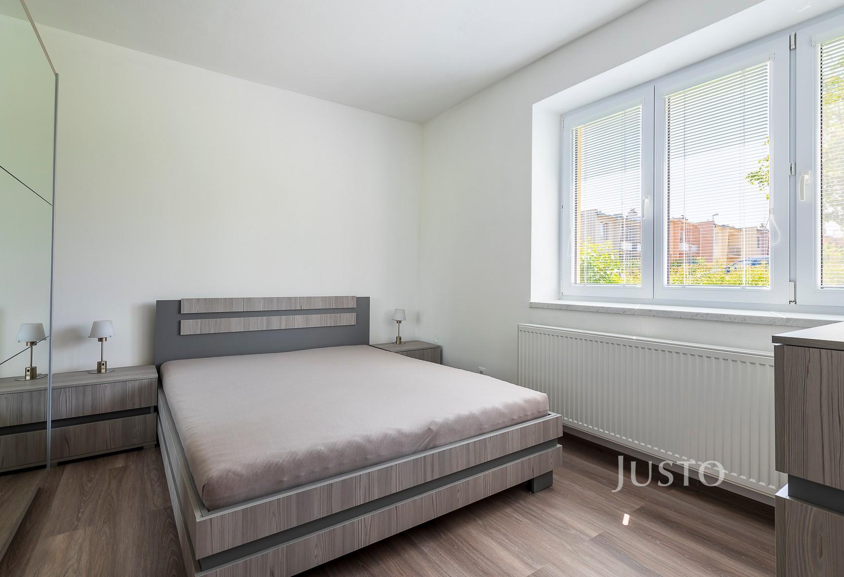 Ložnice: Velká manželská postel s dvěma nočními stolky, komoda a prostorná šatní skříň se zrcadlem.