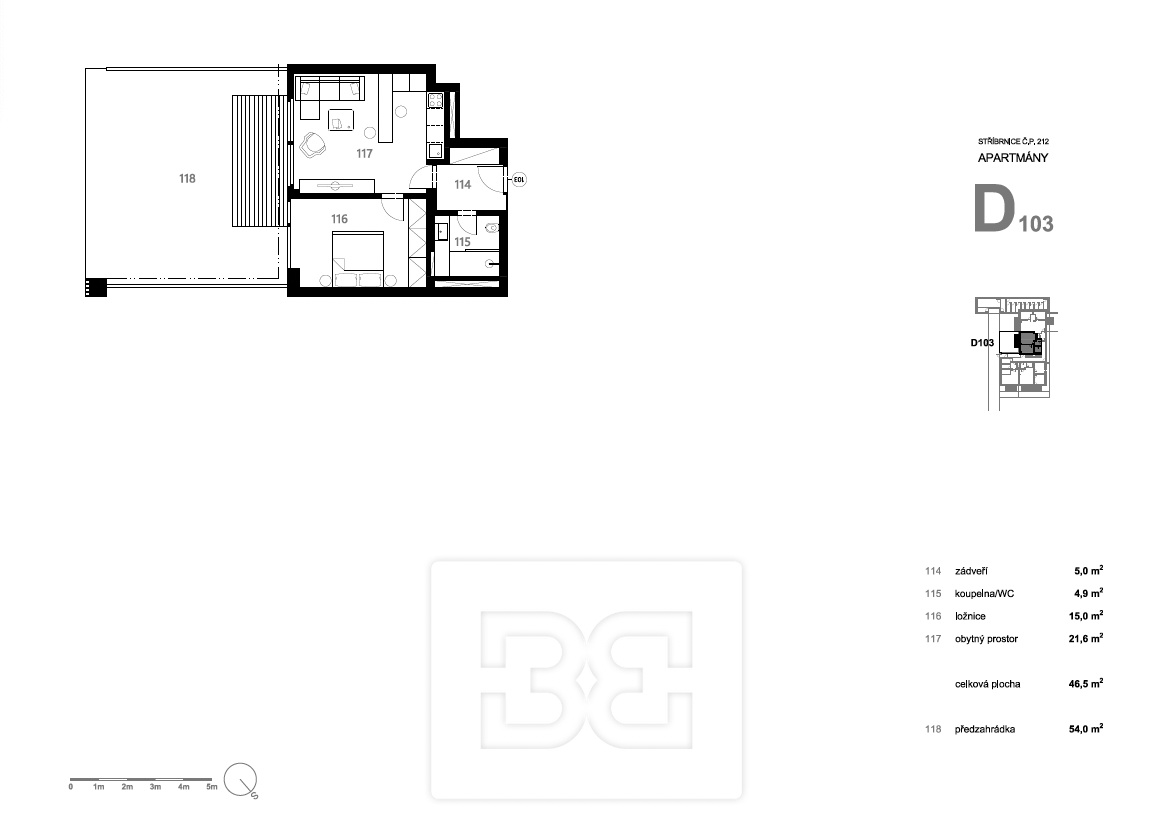 Tato konkrétní dvou podlažní jednotka se nachází v 1.nadzemním podlaží v části D, s označením D.103, má celkovou plochu 46,50m2 s předzahrádkou o ploše 54m2. V ceně je sklepní kóje a jedno venkovní parkovací stání. Cena je uvedená bez DPH (21%).