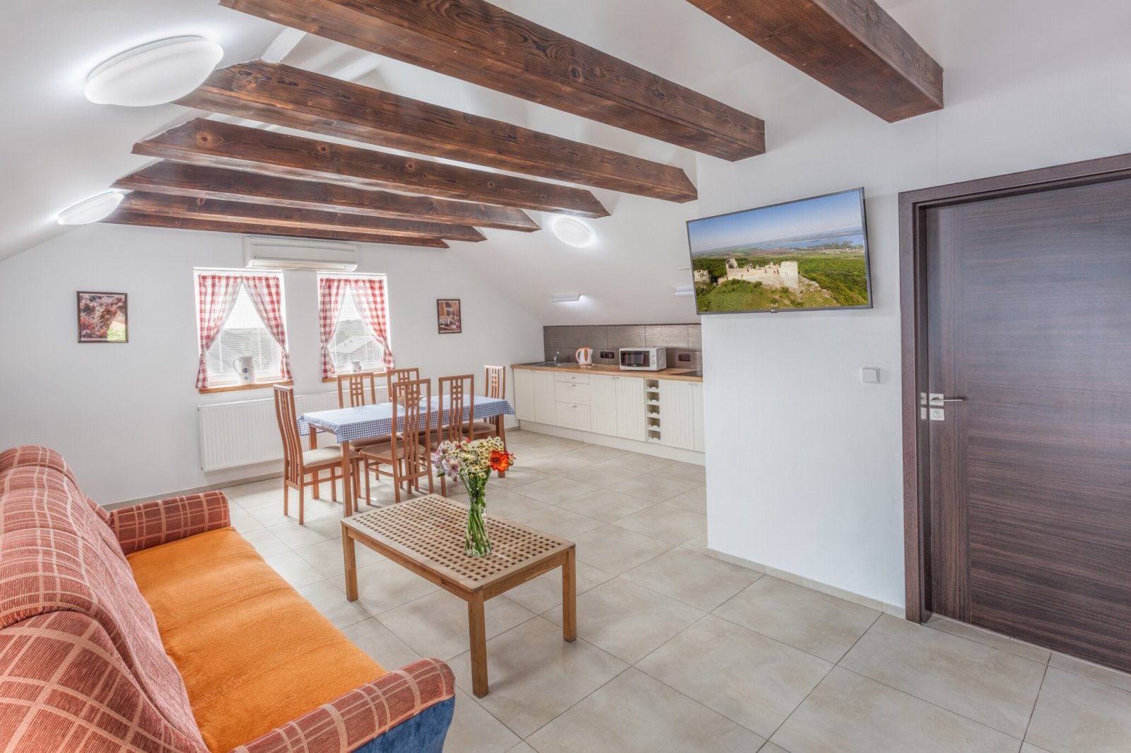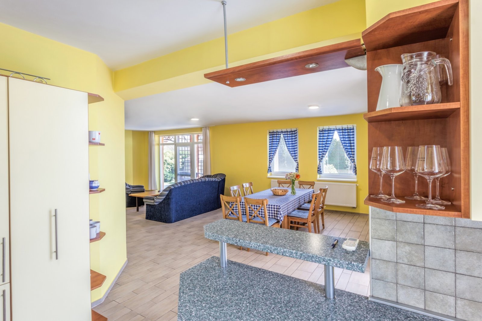 Kuchyňská linka je vybavena vestavěnými spotřebiči (plynová varná deska, digestoř, elektrická trouba, myčka). K topení lze použít plynové kamna, klimatizaci nebo interiérový krb.