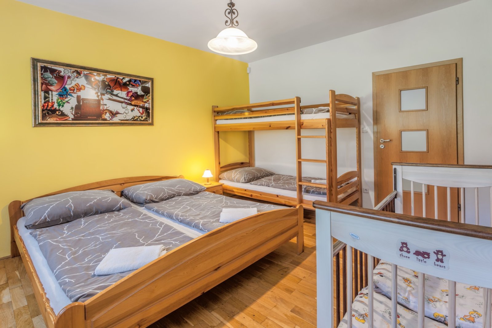 Rodinný dům: předsíň, toaleta, chodba, tři neprůchozí pokoje, koupelna (s rohovou vanou, sprchovým koutem i WC), prostorný obývací pokoj s jídelnou, kuchyň a terasa.