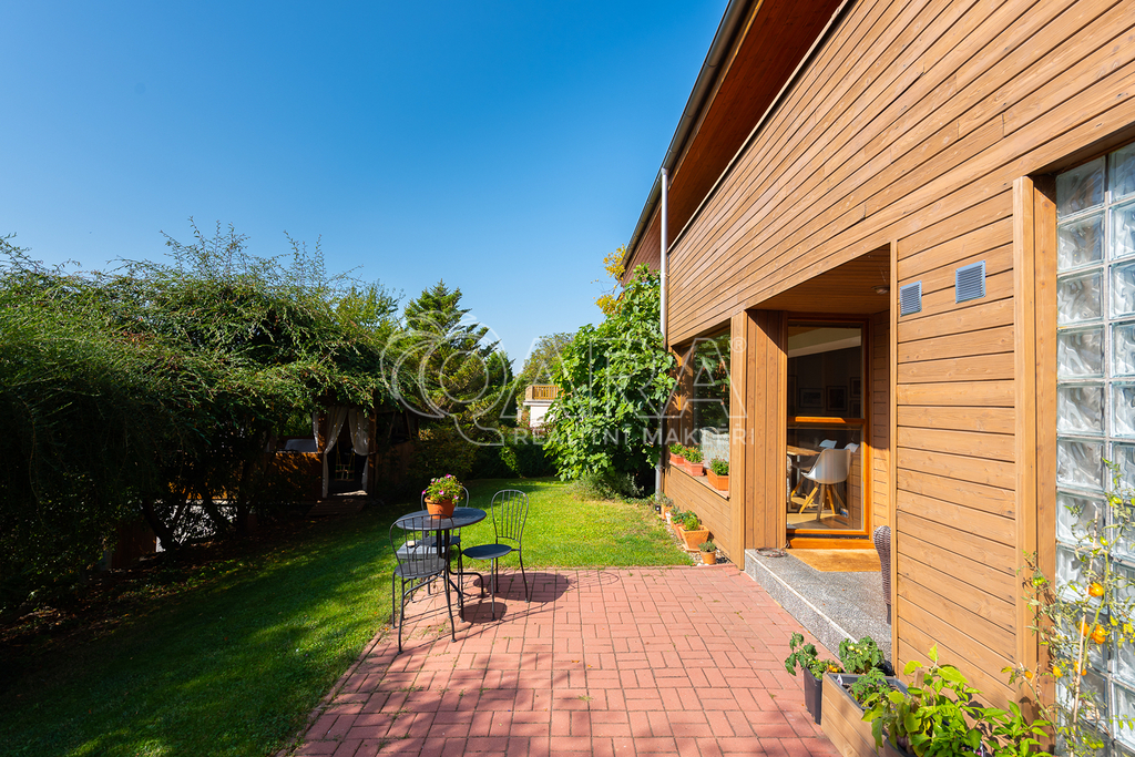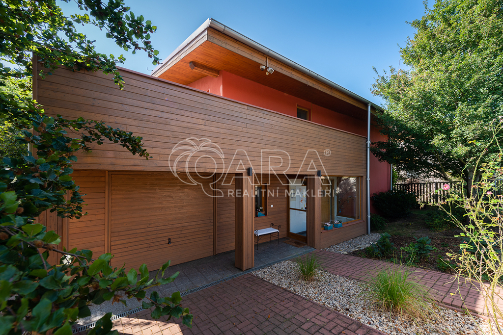 Dvoupodlažní dům 5+kk s garáží je charakteristický použitím přírodních materiálů a propojením se zahradou, která nabízí žádané soukromí. Důležitou součástí domu je rozlehlá terasa navazující na téměř všechny místnosti ve druhém podlaží. Díky krásnému výhledu na údolí je ještě umocněno všudypřítomné spojení s přírodou.